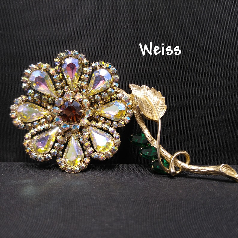 Before Albert Weiss founded his own costume jewelry company in 1942, he learned the tricks of the trade as a designer for Coro in the 1930's. Weiss excelled at floral and figural brooches and earrings. The company also made numerous styles of bracelets and necklaces. Although Weiss would never get as big as Coro and ceased operations altogether in 1971, business was good enough in the 1950s and ’60s that the company had to contract with Hollycraft to fill its orders. Weiss is perhaps best known for its use of smoky rhinestones. The company was also one of the first to use Swarovski's polychromatic aurora borealis crystals, which were created with Dior in the 1950s. Earrings and pins in its Skyline brand are comparable to those in the Eisenberg Ice line.