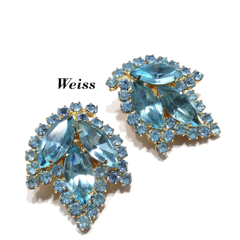 The rhinestones in a Weiss piece are strikingly beautiful. The Weiss items are usually signed with a raised oval cartouche with WEISS stamped inside which is on the back of the jewelry and the earrings are usually signed on the clip backs. There are exceptions as many of the Weiss pieces were unsigned due to the hallmark being placed on one item in a set.