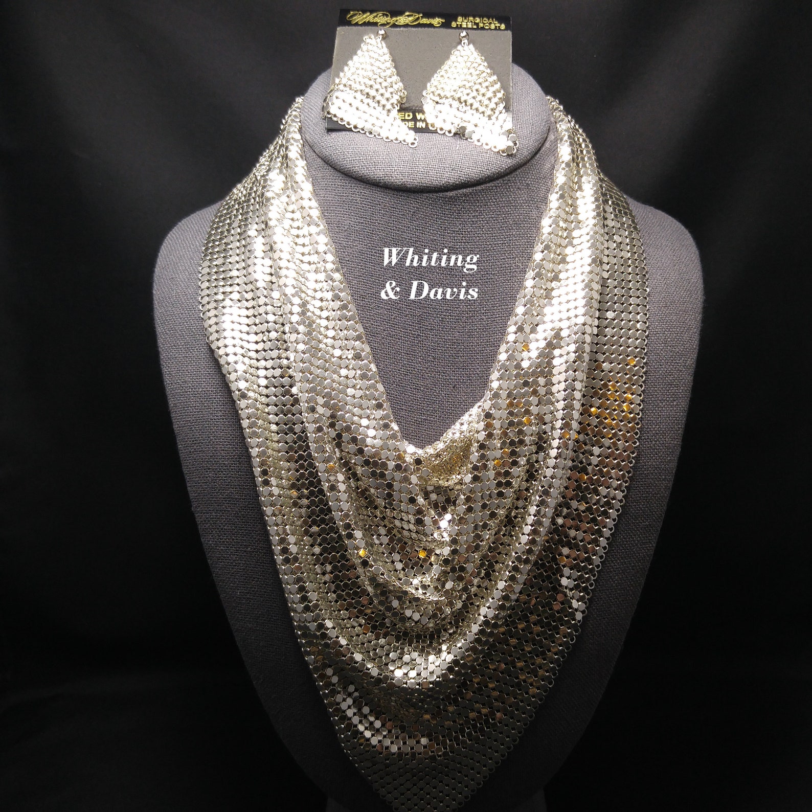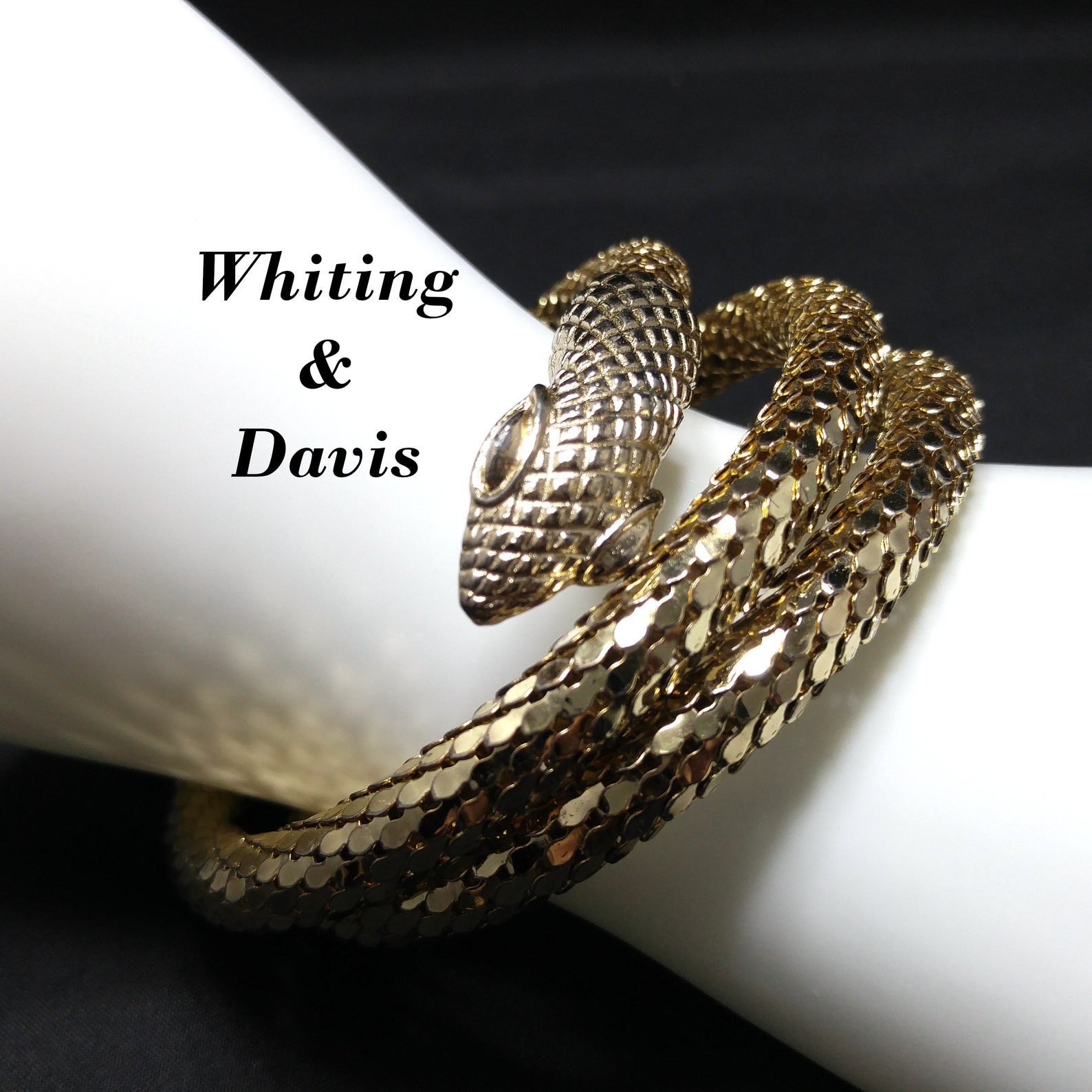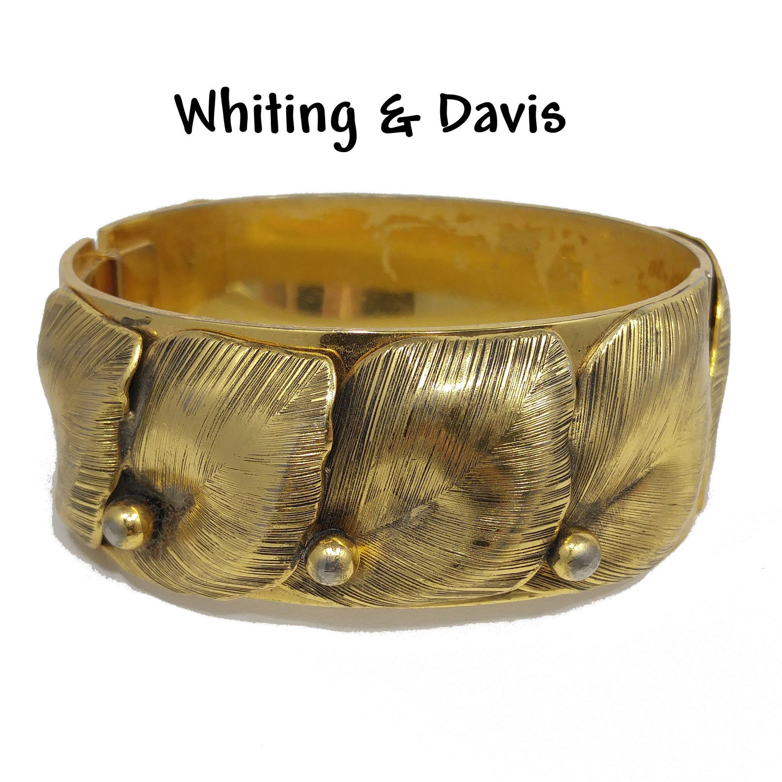 Whiting & Davis began their company in 1926 and were famous for their mesh bags and mesh jewelry. They used heavy gold and silver tone rhodium plating with their signature stamped into the metal or on a metal hang tag. According to Julia C Carroll in Costume Jewelry 101, she states that it is unclear when the company first produced jewelry, although vintage advertising was available in 1931. She also states that they made metal jewelry designs which often include open latticework, mesh, and or intricate overlapping metal leaves. The metalwork often frames one large center piece, such as reverse carved glass cameos. Due to the high quality metal work and stones, the jewelry is highly collectible. During the 1950s, some items were reproductions of vintage museum jewelry.