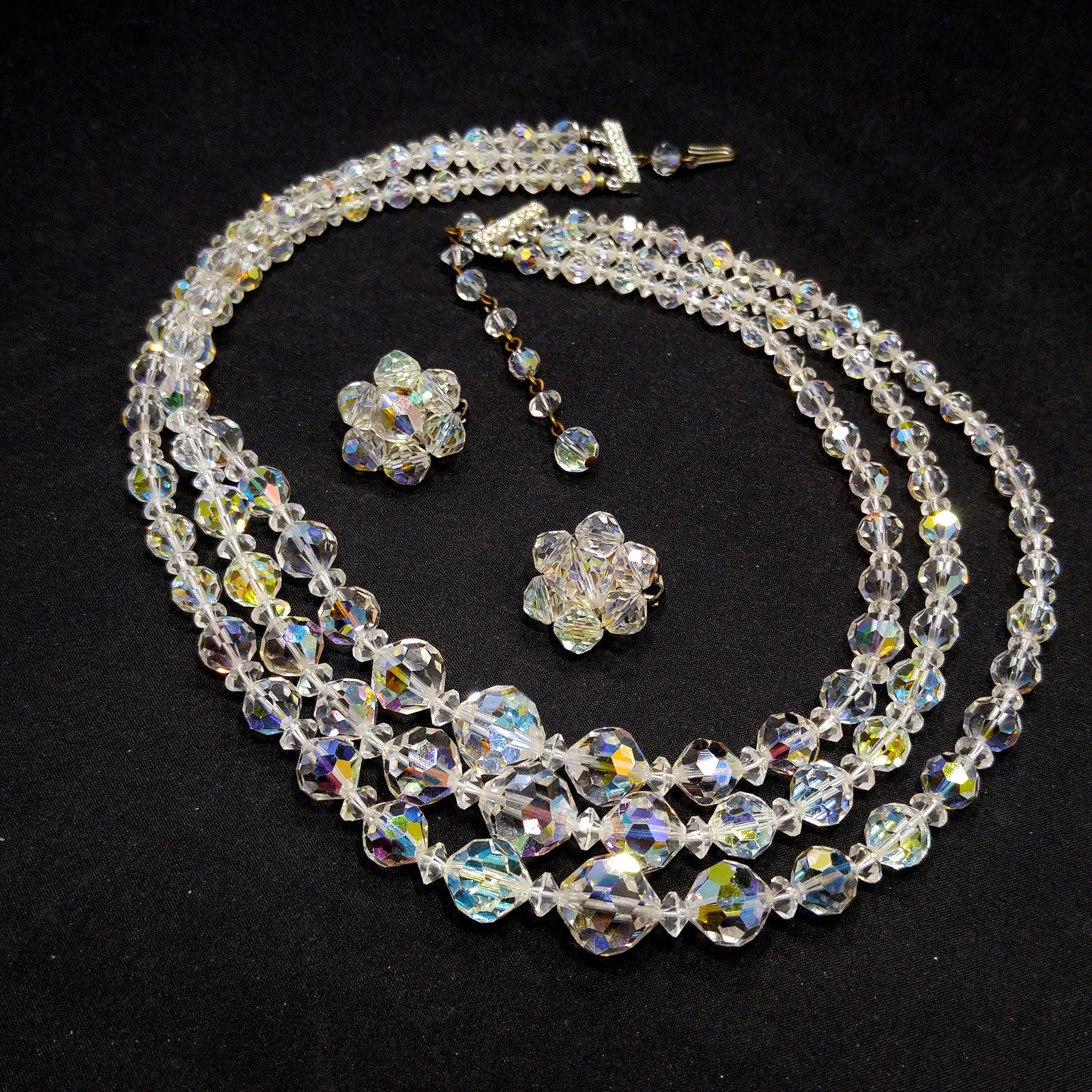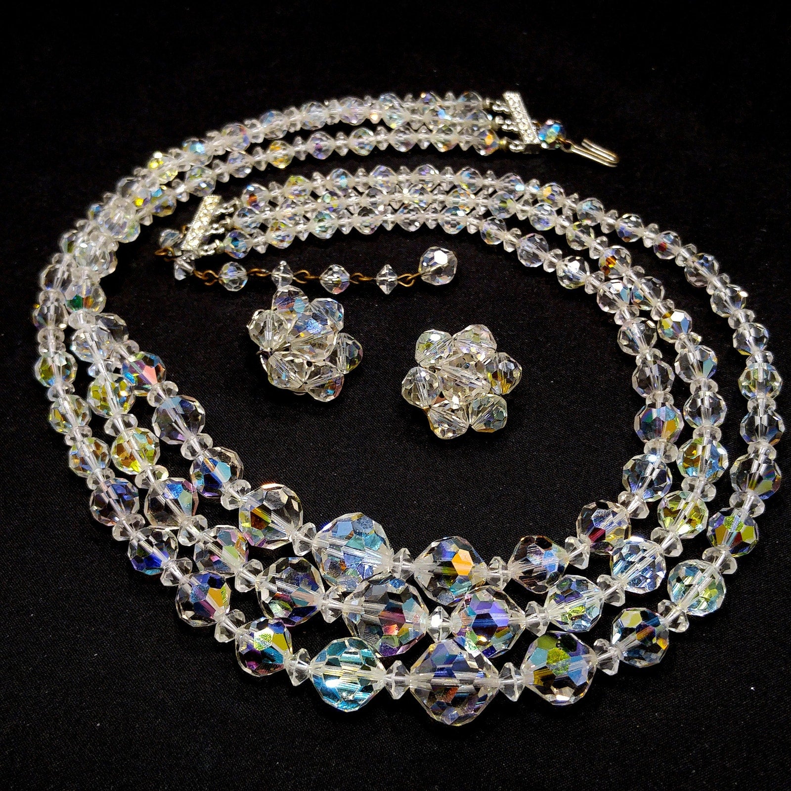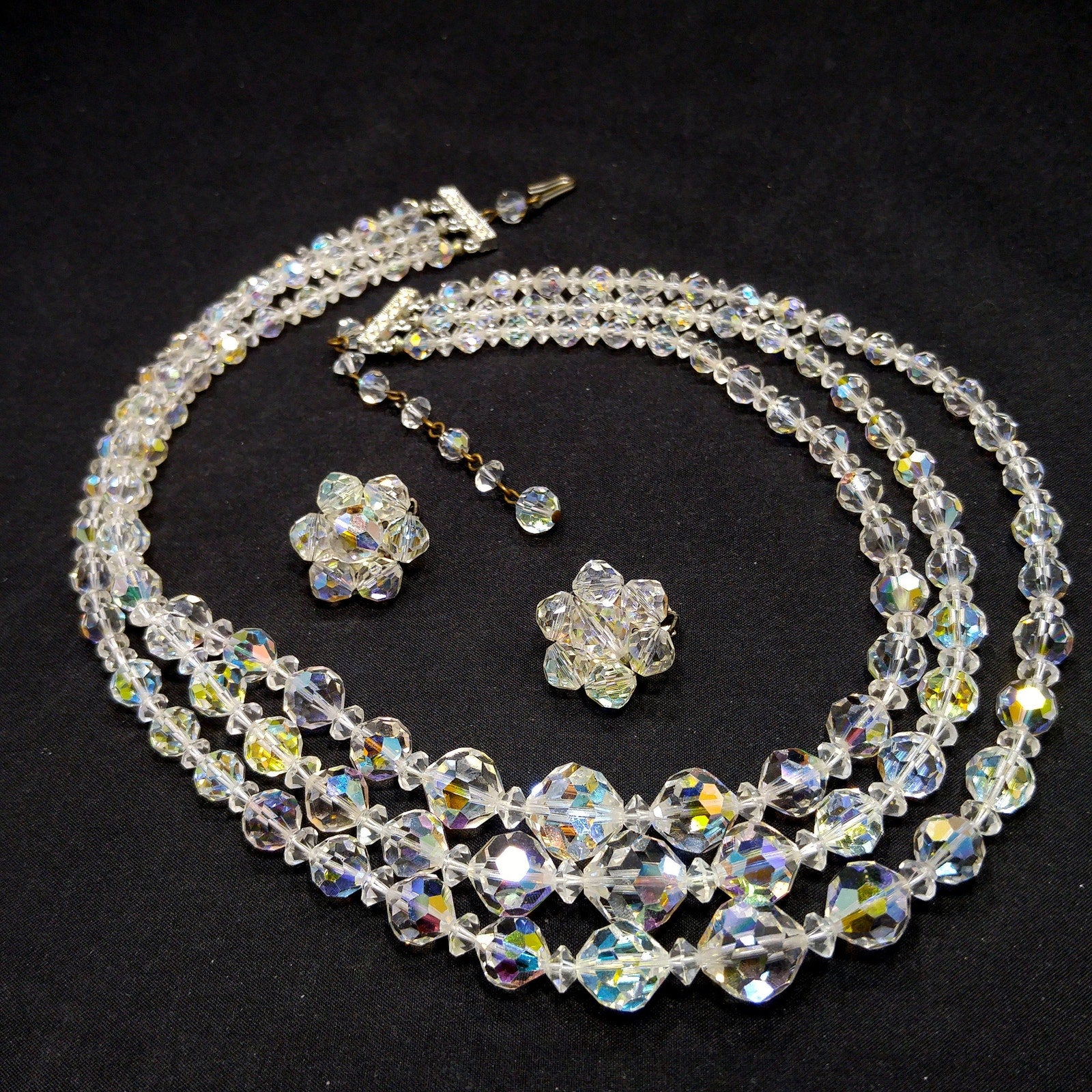 *Description: This is a beautiful mid-century clear aurora borealis crystal necklace and matching earrings with three strands, rhinestone end bars, and an adjustable length from the later 1950s which would be perfect for a wedding or any formal event. The beads are graduated in length with the largest displaying in the frontal section. The aurora borealis reflect many colors in the light. This necklace would look beautiful for any special occasion. This would be a great addition to your vintage jewelry collection or make a great vintage gift!