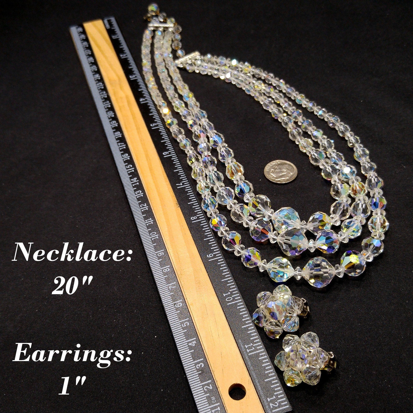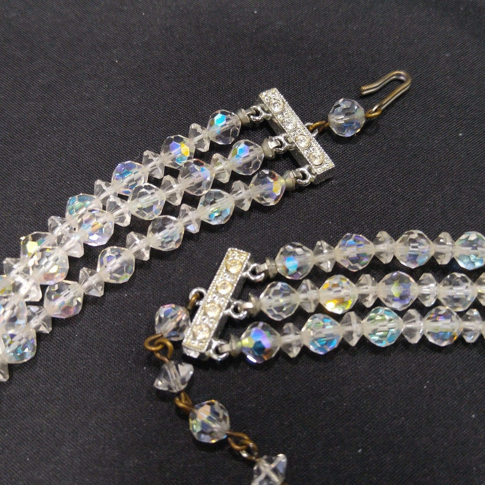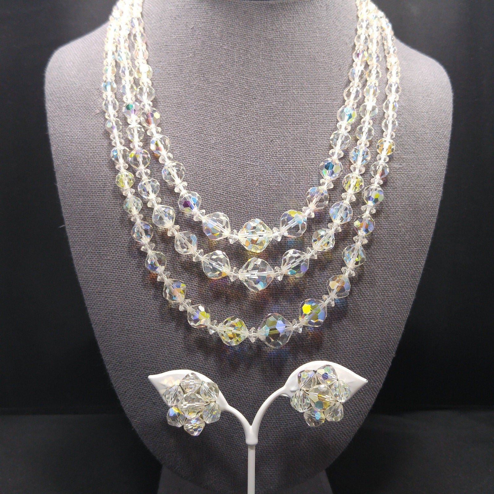 *Description: This is a beautiful mid-century clear aurora borealis crystal necklace and matching earrings with three strands, rhinestone end bars, and an adjustable length from the later 1950s which would be perfect for a wedding or any formal event. The beads are graduated in length with the largest displaying in the frontal section. The aurora borealis reflect many colors in the light. This necklace would look beautiful for any special occasion. This would be a great addition to your vintage jewelry collection or make a great vintage gift!