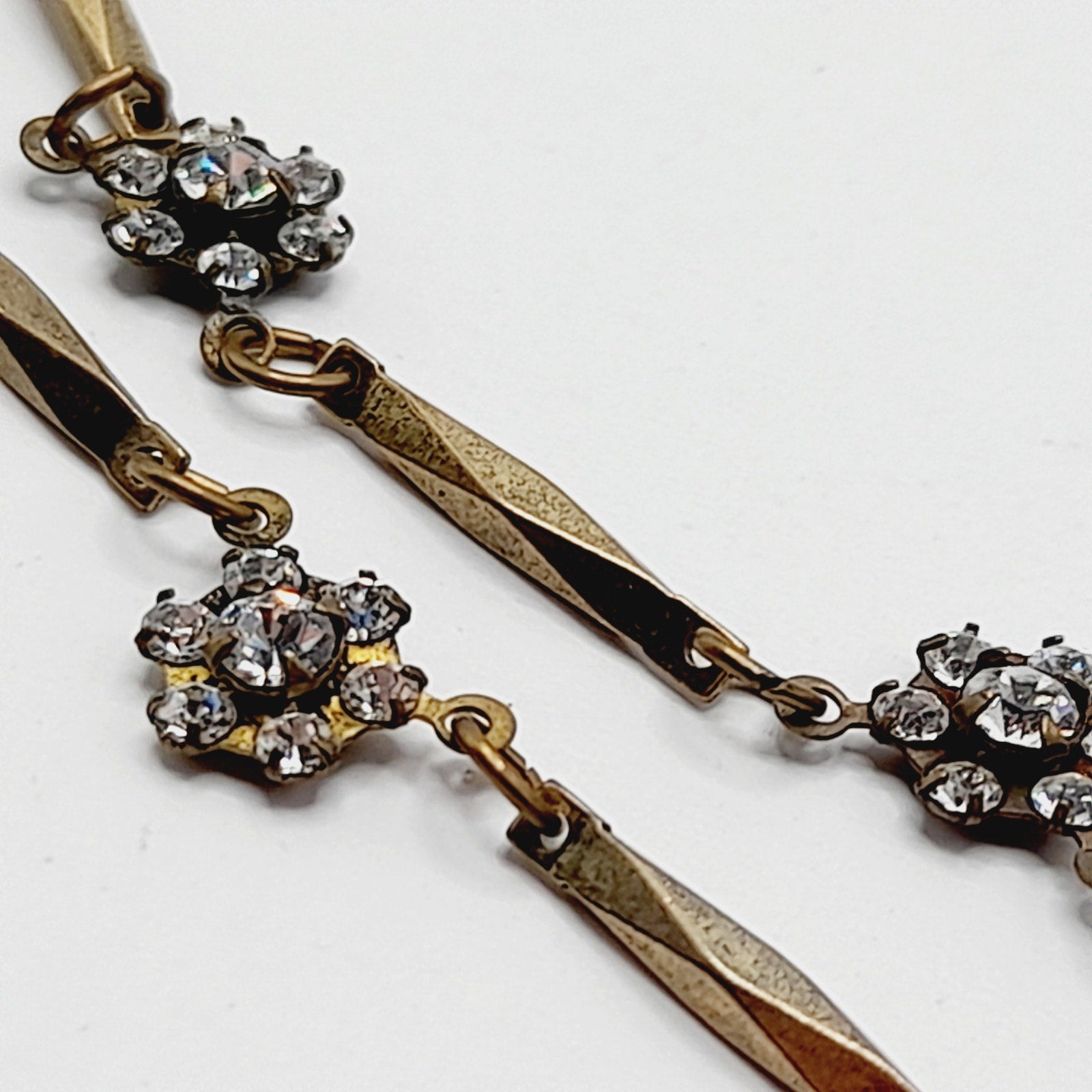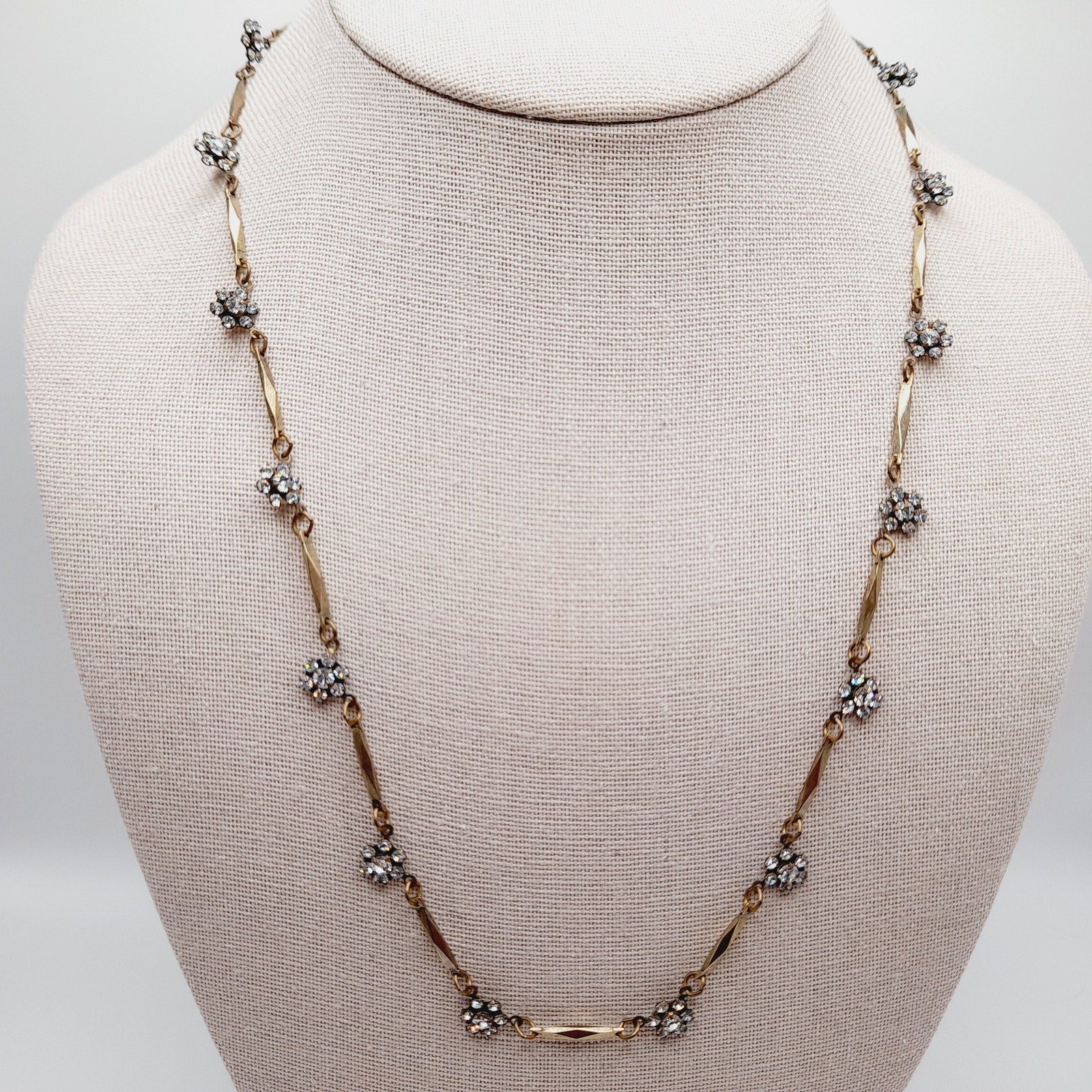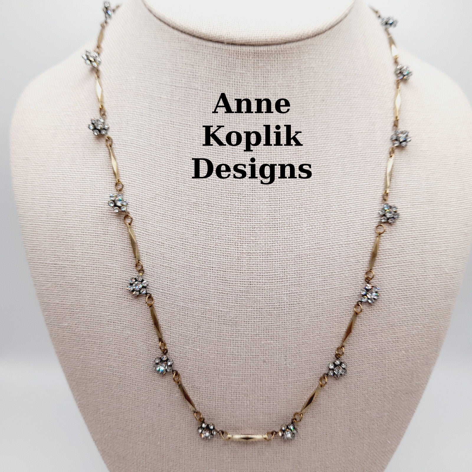This elegant Anne Koplik Designs necklace features sparkling clear rhinestones set in delicate floral clusters, linked by slender gold-tone bars. Signed with the Anne Koplik Designs maker’s mark on the hang tag, this piece reflects the brand’s tradition of handcrafted jewelry made in the U.S.A.
