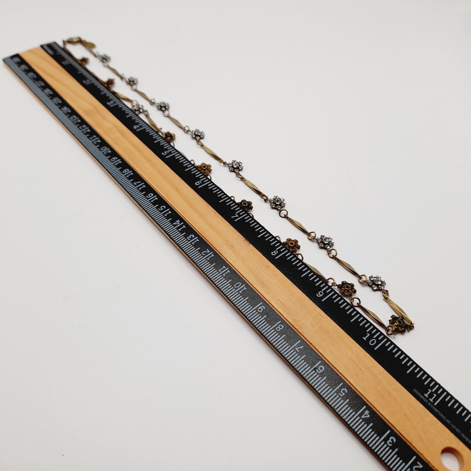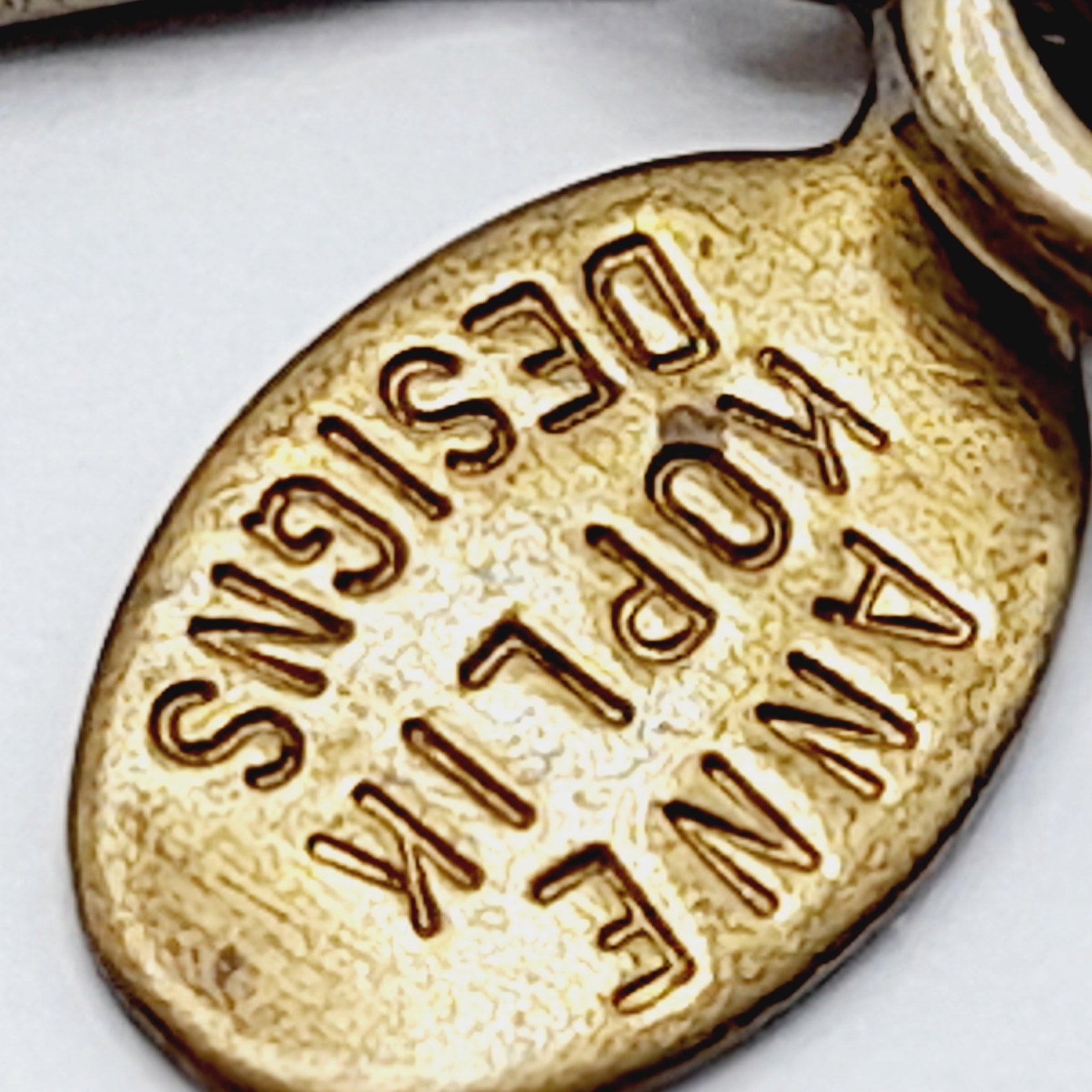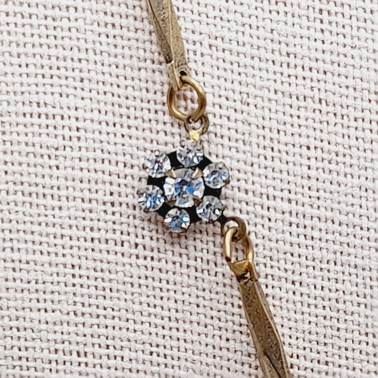This elegant Anne Koplik Designs necklace features sparkling clear rhinestones set in delicate floral clusters, linked by slender gold-tone bars. Signed with the Anne Koplik Designs maker’s mark on the hang tag, this piece reflects the brand’s tradition of handcrafted jewelry made in the U.S.A.