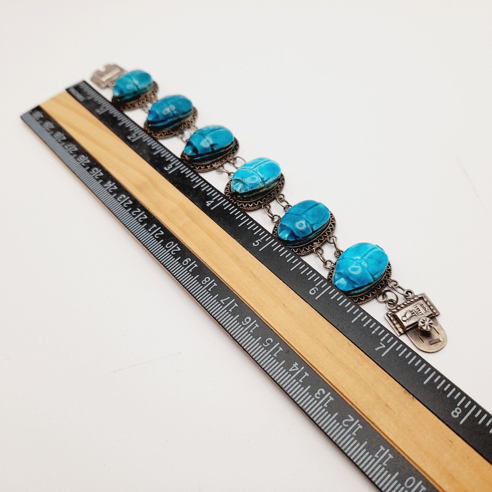 This exquisite antique Art Deco bracelet features a stunning Egyptian Revival design. The centerpiece is a beautifully detailed scarab, crafted from high-quality silver. This bracelet is a true statement piece, perfect for adding a touch of vintage elegance to any outfit.