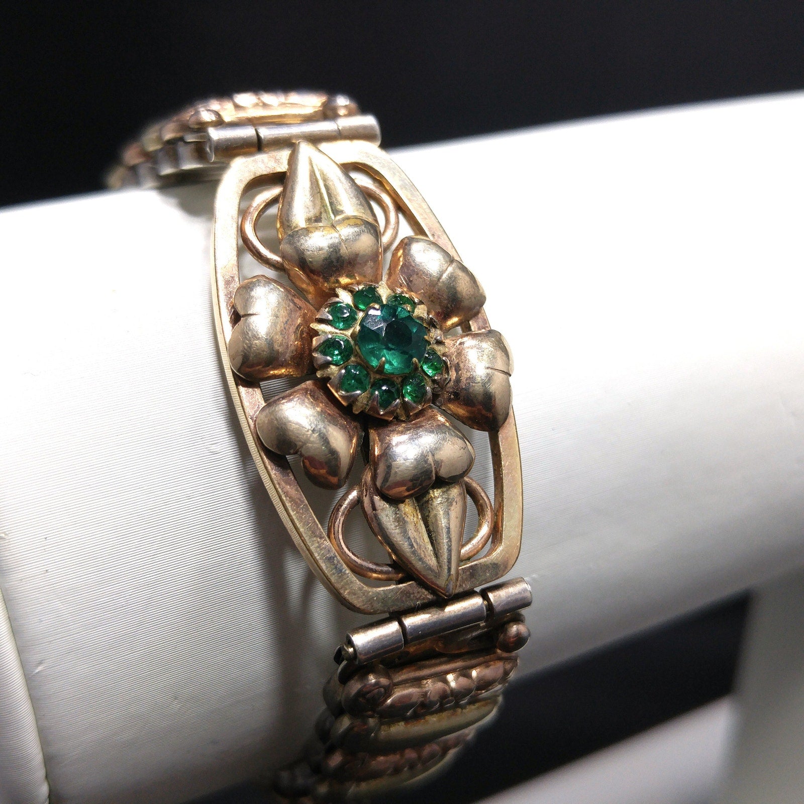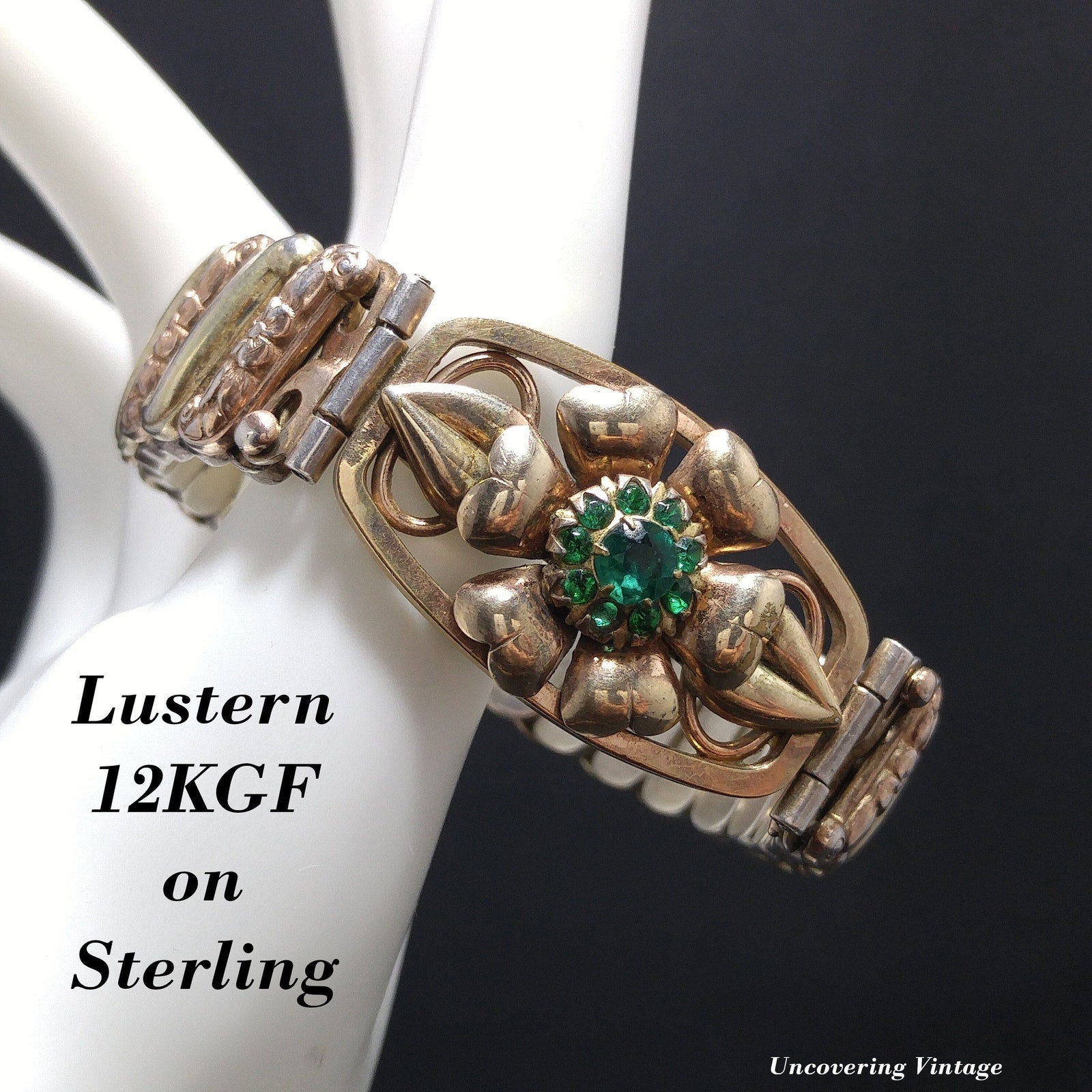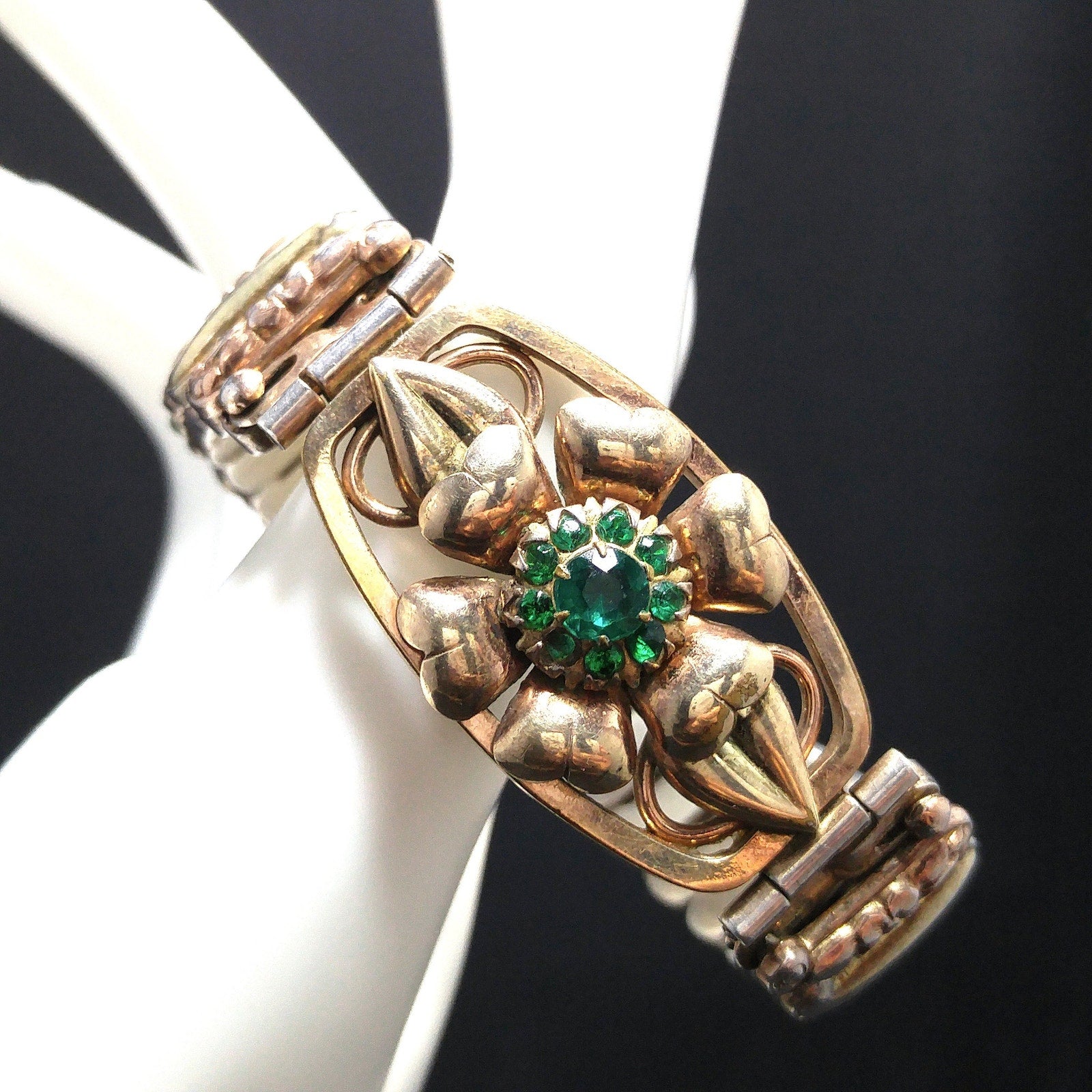 *Description: This is an antique Lustern floral expansion bracelet stamped 12KGF on Sterling from the 1920s or before. It is a Victorian style bracelet and is in two tones of gold filled with one being more of a gold in color and one being more of a rose gold. The center floral has emerald green rhinestones in the middle of a flower setting. There is one rhinestone that is missing or down inside the setting. The company who made this bracelet began in 1871. The bracelet shows wear but is in great condition. Most of the wear is the sterling patina. When the bracelet is stretched to its greatest length, it is approximately 7 inches. This would be a wonderful heirloom bracelet to pass down from generation to generation. It is close to or over one hundred years old. This would be a great addition to your vintage jewelry collection or make a great vintage gift!