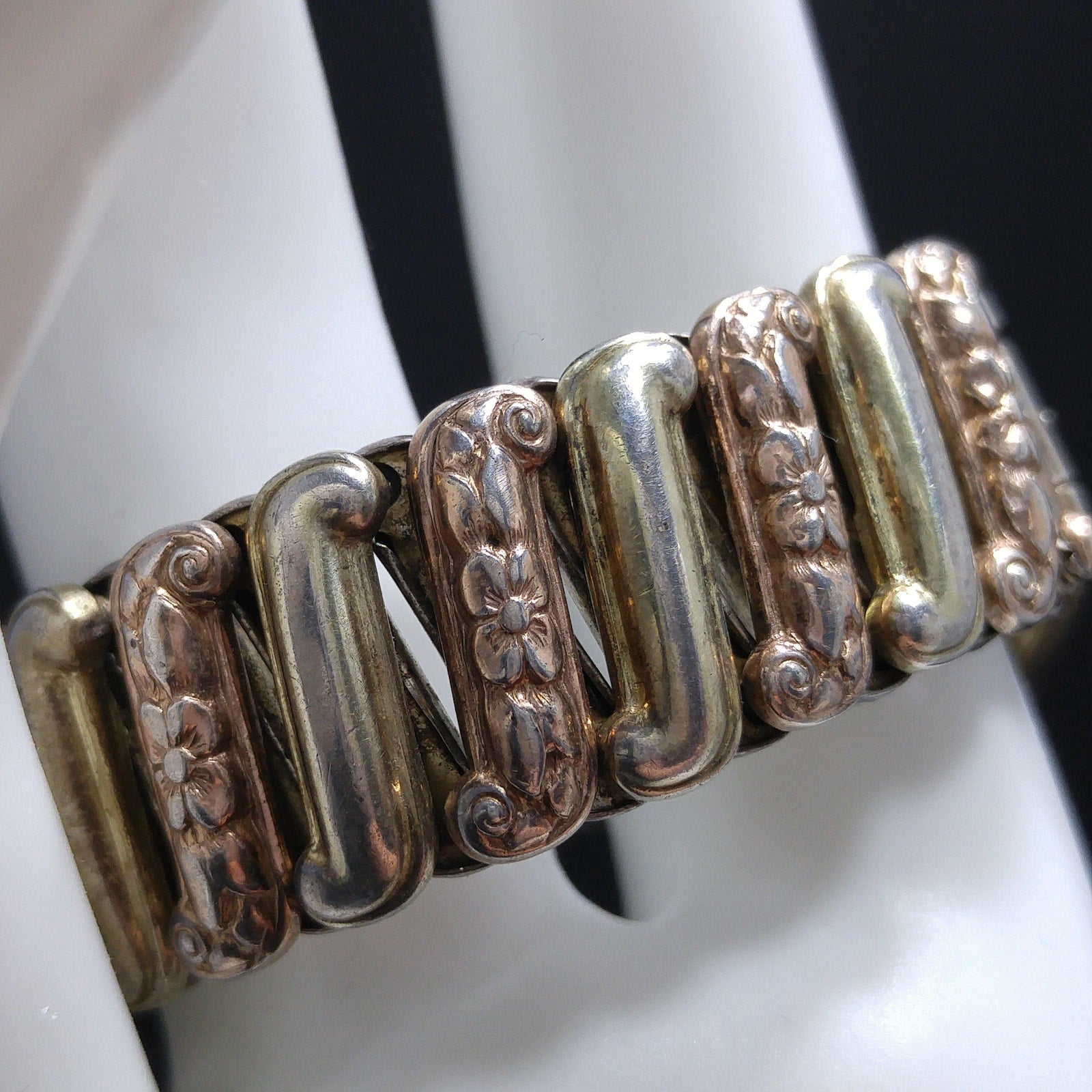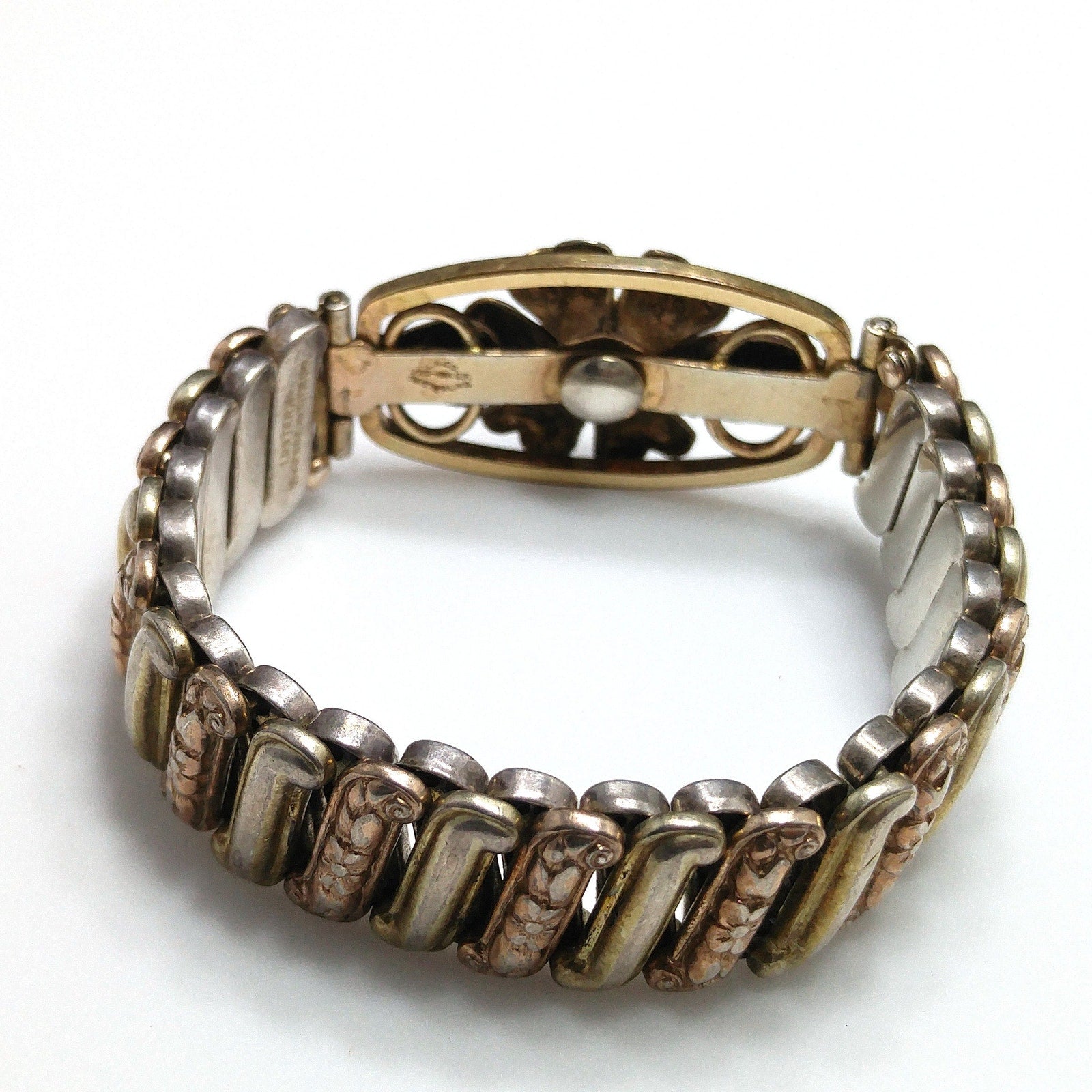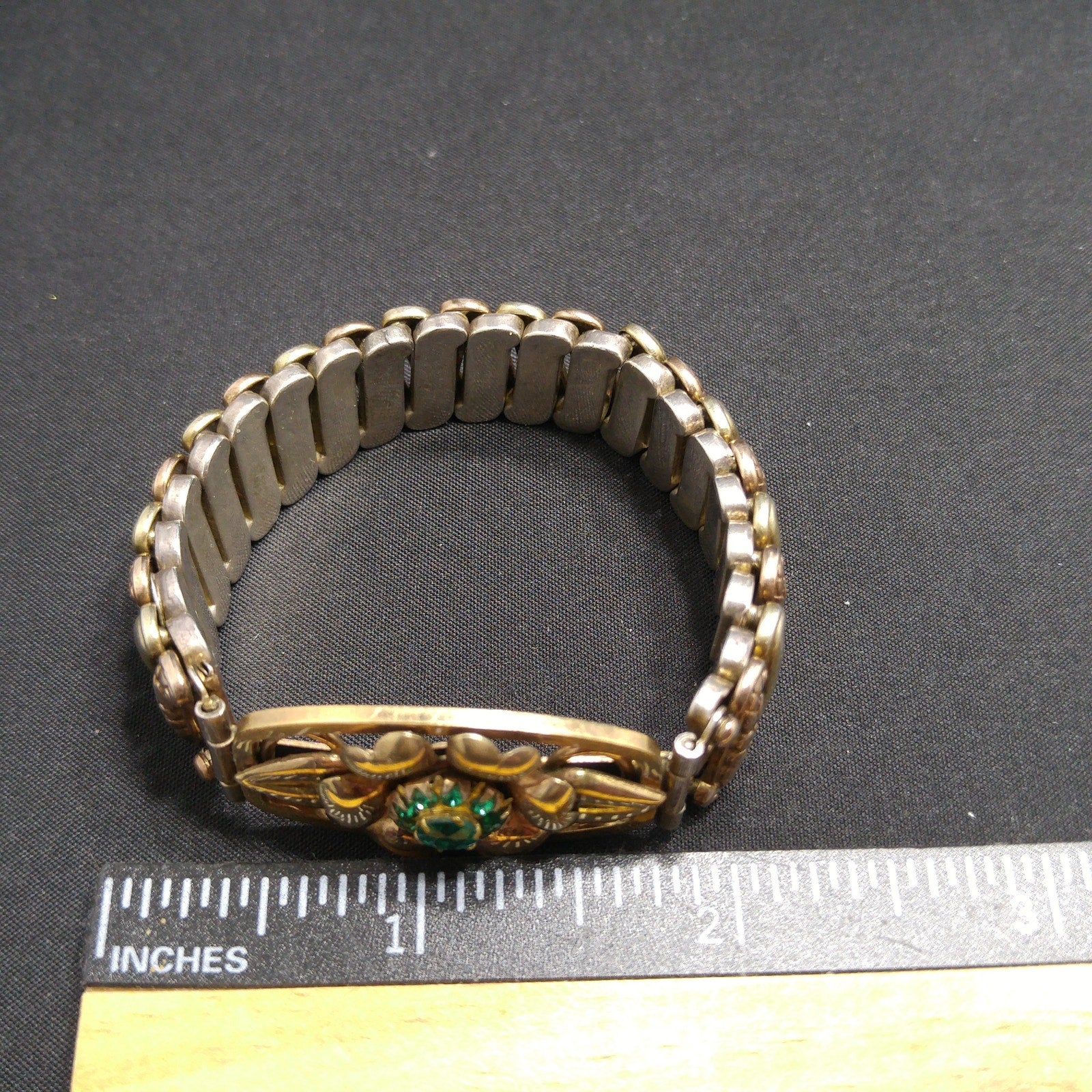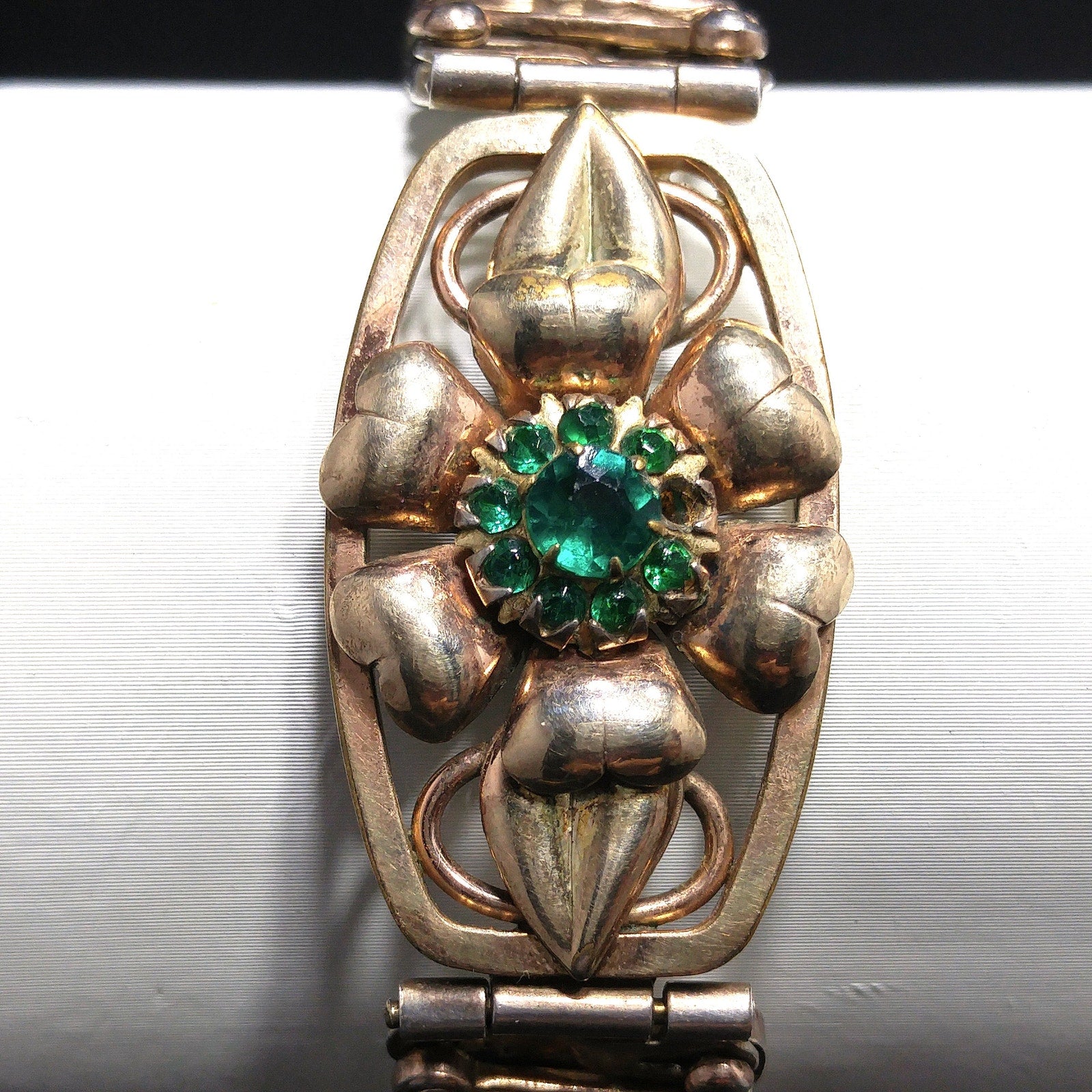 *Description: This is an antique Lustern floral expansion bracelet stamped 12KGF on Sterling from the 1920s or before. It is a Victorian style bracelet and is in two tones of gold filled with one being more of a gold in color and one being more of a rose gold. The center floral has emerald green rhinestones in the middle of a flower setting. There is one rhinestone that is missing or down inside the setting. The company who made this bracelet began in 1871. The bracelet shows wear but is in great condition. Most of the wear is the sterling patina. When the bracelet is stretched to its greatest length, it is approximately 7 inches. This would be a wonderful heirloom bracelet to pass down from generation to generation. It is close to or over one hundred years old. This would be a great addition to your vintage jewelry collection or make a great vintage gift!