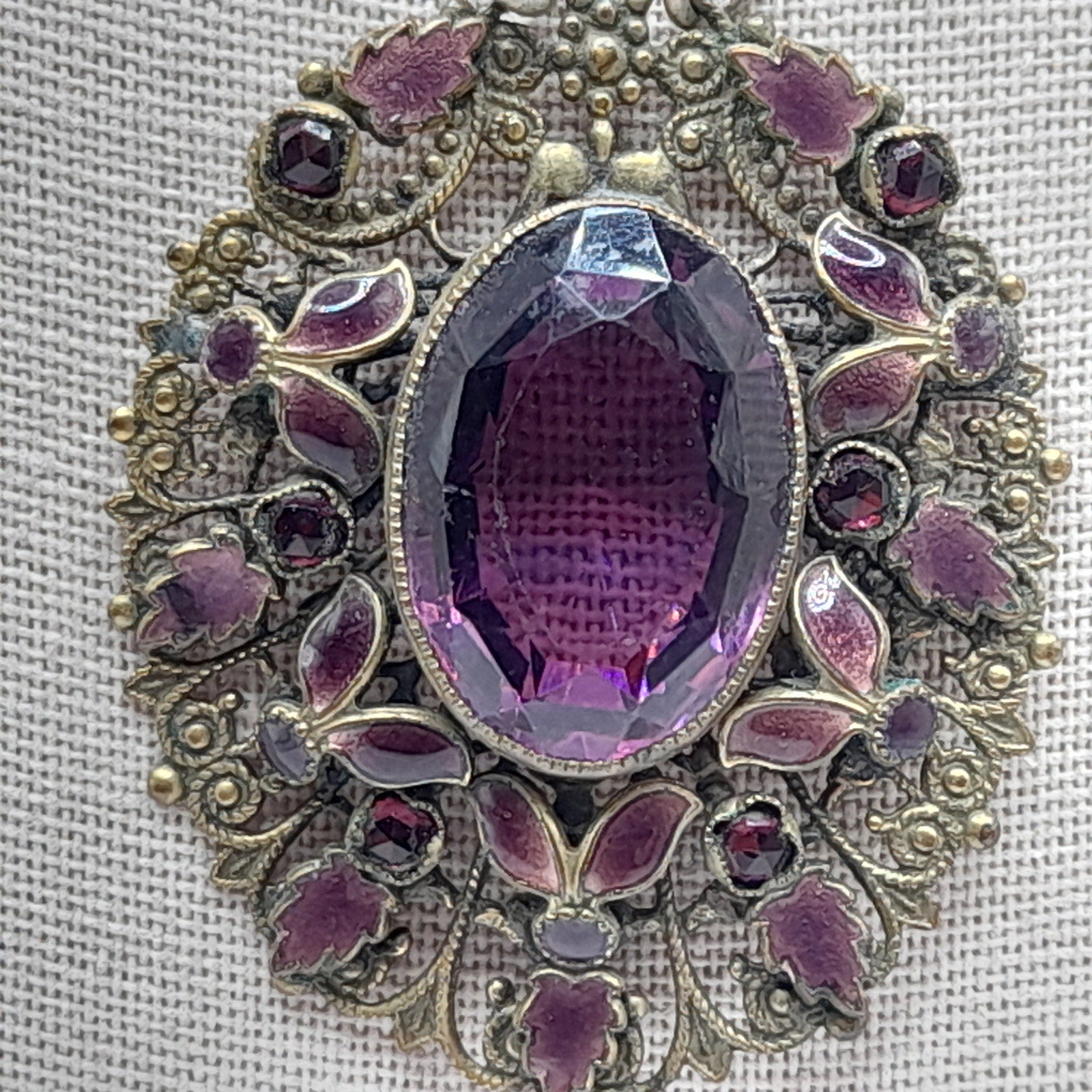 The rich purple glass catches light beautifully, creating depth and luminosity that changes with movement and lighting. The surrounding enamel detailing adds layers of color and sophistication, while the ornate filigree work demonstrates the meticulous hand-crafted techniques that made Victorian jewelry so coveted and collectible.