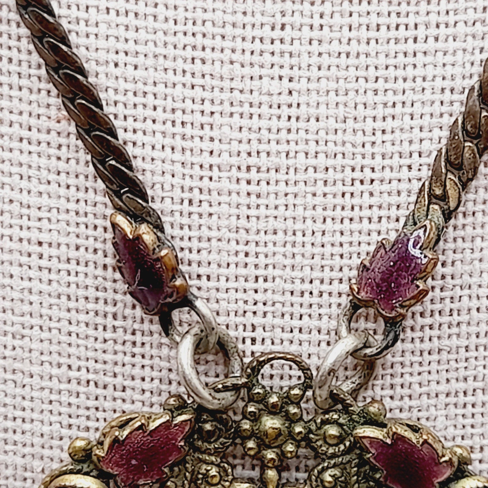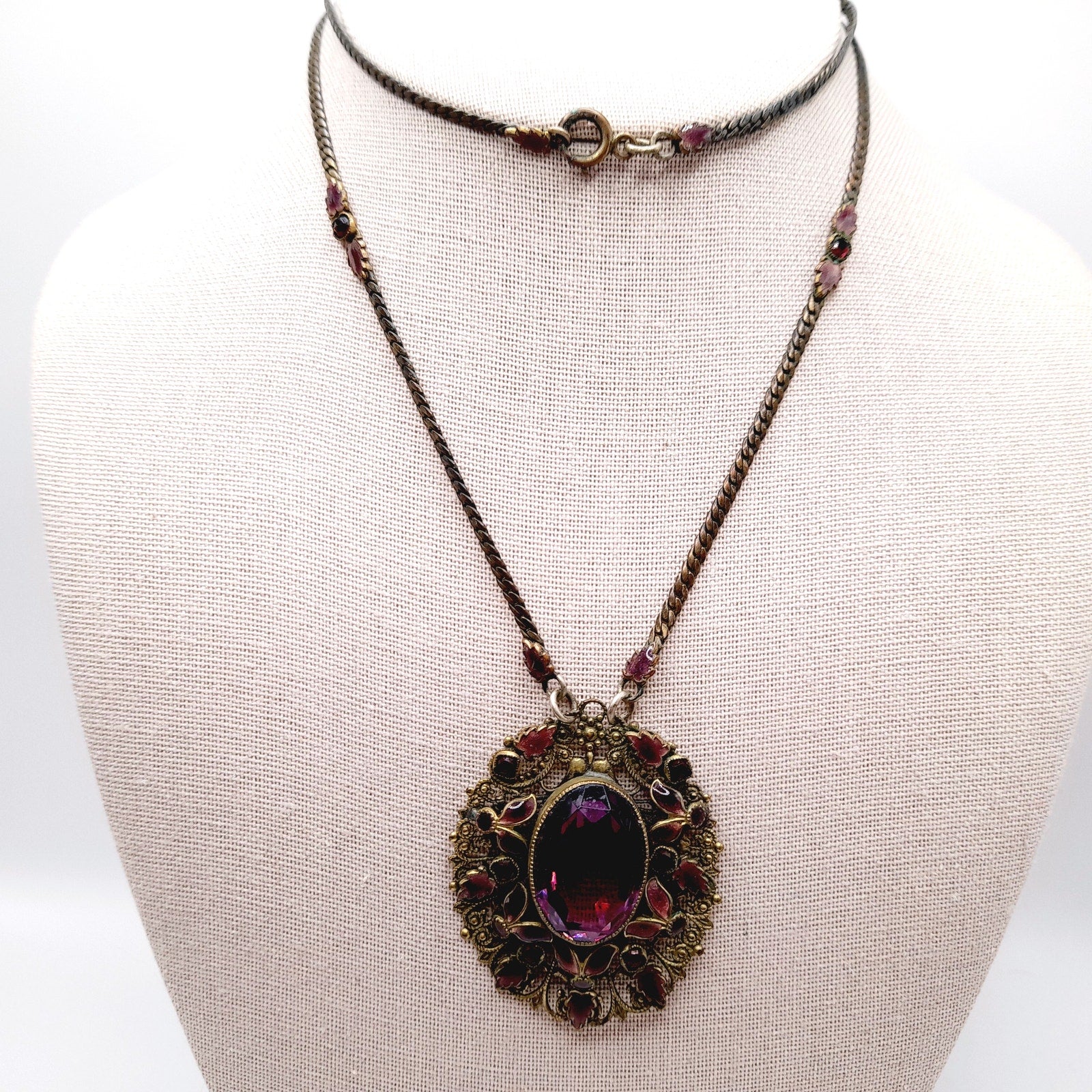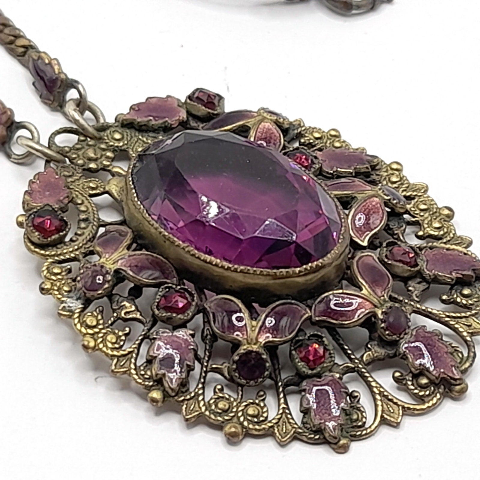 Step into the elegance of the Victorian era with this breathtaking antique necklace that exemplifies the exquisite craftsmanship and romantic aesthetic of the period. This magnificent piece features a stunning purple glass centerpiece adorned with delicate enamel work, all nestled within intricate filigree metalwork that showcases the incredible artistry of Victorian jewelry makers.