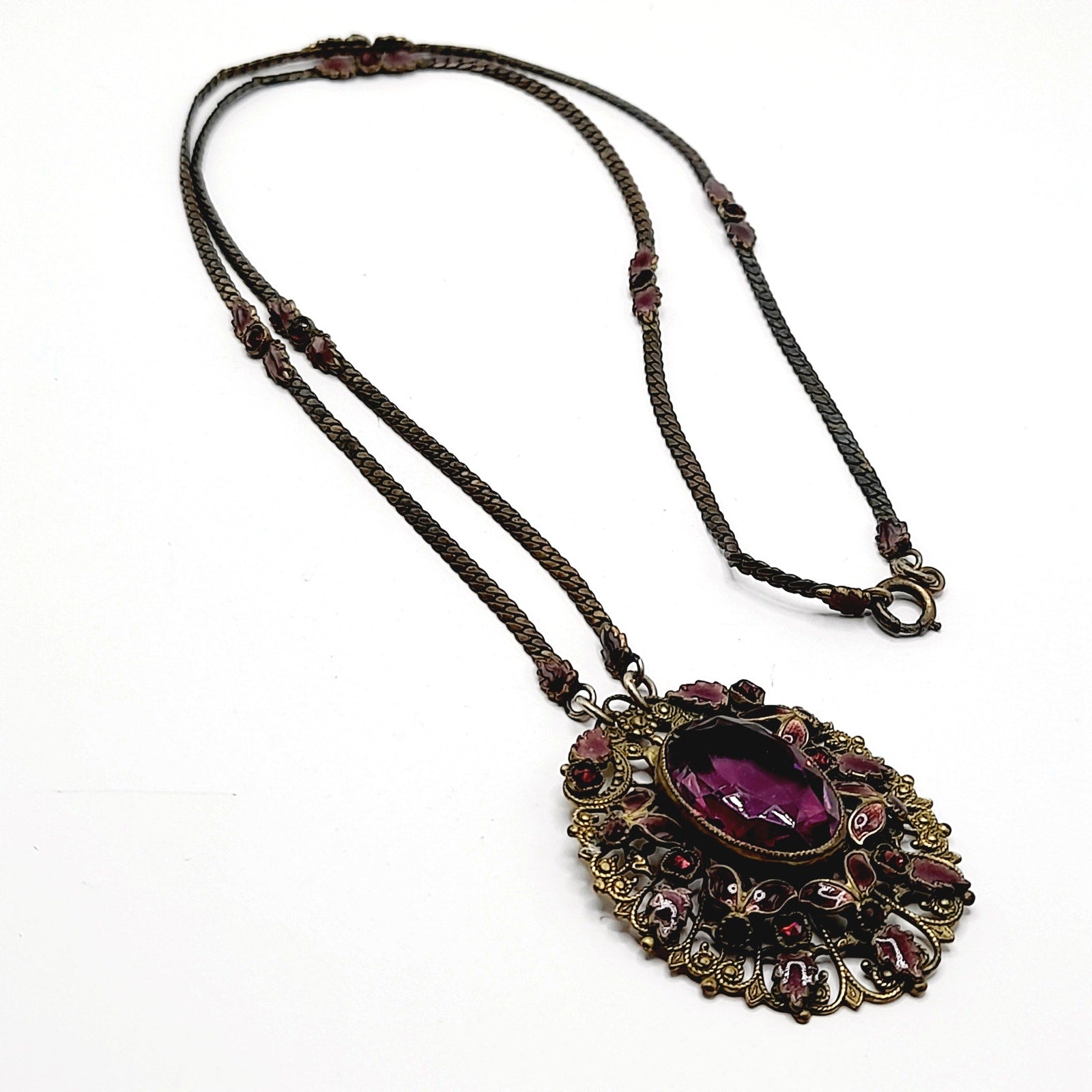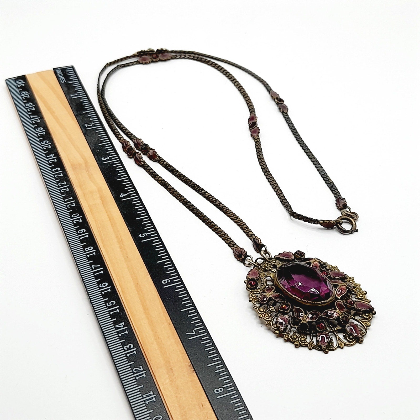 Antique Victorian Purple Glass Enamel Filigree Pendant Necklace, 27 Inches