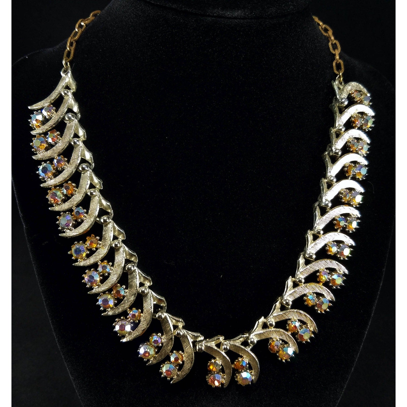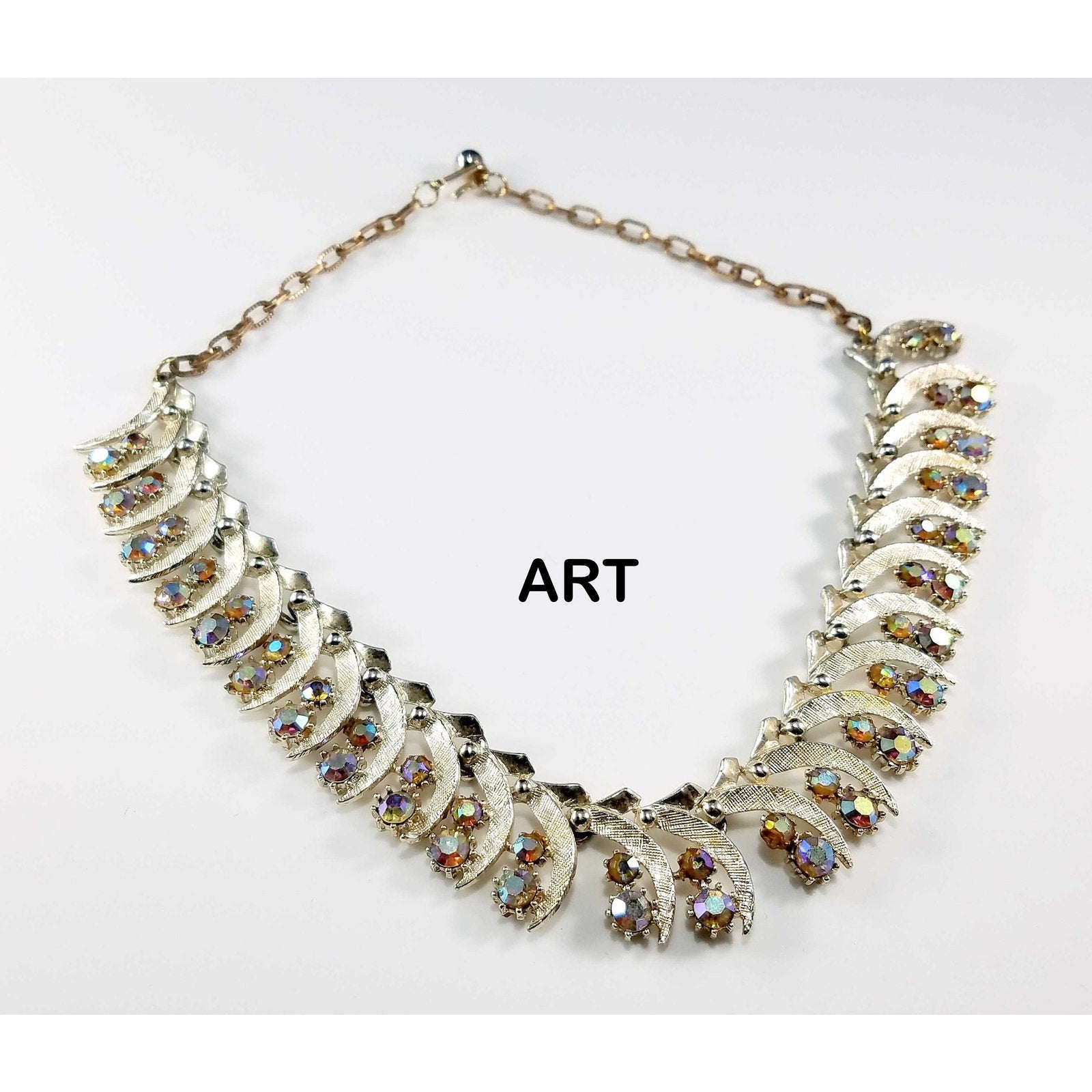 *Description: This is a beautiful choker necklace by Arthur Pepper, signed ART, which is a gold plated with Aurora Borealis clear rhinestones from the later half of the 1950s. The plating looks great on the necklace but has worn off of the brass chain, if it was there originally. Necklace is stamped ART near the clasp. The clasp is a hook and extension chain. Beautiful AB rhinestones which have a lot of pink in the Aurora Borealis. This would be a great addition to your vintage jewelry collection or make a great vintage gift!