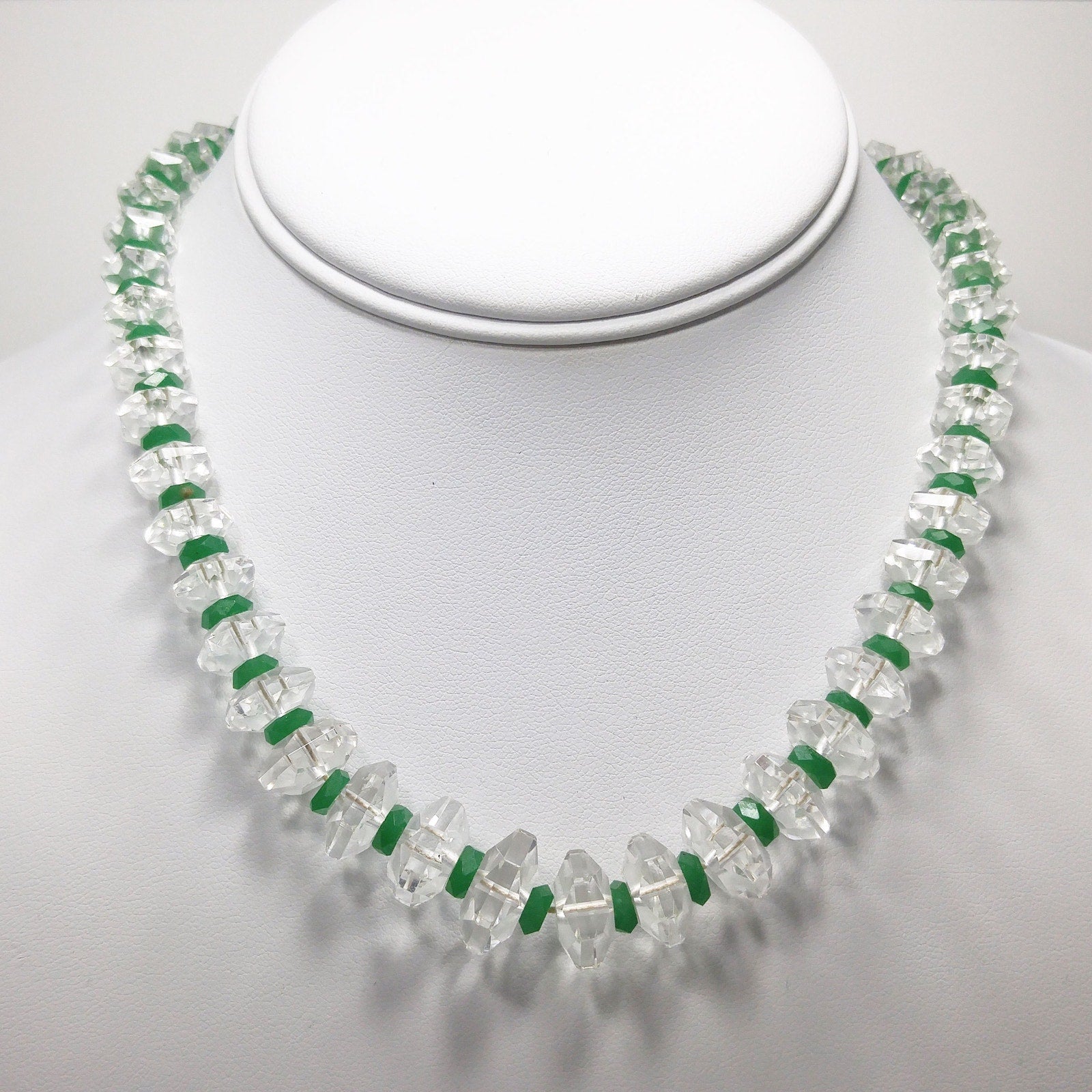 This is a stunning Art Deco clear quartz and green glass bead necklace from the 1920s. Each faceted clear quartz (rock crystal) bead is beautifully separated by a green glass spacer bead, creating a timeless and elegant contrast typical of the Art Deco period.