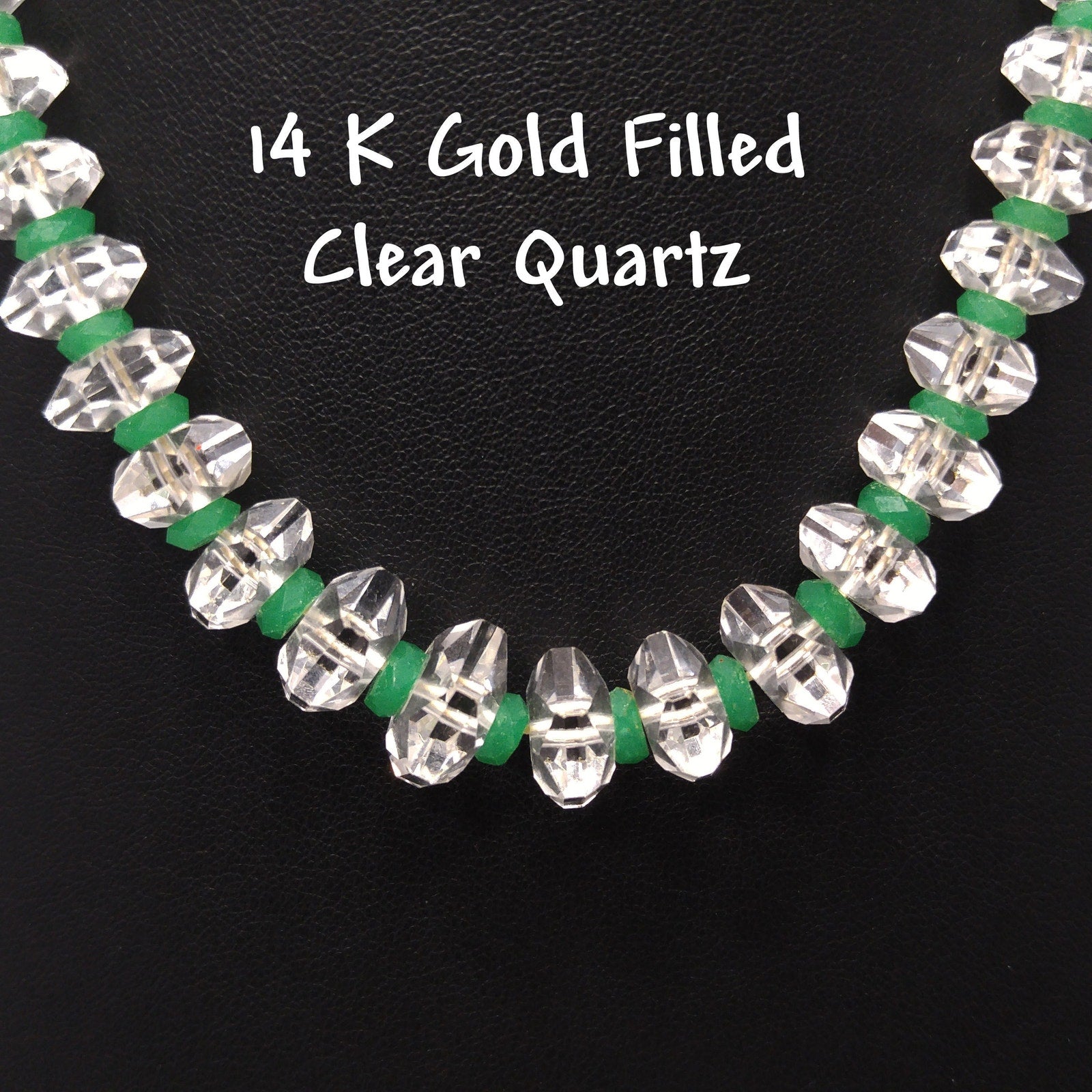Art Deco 1920s Clear Quartz Green Glass Bead Necklace 14K Gold Filled Clasp