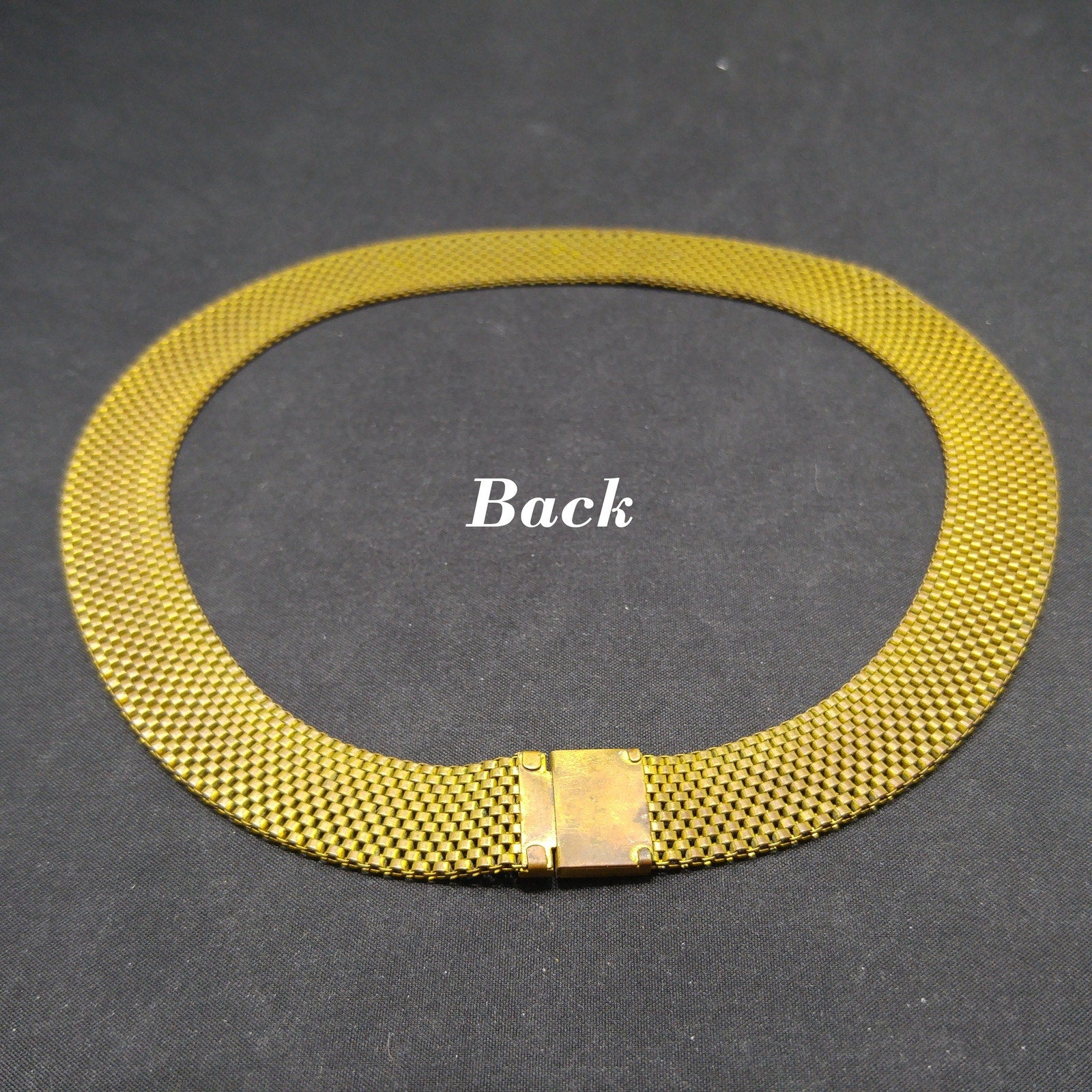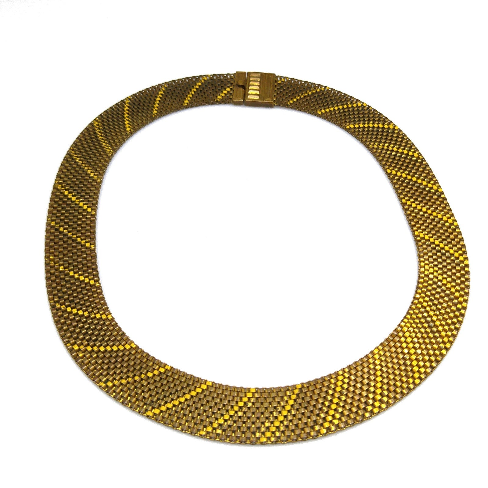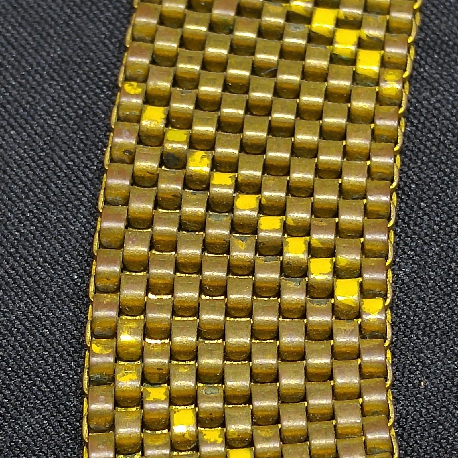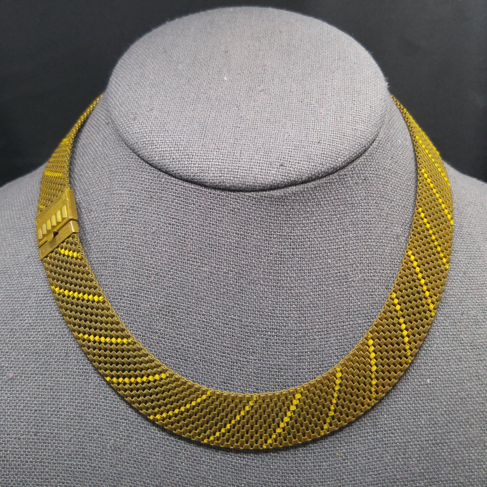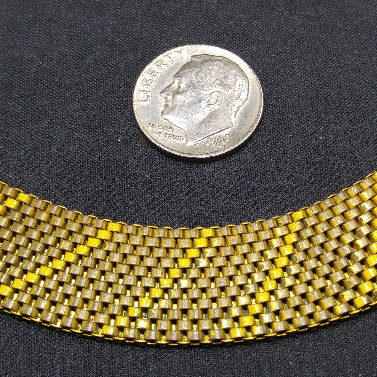 *Description: This is a unique Art Deco mesh brass and enamel choker necklace from the 1930s. It has a very unique box clasp. The geometric pattern has yellow enamel painted links. The clasp and patterned mesh has been featured in "The Chatsworth Lady" blog about vintage items. The beauty of this necklace is that it is flat around your neck and can also be held in a straight line at 16 inches in length. The width of the necklace is 5/8 Inch. This would be a great addition to your vintage jewelry collection or make a great vintage gift!