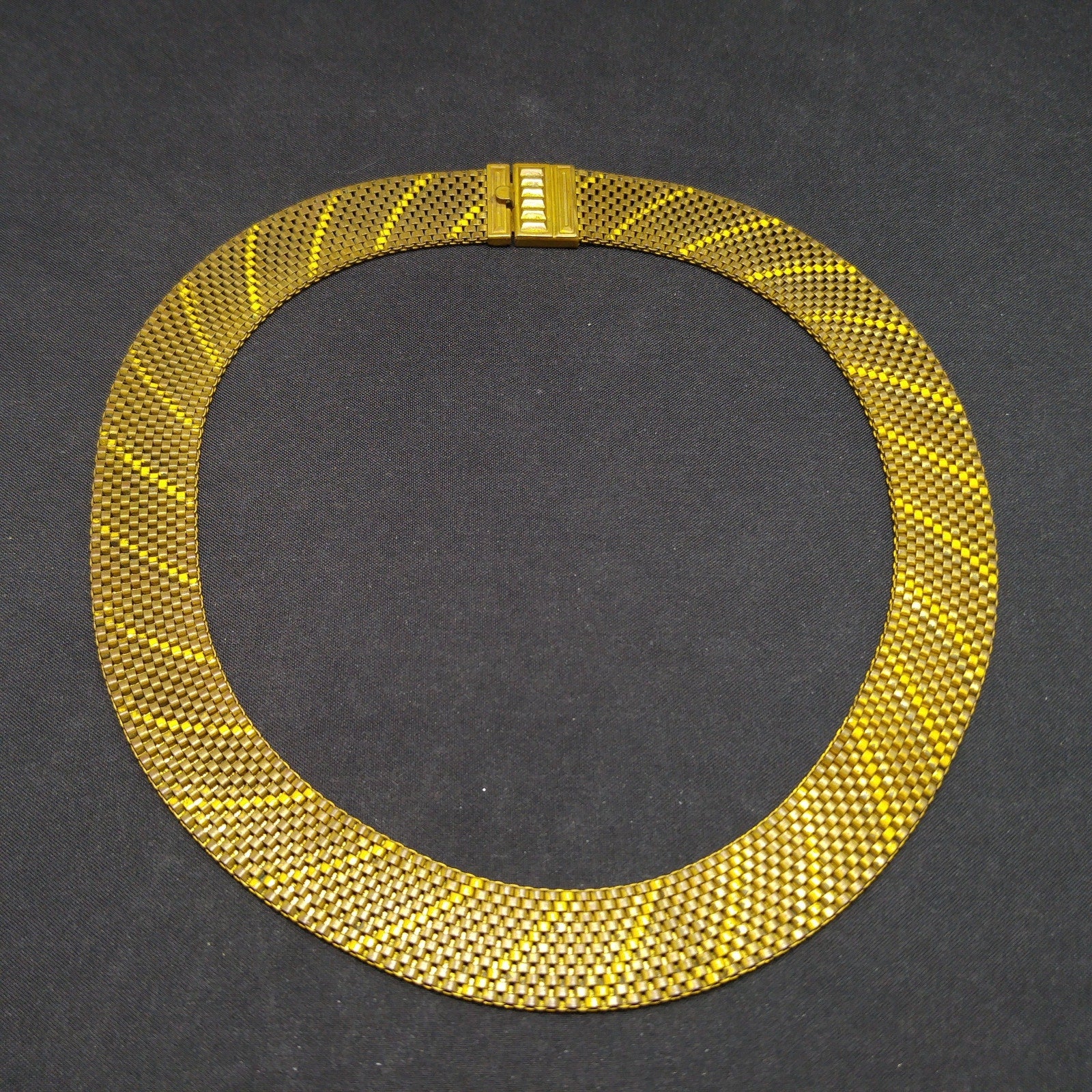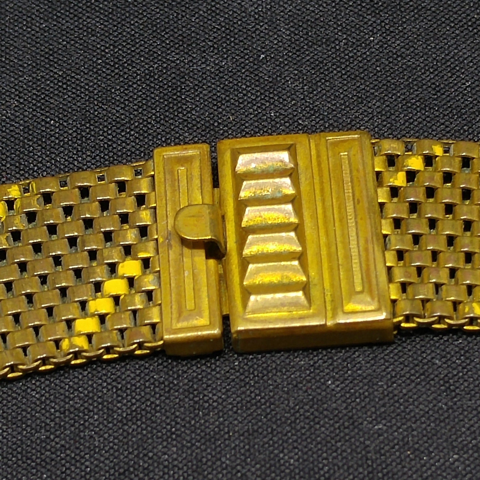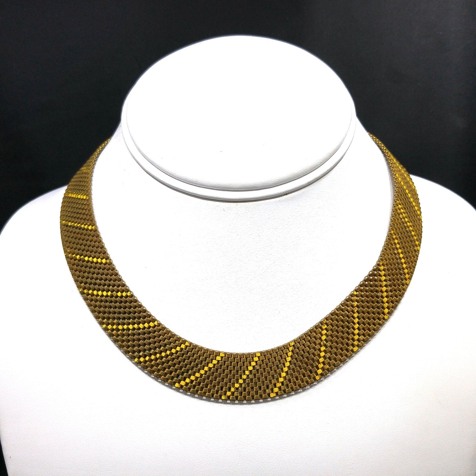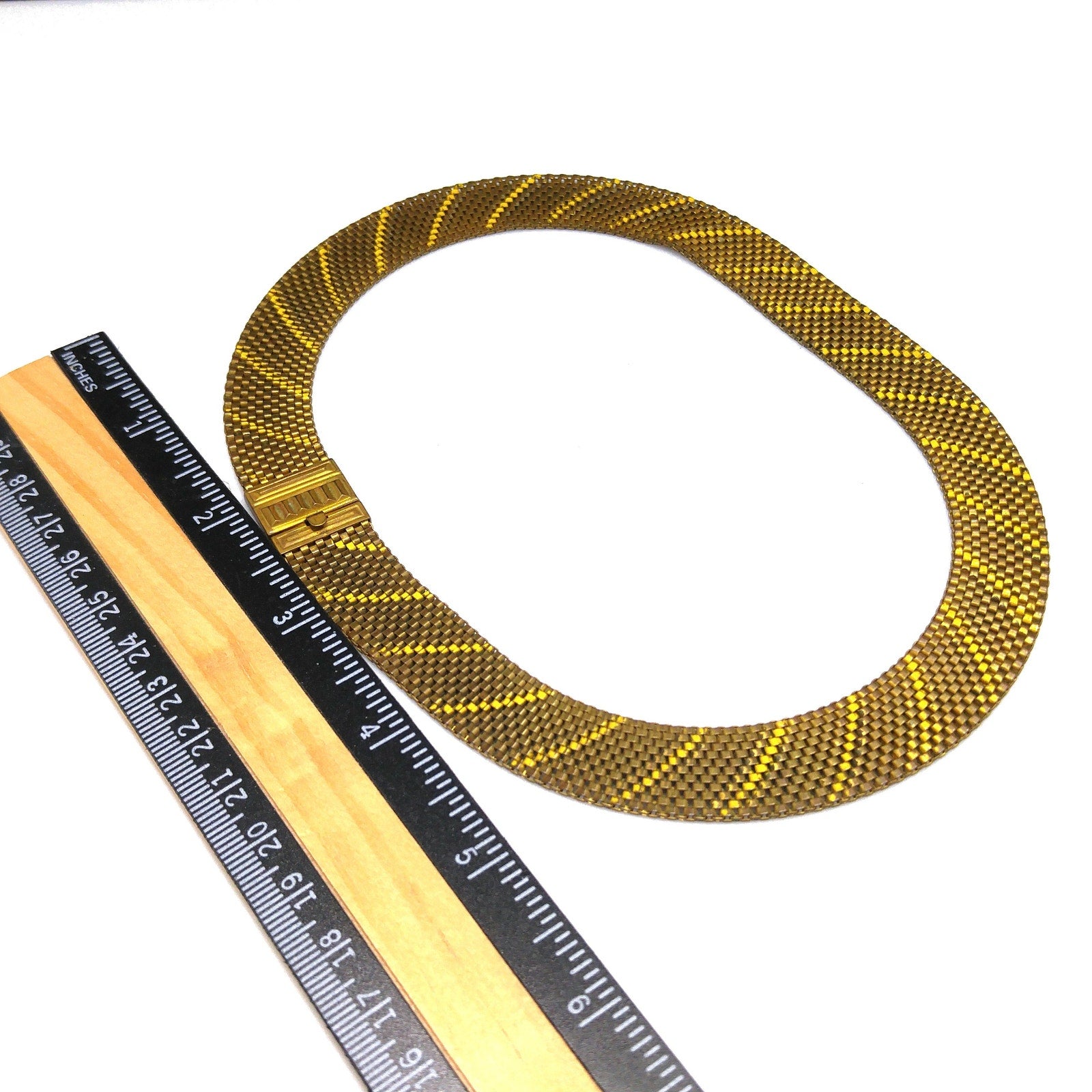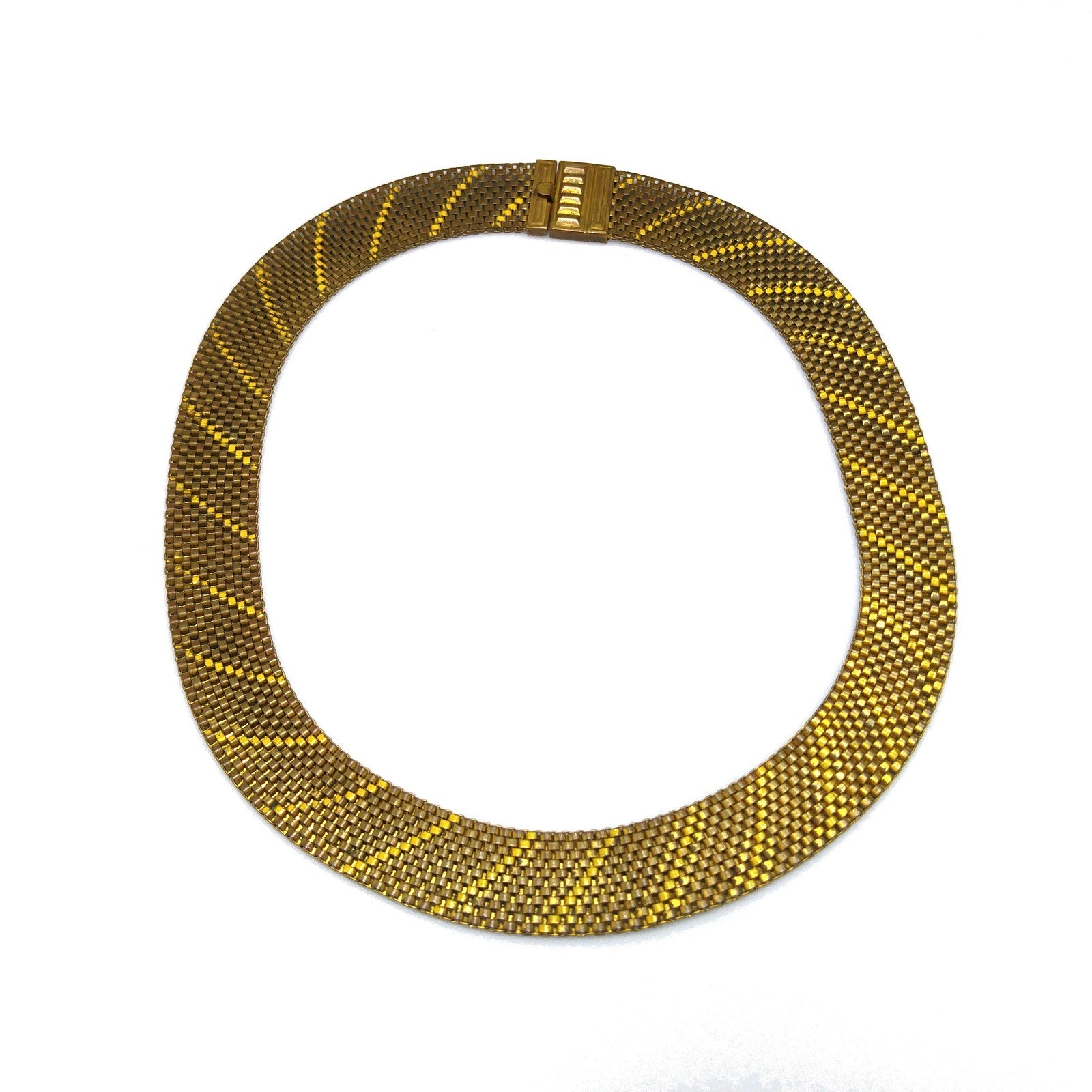 *Description: This is a unique Art Deco mesh brass and enamel choker necklace from the 1930s. It has a very unique box clasp. The geometric pattern has yellow enamel painted links. The clasp and patterned mesh has been featured in "The Chatsworth Lady" blog about vintage items. The beauty of this necklace is that it is flat around your neck and can also be held in a straight line at 16 inches in length. The width of the necklace is 5/8 Inch. This would be a great addition to your vintage jewelry collection or make a great vintage gift!