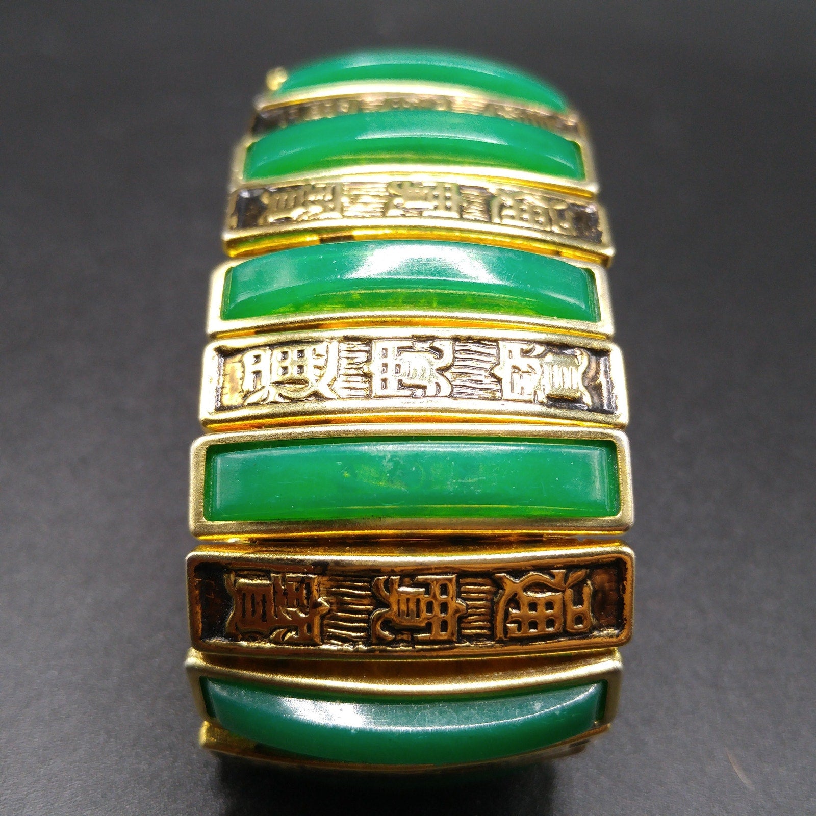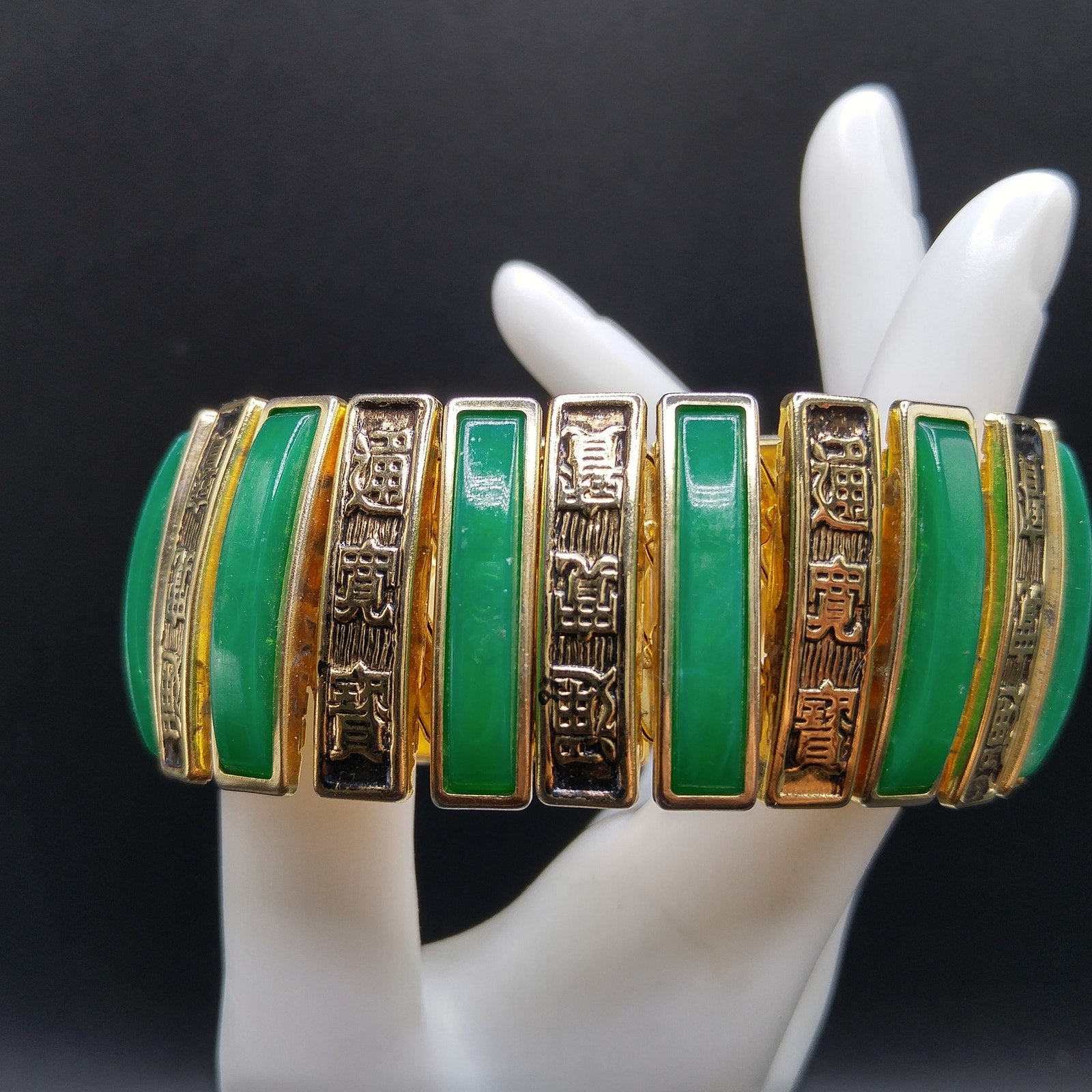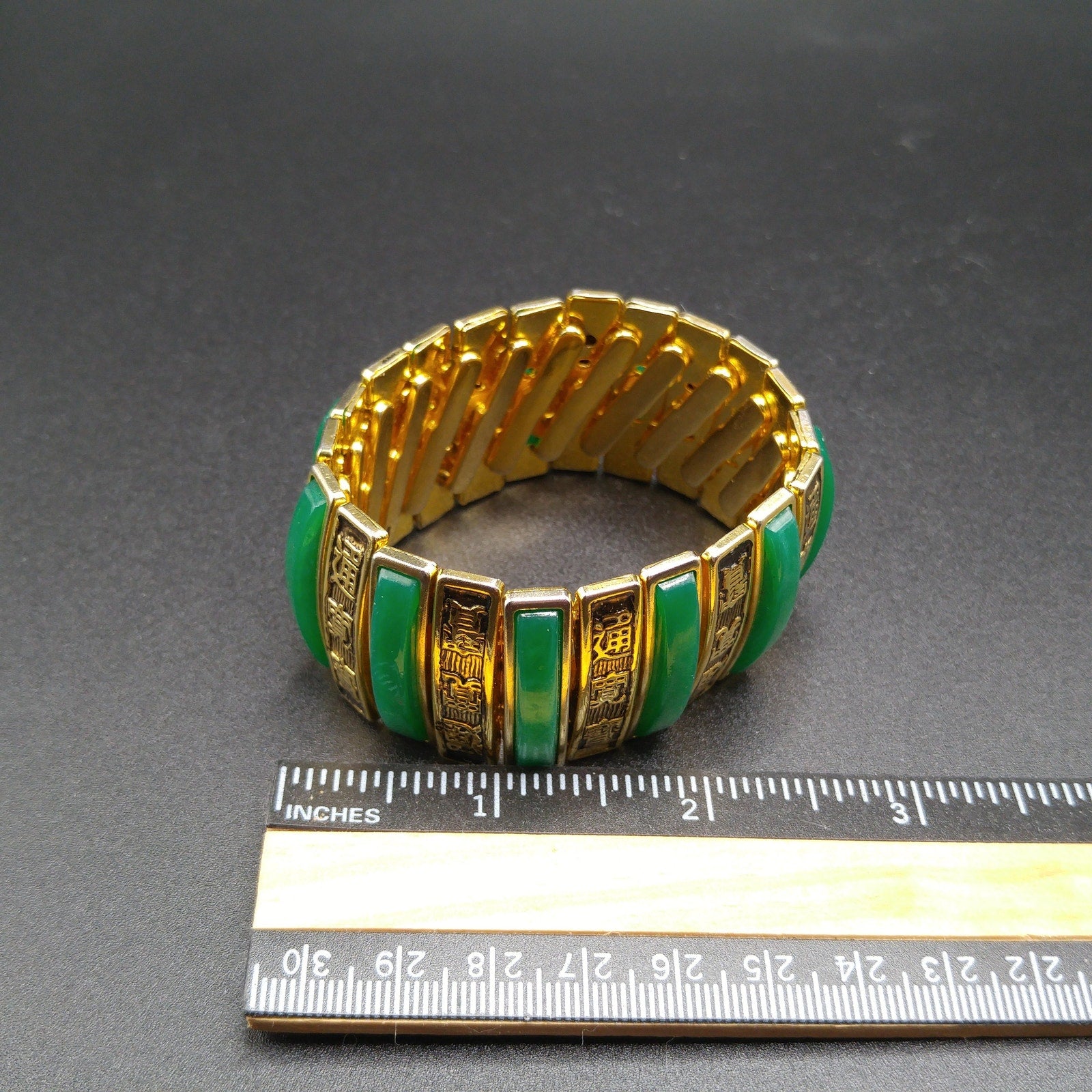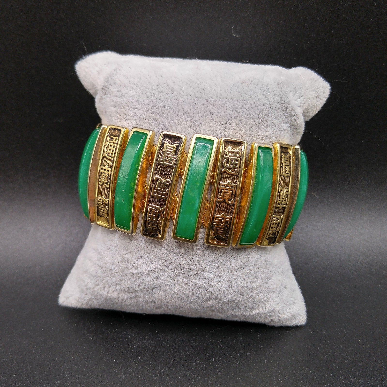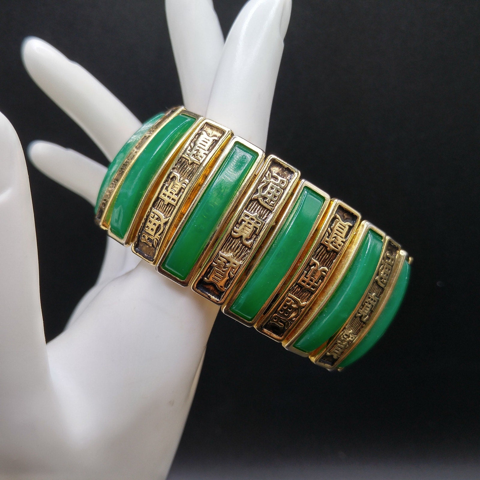 *Description: This is a beautiful Asian inspired expansion bracelet with writing on every other panel and green Lucite on the other panels from the 1960s. There is black enamel behind the Asian writing to enhance the design. The bracelet is in very good condition. There is a bit of black enamel which is on the back and had to have been there originally. The bracelet itself looks to have rarely, if ever, been worn. This would be a great addition to your vintage jewelry collection or make a great vintage gift!