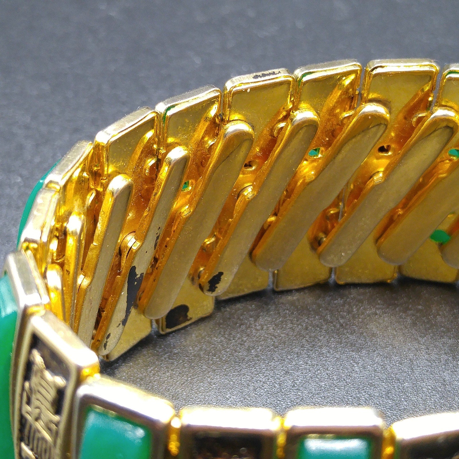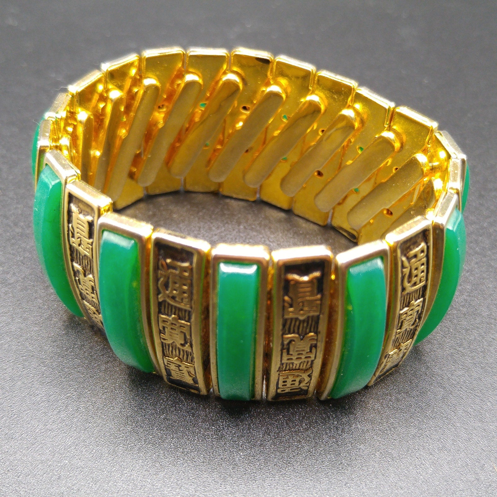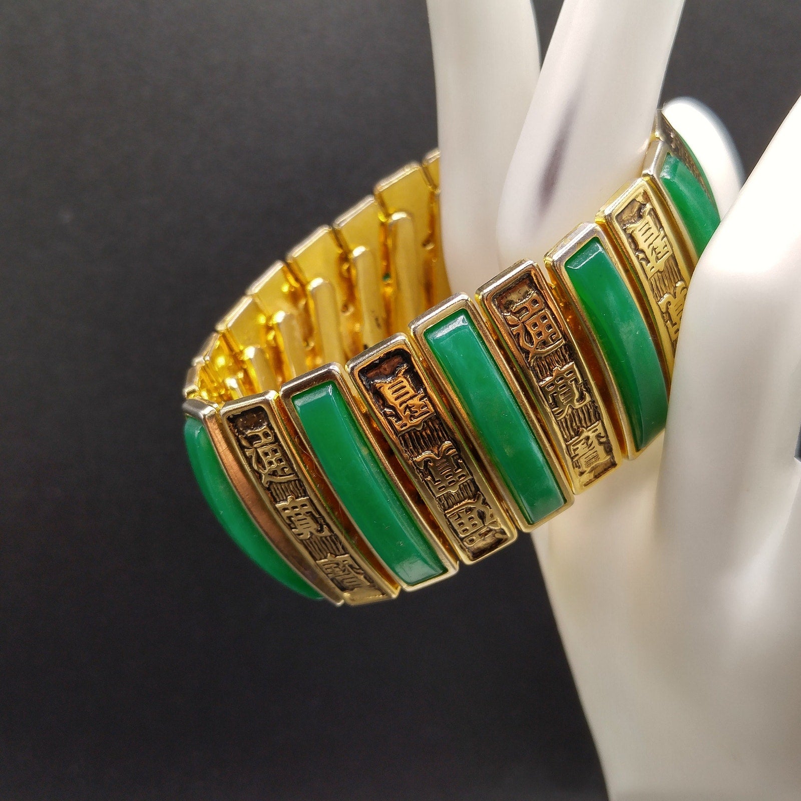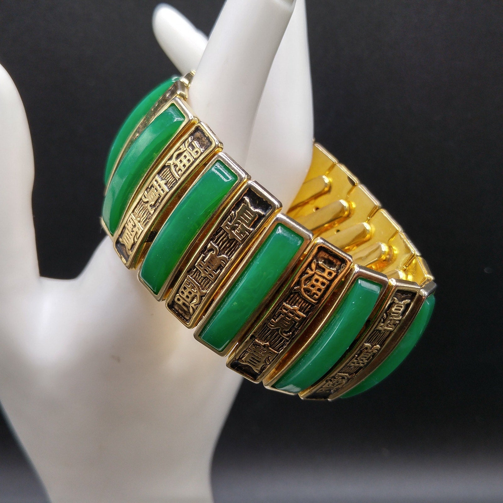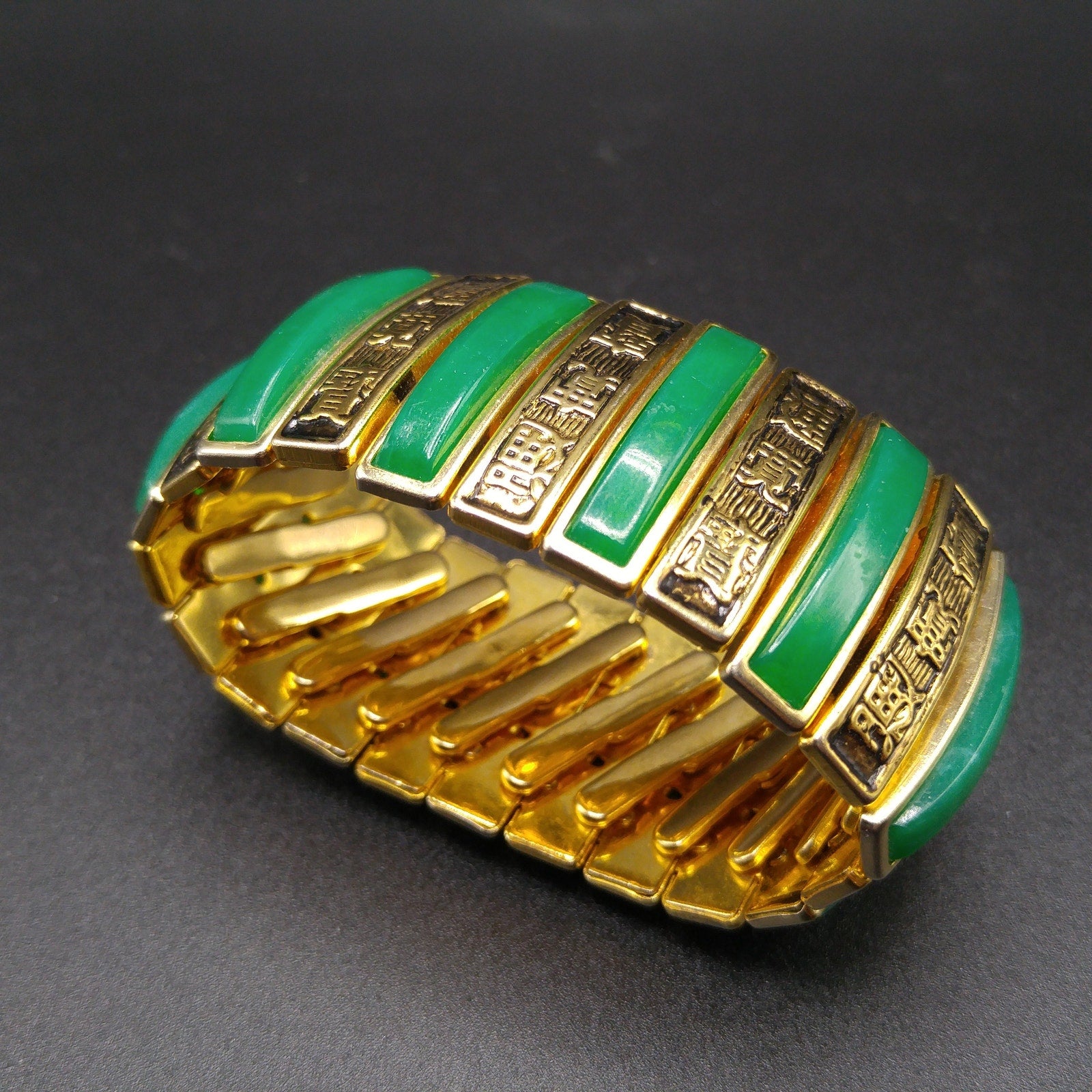 *Description: This is a beautiful Asian inspired expansion bracelet with writing on every other panel and green Lucite on the other panels from the 1960s. There is black enamel behind the Asian writing to enhance the design. The bracelet is in very good condition. There is a bit of black enamel which is on the back and had to have been there originally. The bracelet itself looks to have rarely, if ever, been worn. This would be a great addition to your vintage jewelry collection or make a great vintage gift!