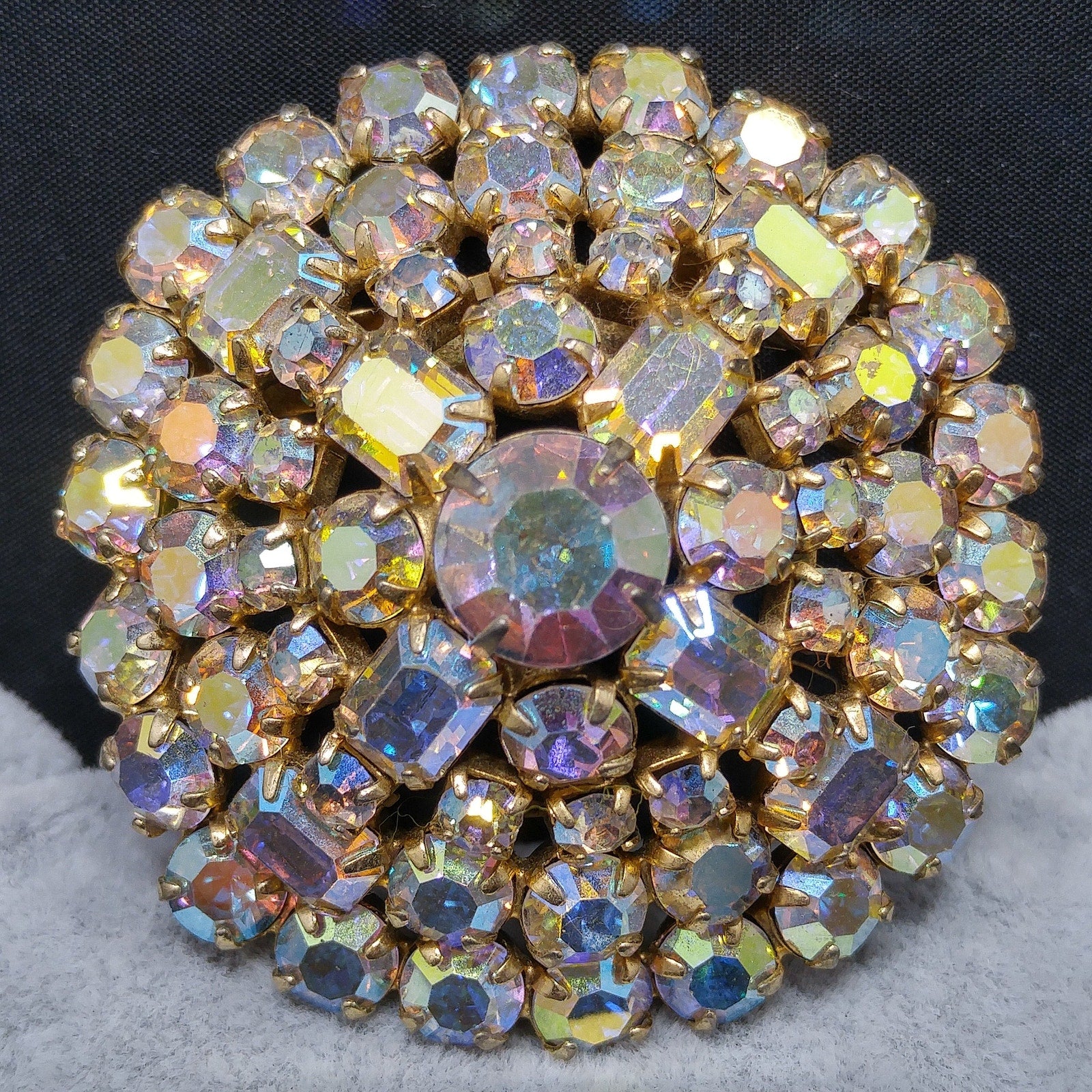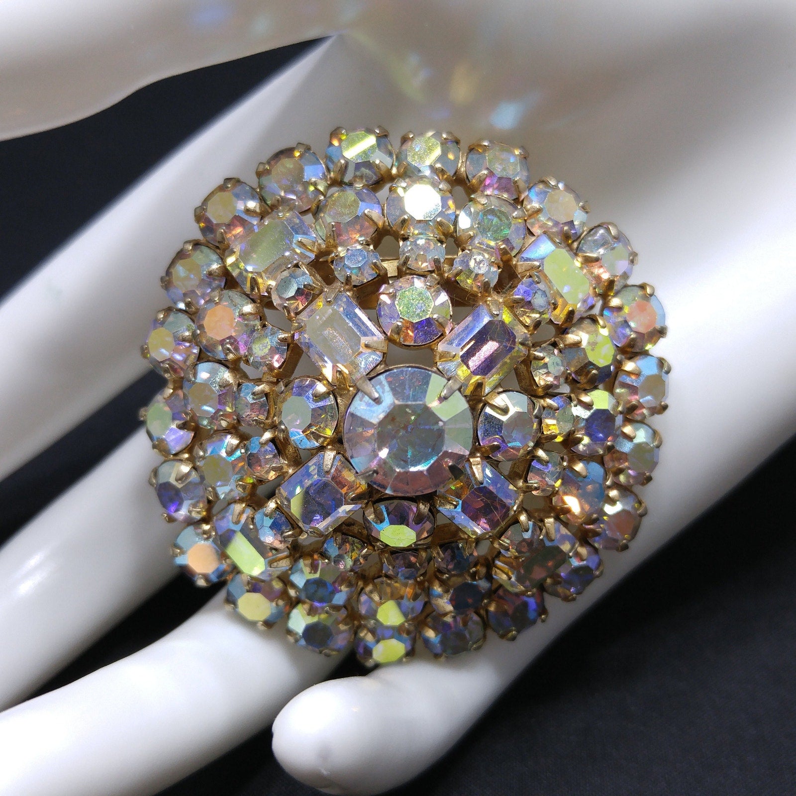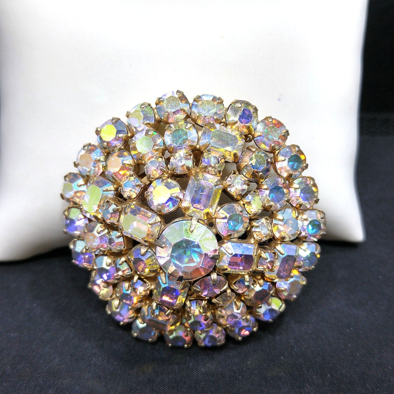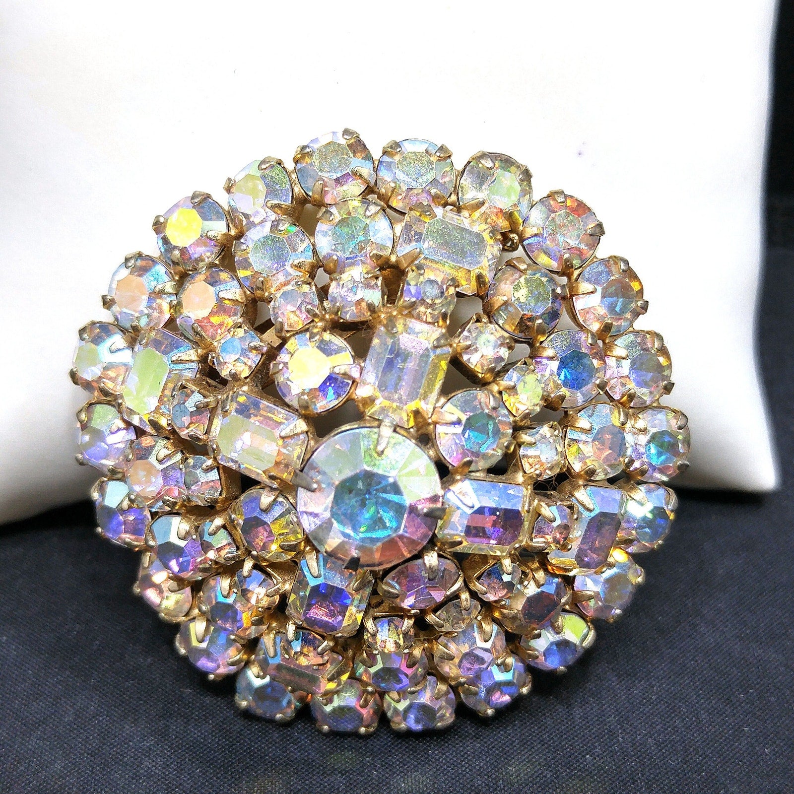 *Description: This is a beautiful mid-century aurora borealis clear rhinestone domed brooch with emerald cut and chaton cut rhinestones from the 1960s. The brooch is on a gold tone background. This would be a great addition to your vintage jewelry collection or make a great vintage gift!