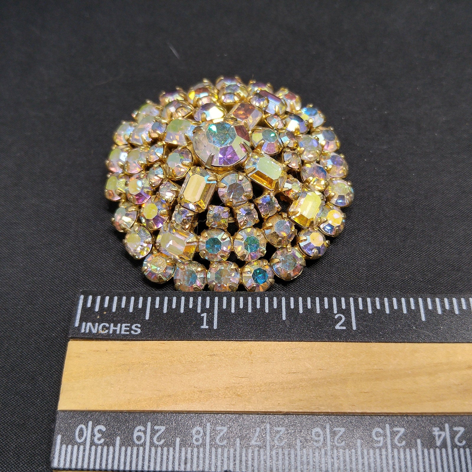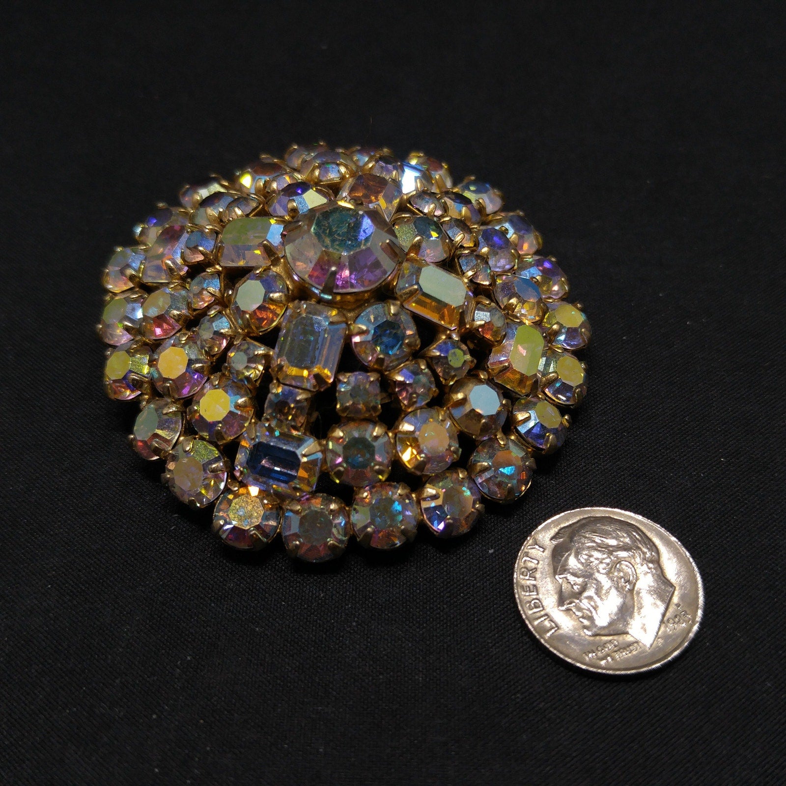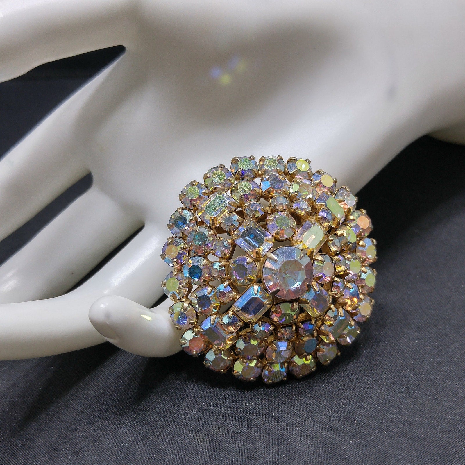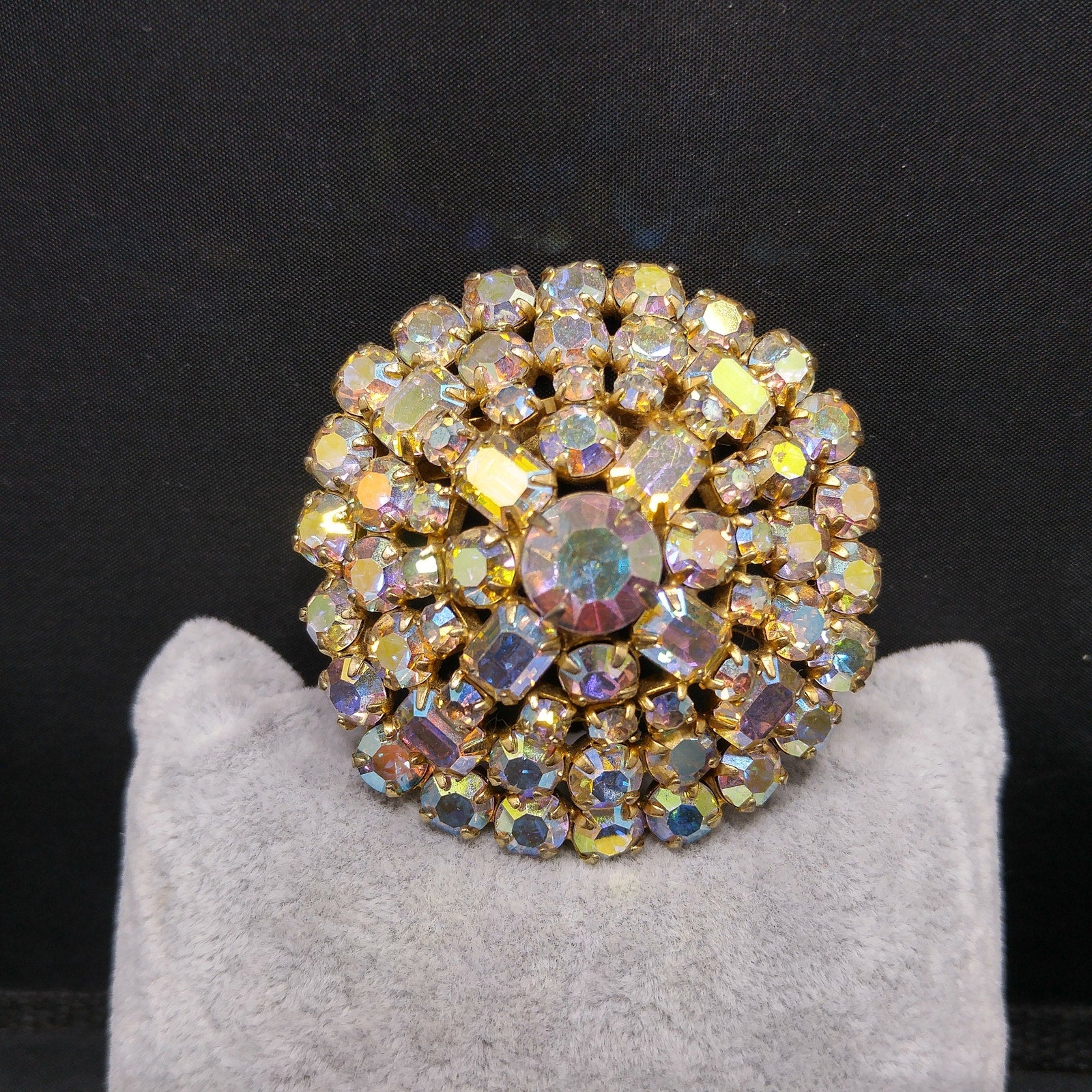 *Description: This is a beautiful mid-century aurora borealis clear rhinestone domed brooch with emerald cut and chaton cut rhinestones from the 1960s. The brooch is on a gold tone background. This would be a great addition to your vintage jewelry collection or make a great vintage gift!