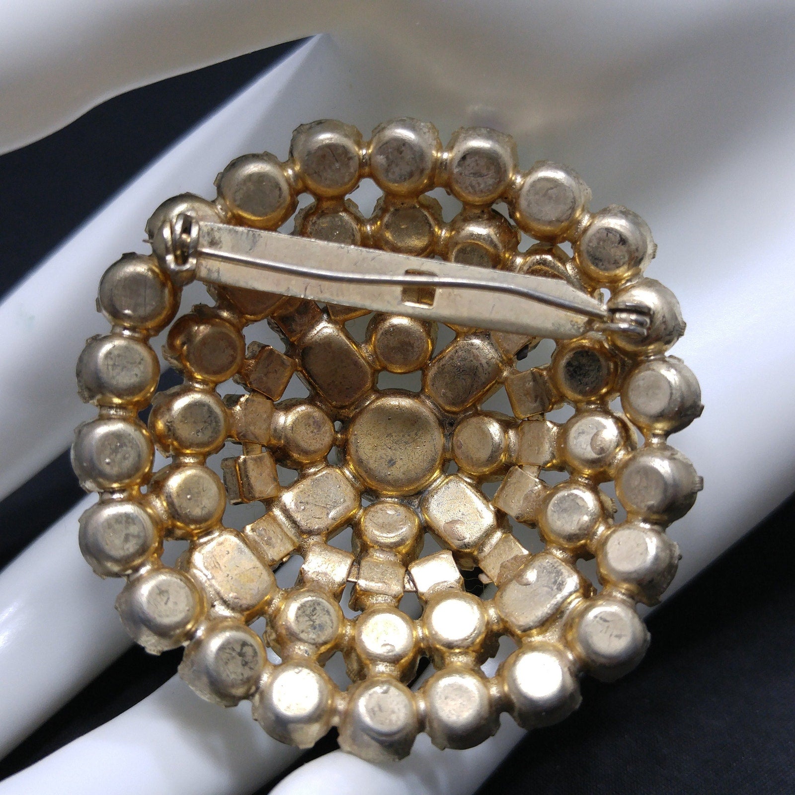 *Condition: Great vintage condition on the front. The gold plated backing has quite a bit of wear and the pin is slightly bent however the front is gorgeous and all rhinestones are present. Will see signs of wear under magnification. See photos for details.