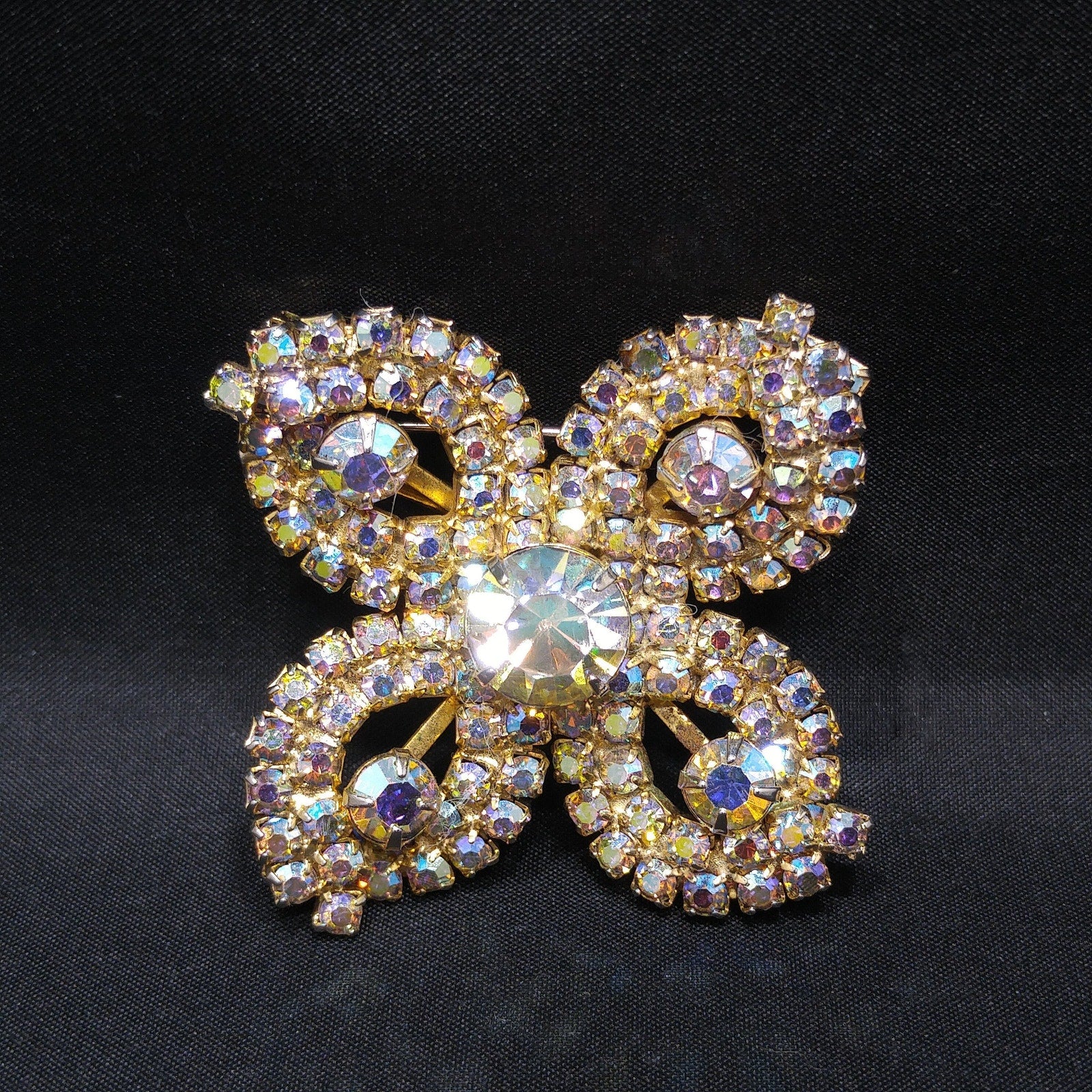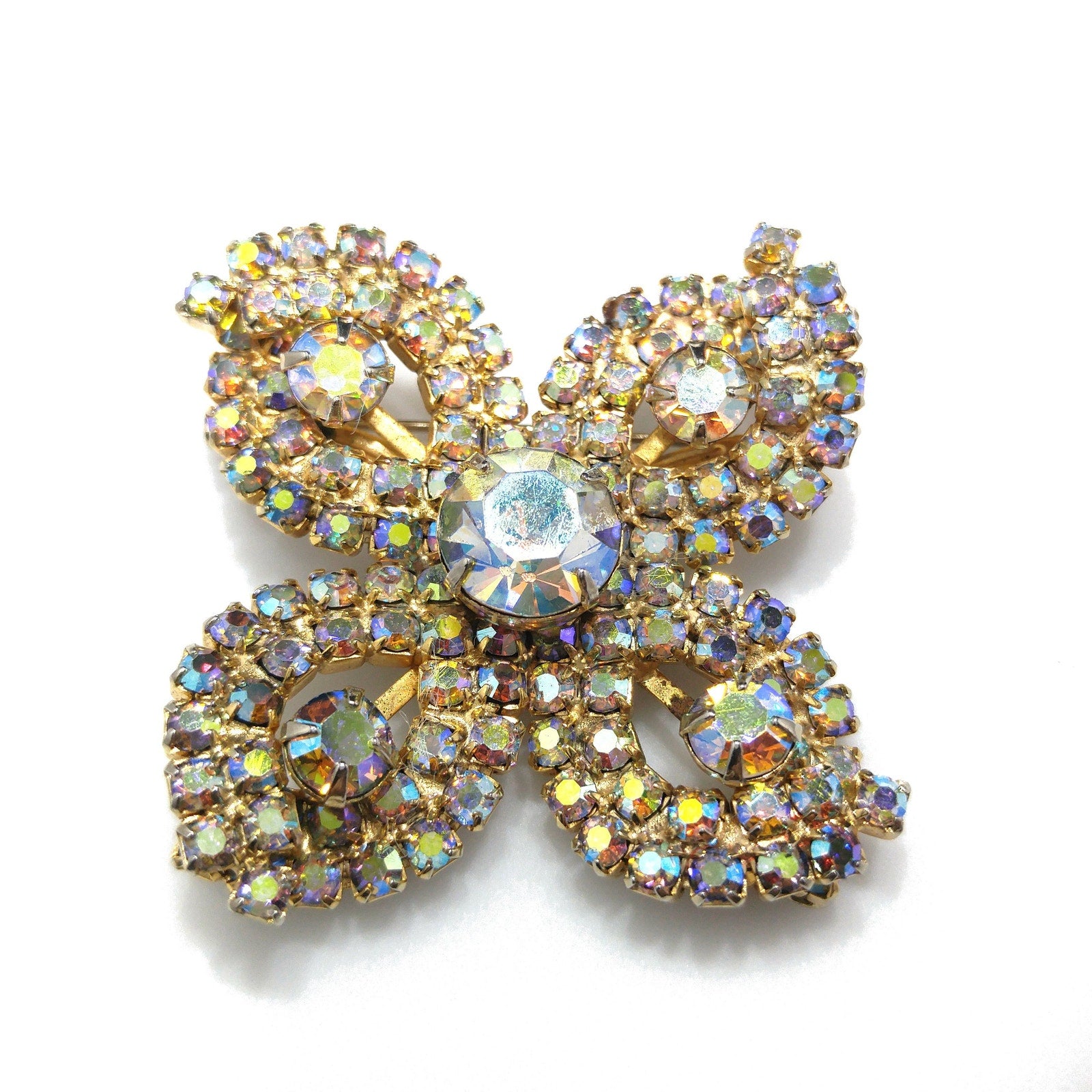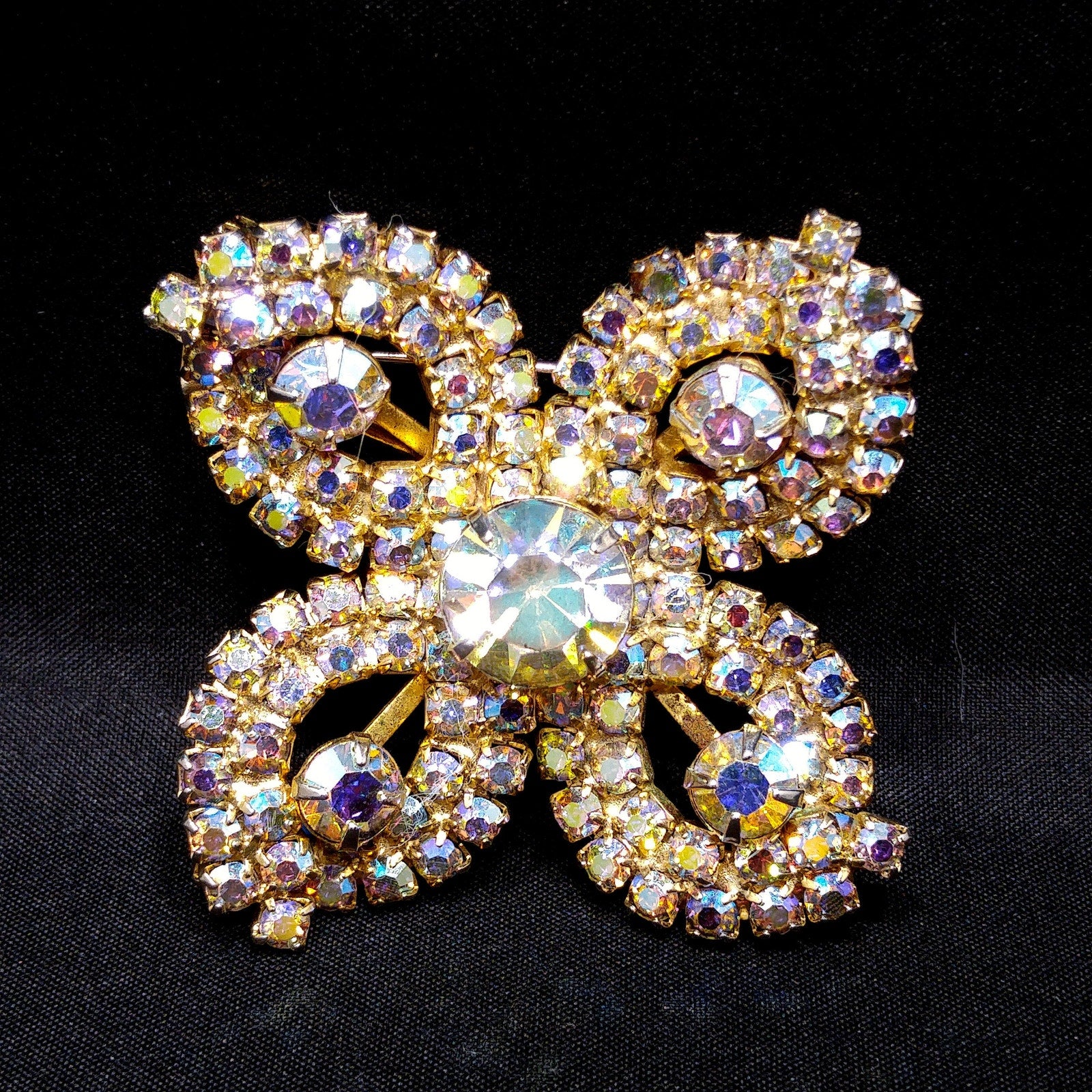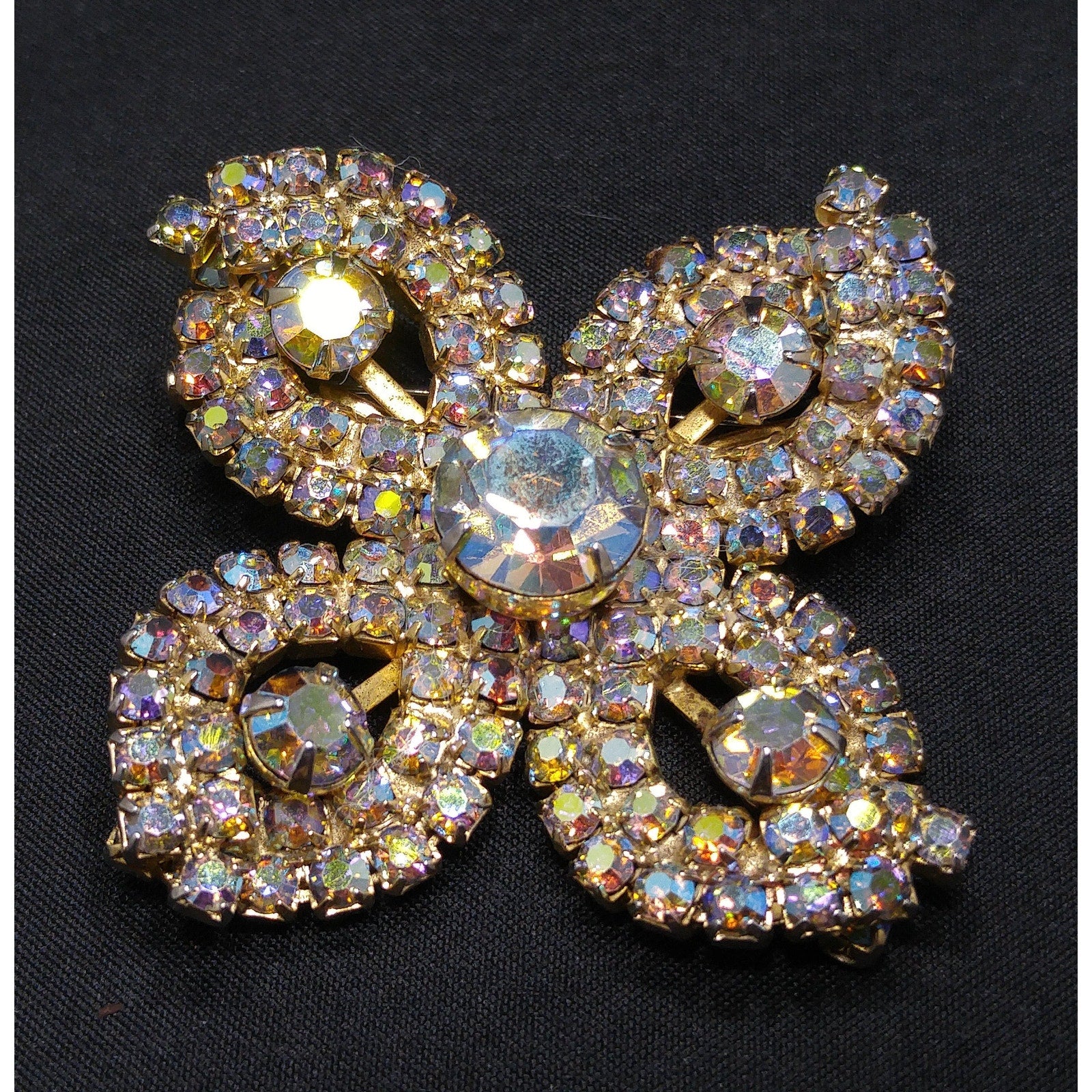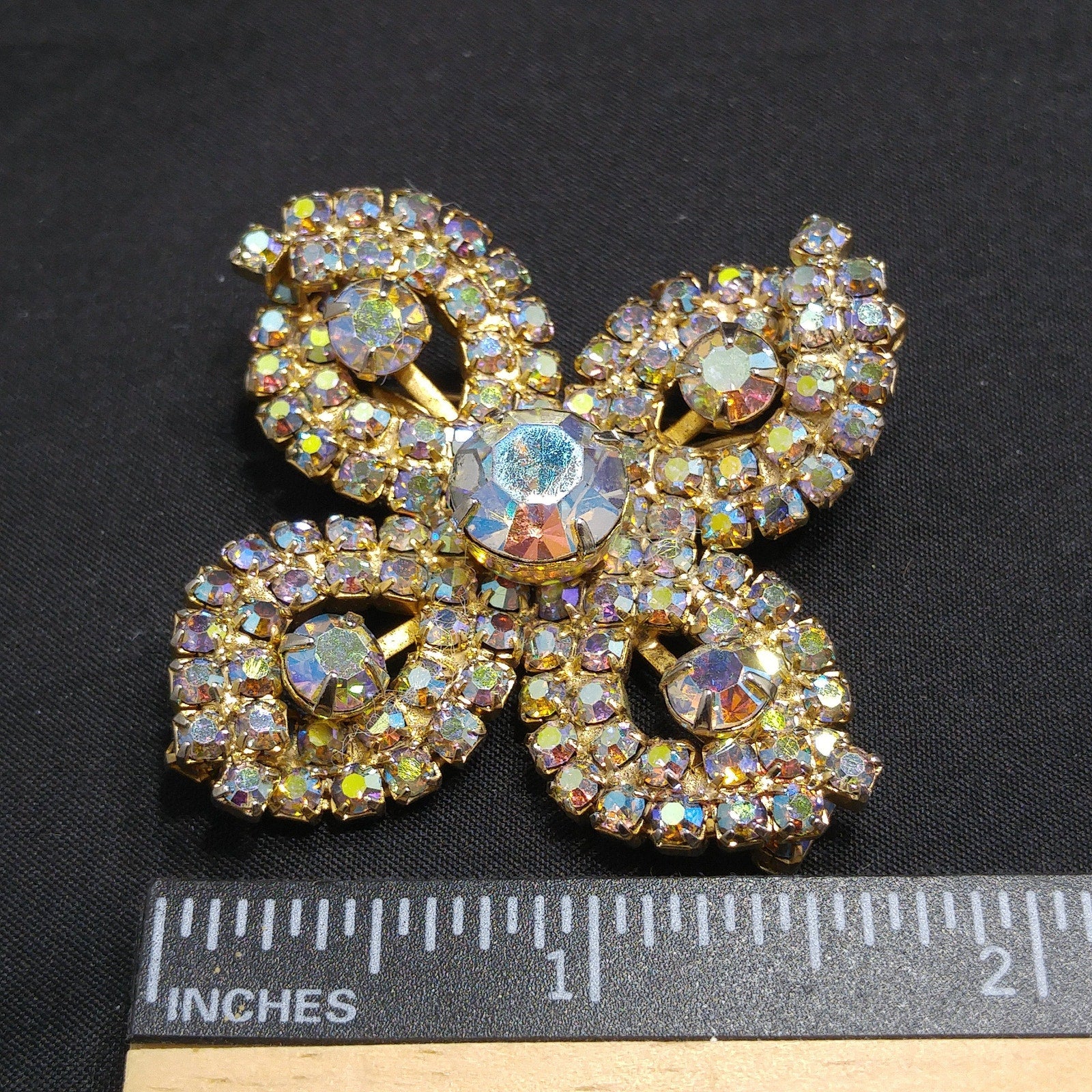*Description: This is a gorgeous aurora borealis rhinestone floral brooch from the 1960s. The rhinestones are set on a gold plated backing and each of the rhinestones are prong set. This brooch would be beautiful at a wedding or any formal event. This would be a great addition to your vintage jewelry collection or make a great vintage gift!