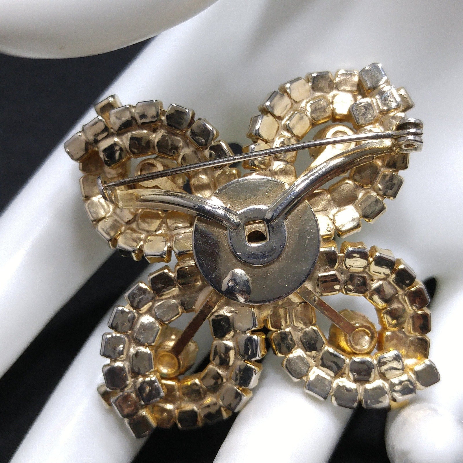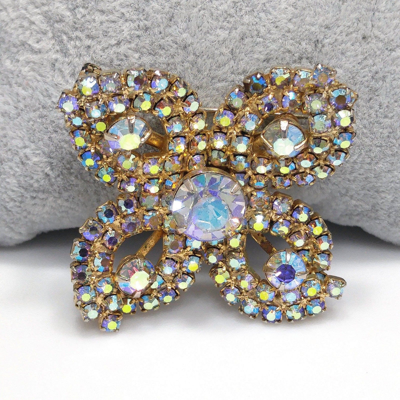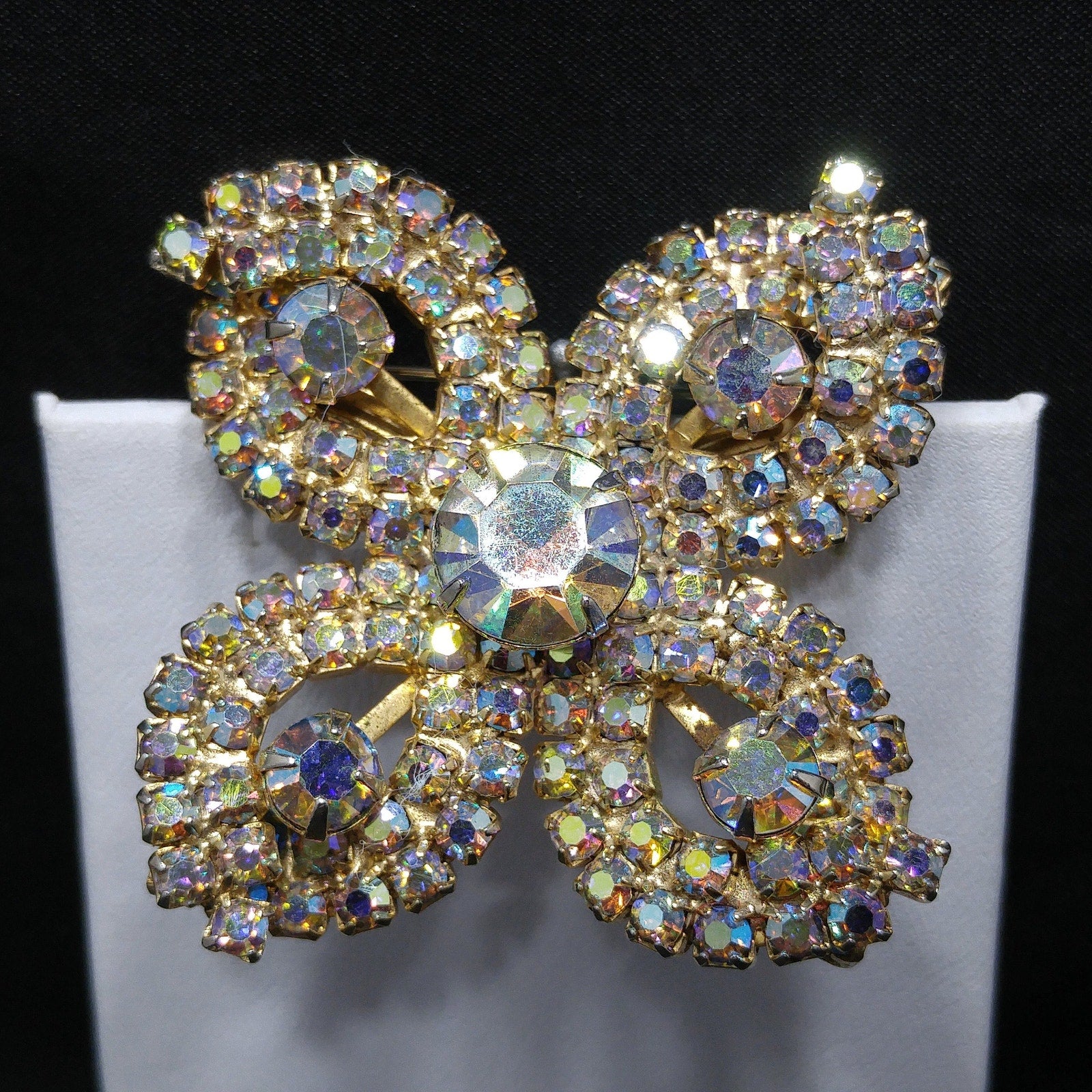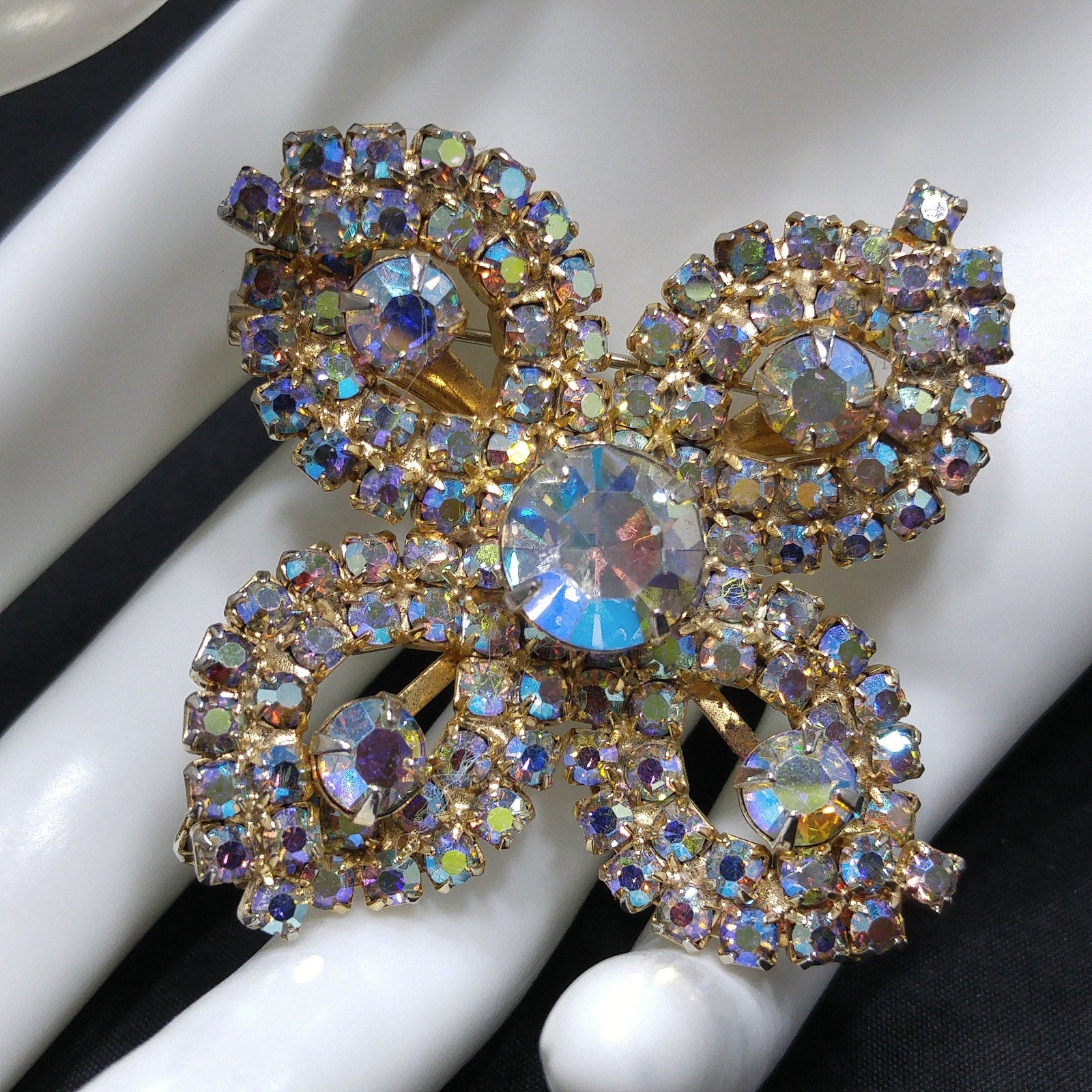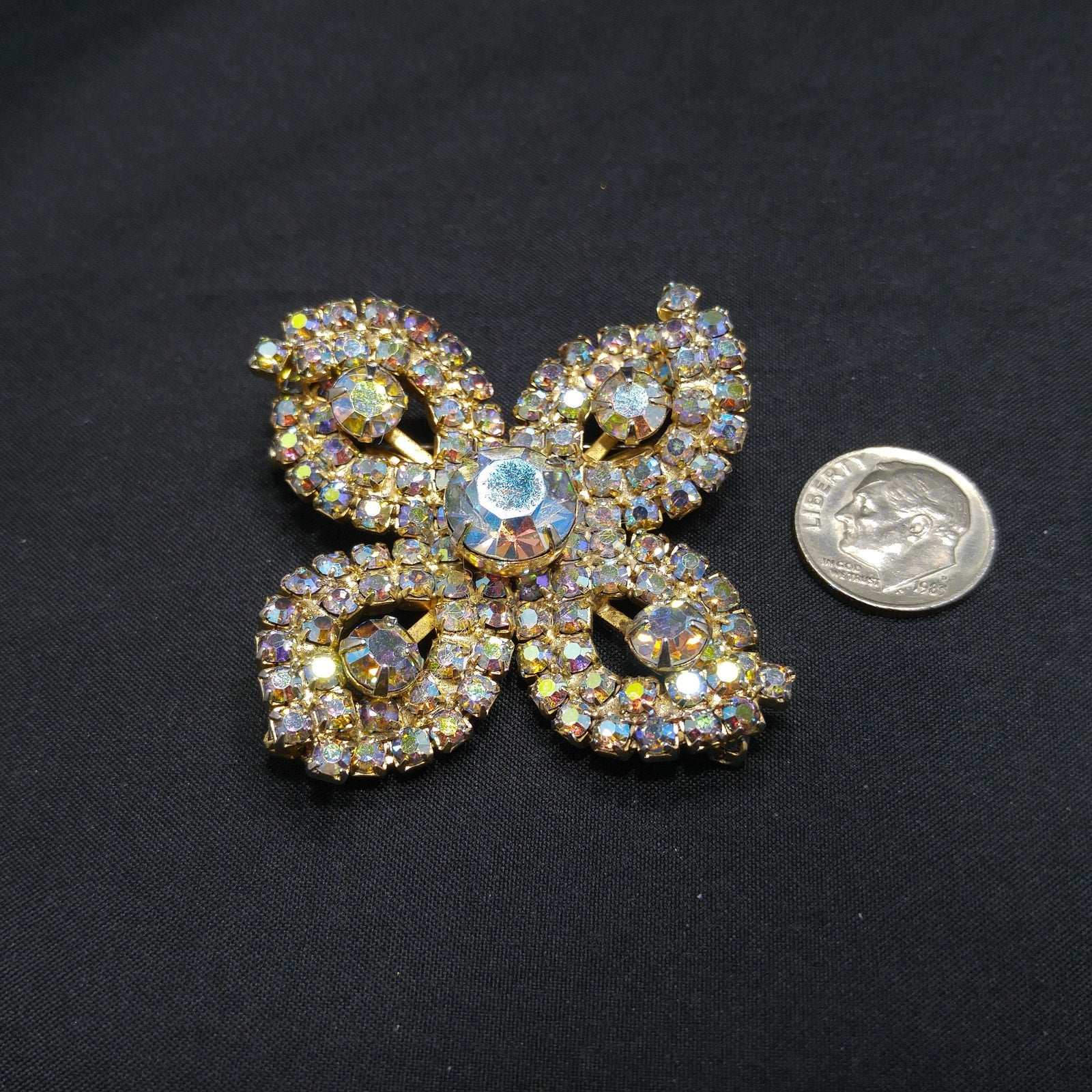 *Description: This is a gorgeous aurora borealis rhinestone floral brooch from the 1960s. The rhinestones are set on a gold plated backing and each of the rhinestones are prong set. This brooch would be beautiful at a wedding or any formal event. This would be a great addition to your vintage jewelry collection or make a great vintage gift!
