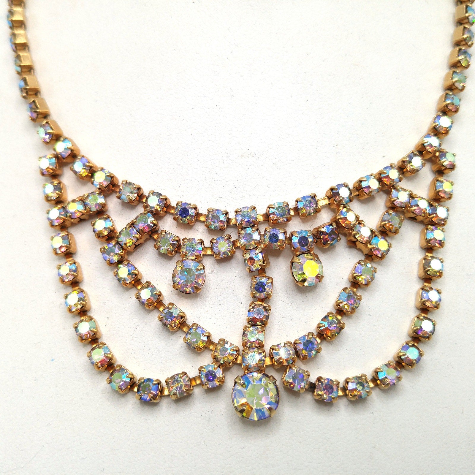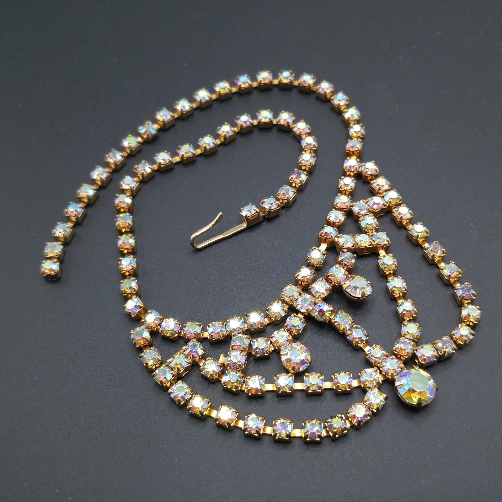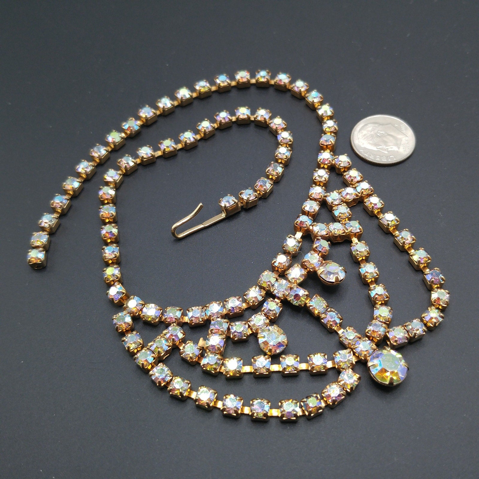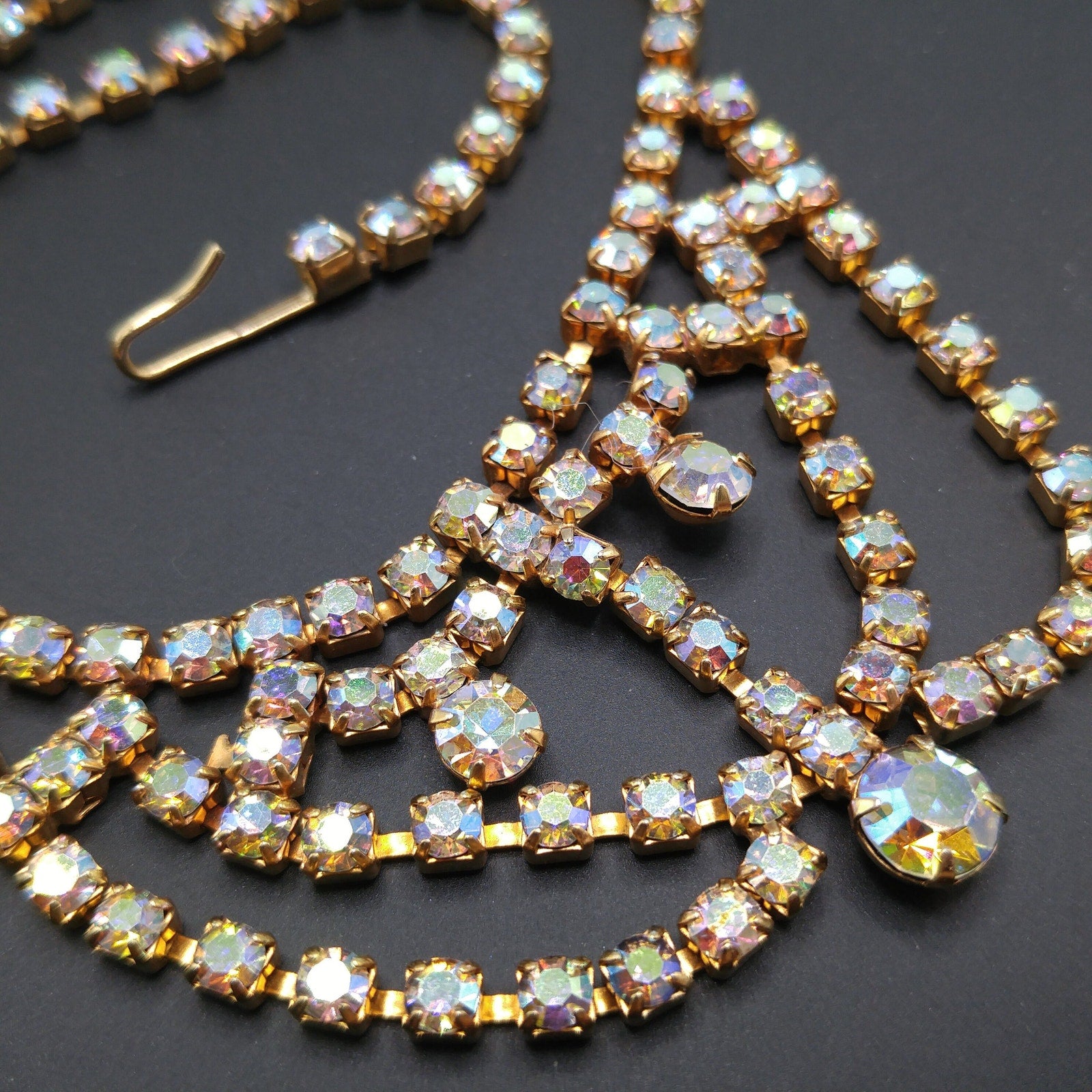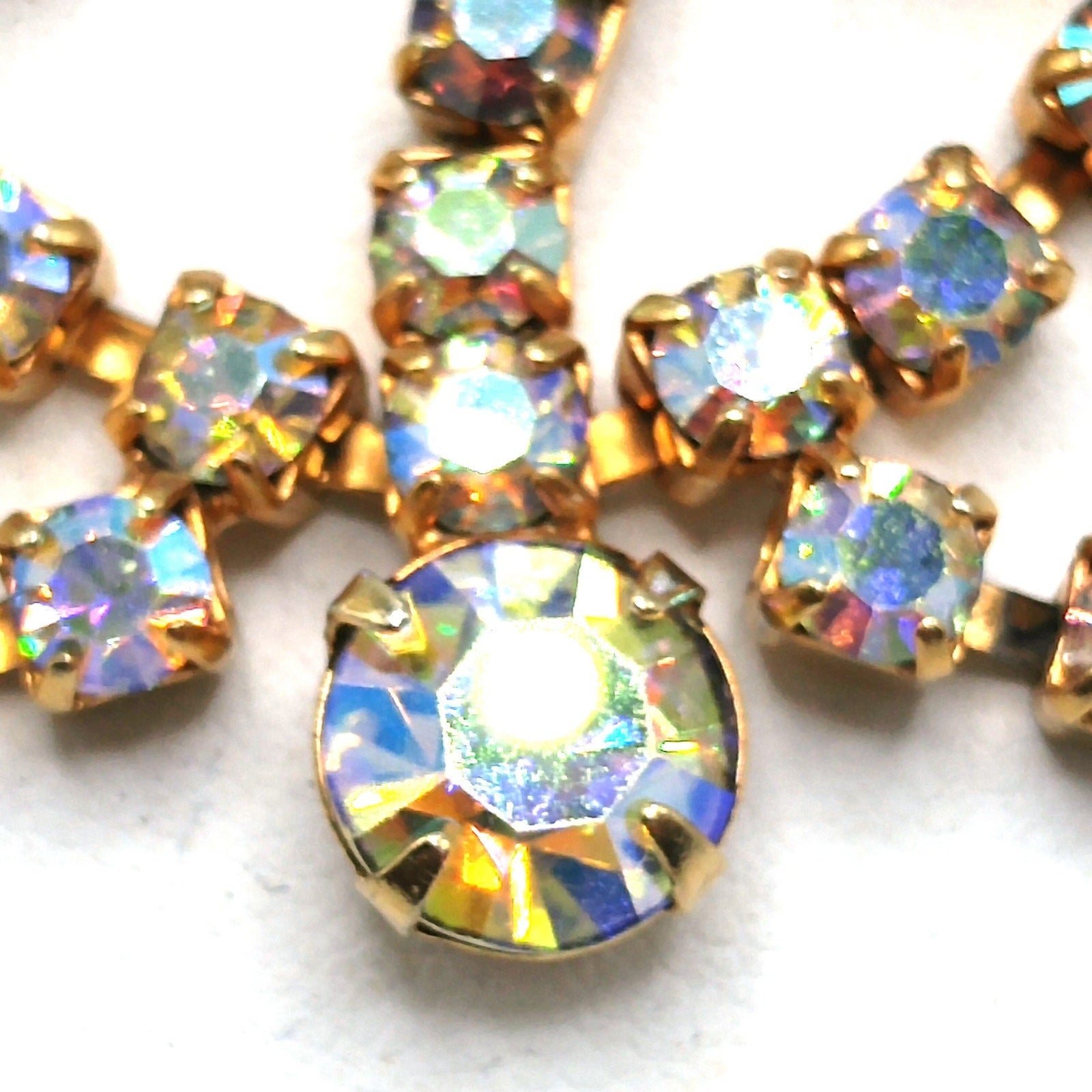 *Description: This is a beautiful mid-century aurora borealis rhinestone choker necklace from the late 1950s to 1960s. Each rhinestone is prong set on a gold plated background with a hook clasp. The size is small to medium with the longest length at 14 1/2 Inches. Each rhinestone is full of sparkle and would look beautiful at any formal event. This would be a great addition to your vintage jewelry collection or make a great vintage gift!