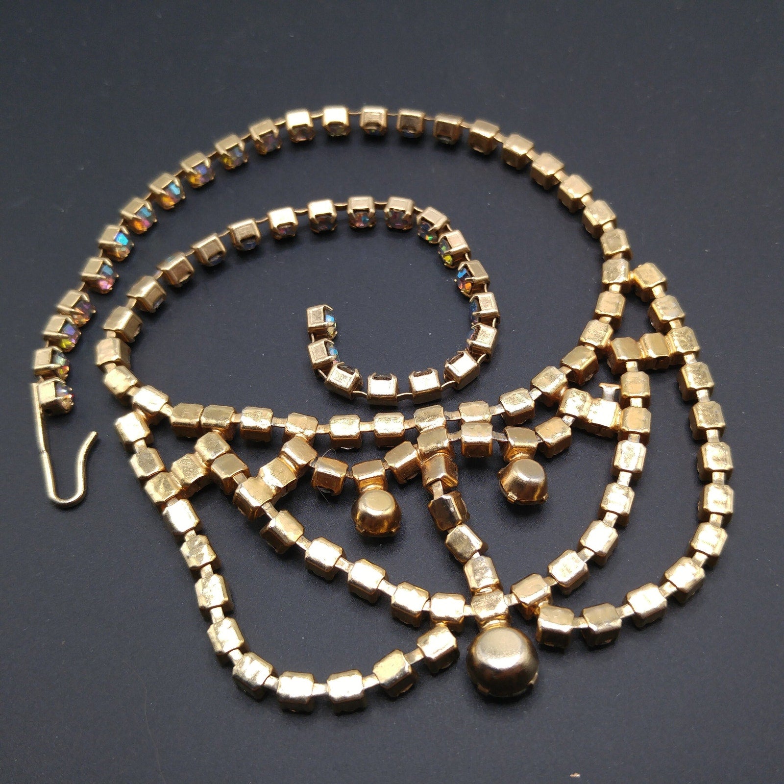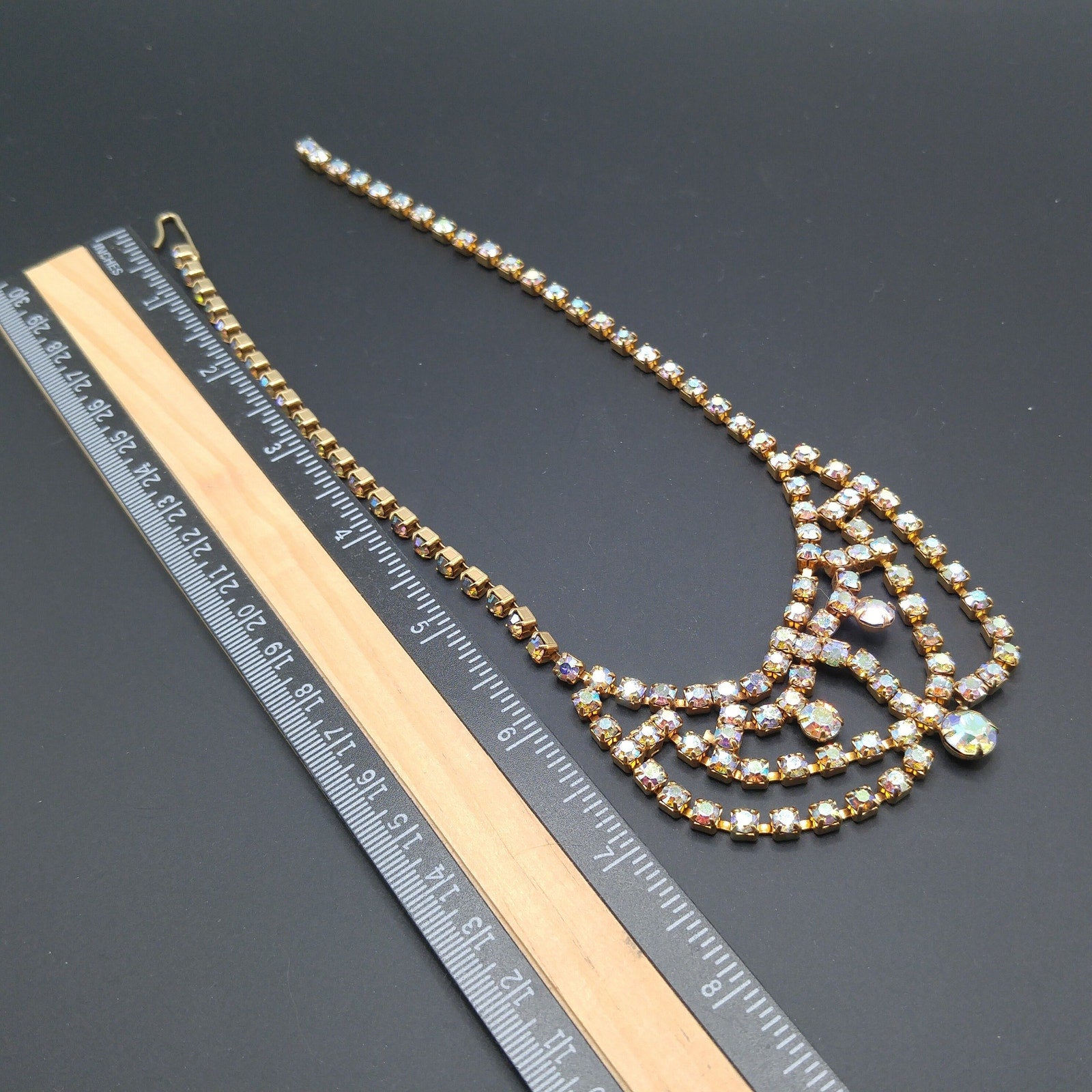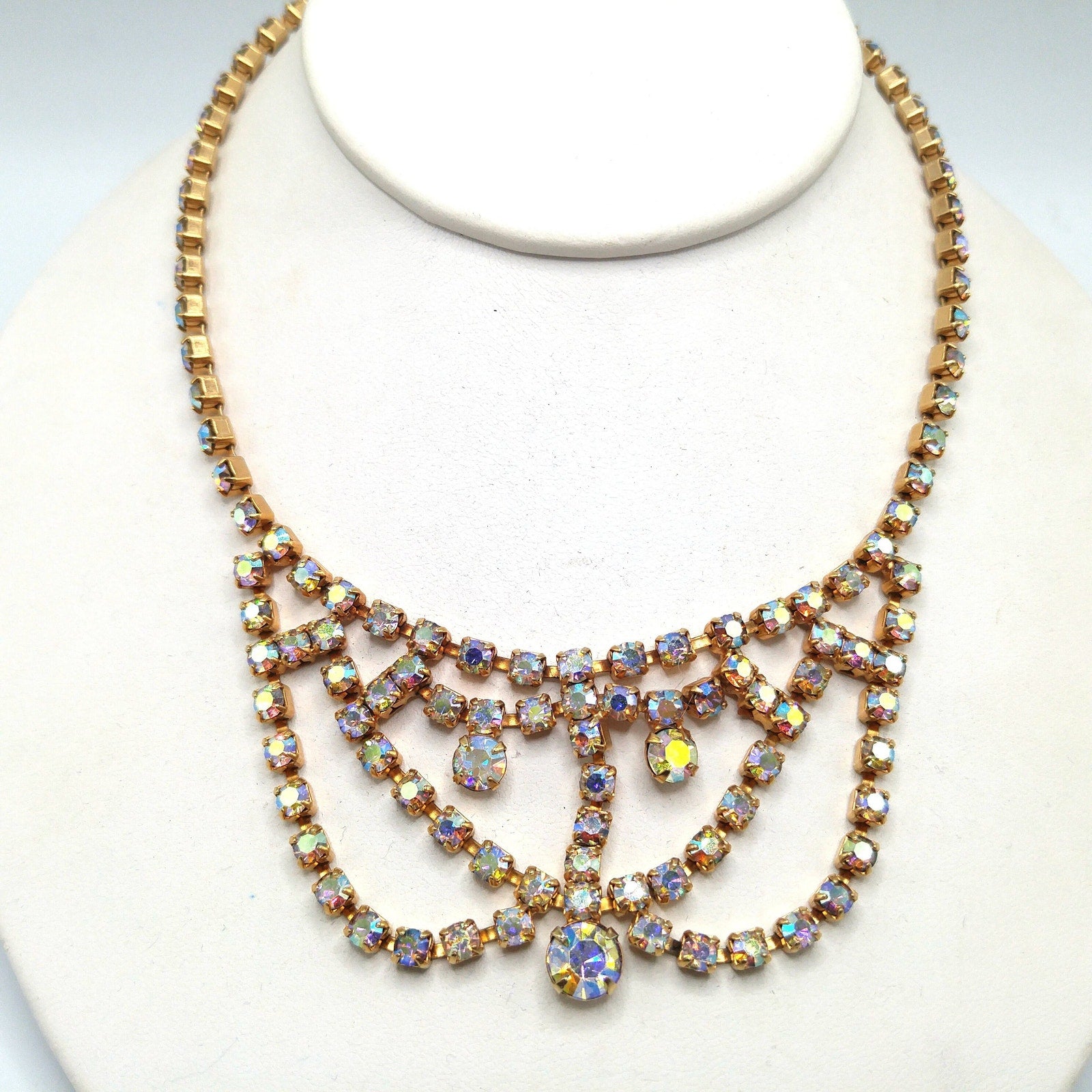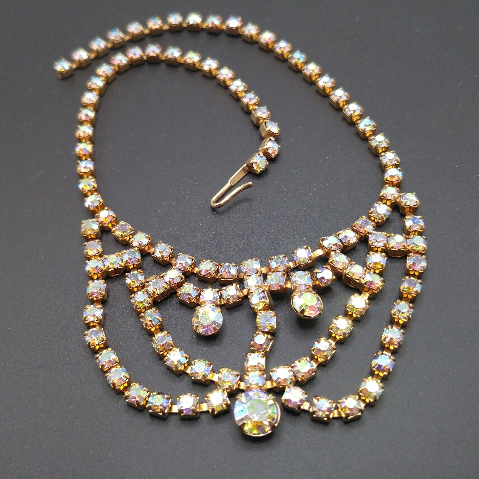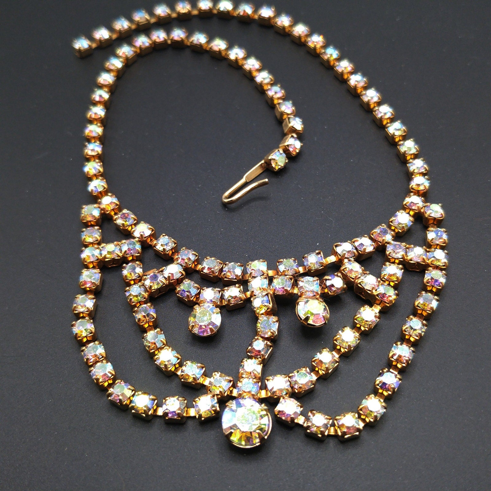 *Description: This is a beautiful mid-century aurora borealis rhinestone choker necklace from the late 1950s to 1960s. Each rhinestone is prong set on a gold plated background with a hook clasp. The size is small to medium with the longest length at 14 1/2 Inches. Each rhinestone is full of sparkle and would look beautiful at any formal event. This would be a great addition to your vintage jewelry collection or make a great vintage gift!