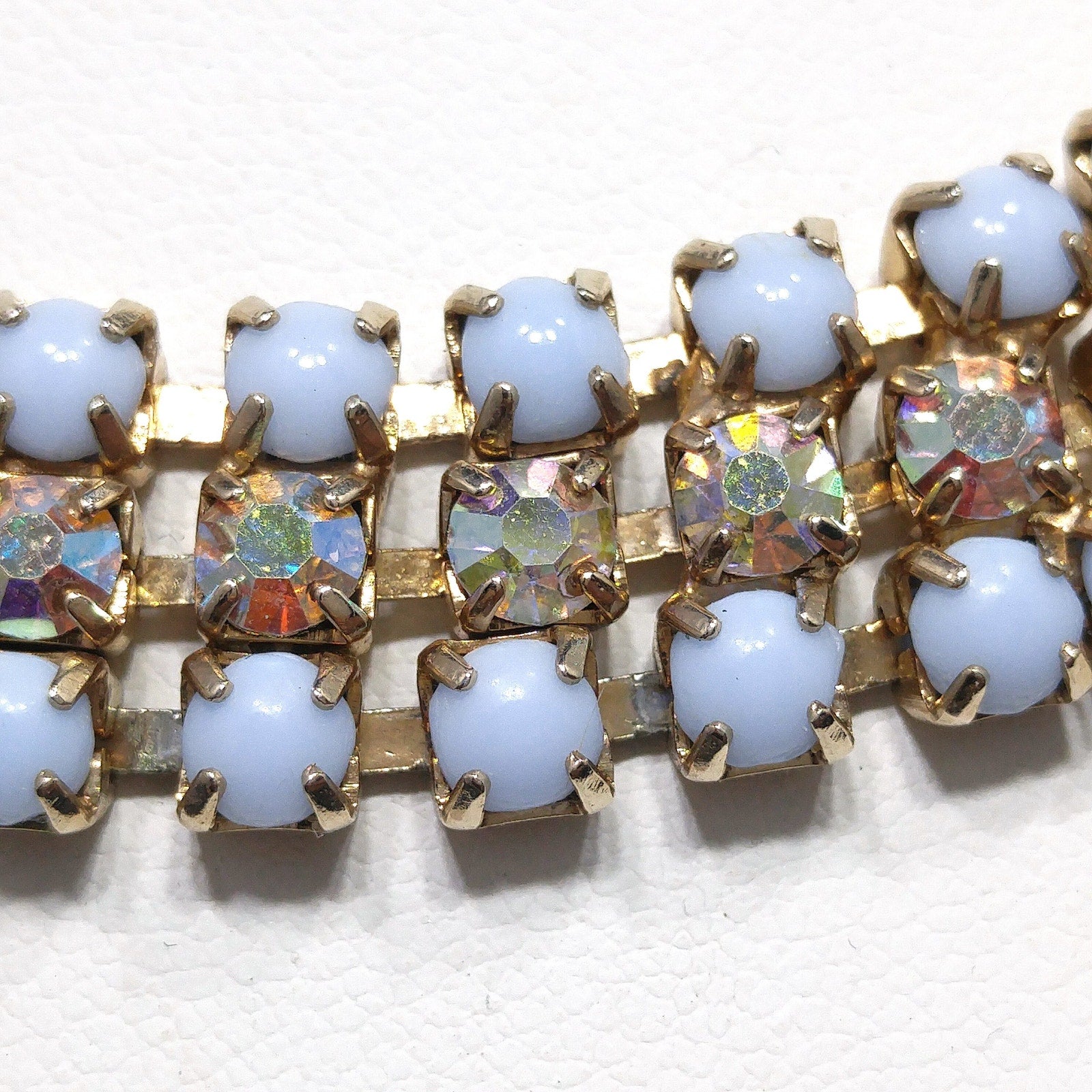 Aurora Borealis Rhinestone Necklace Earrings Set, Light Blue Cabochons, Mid Century, 1960s Vintage Jewelry