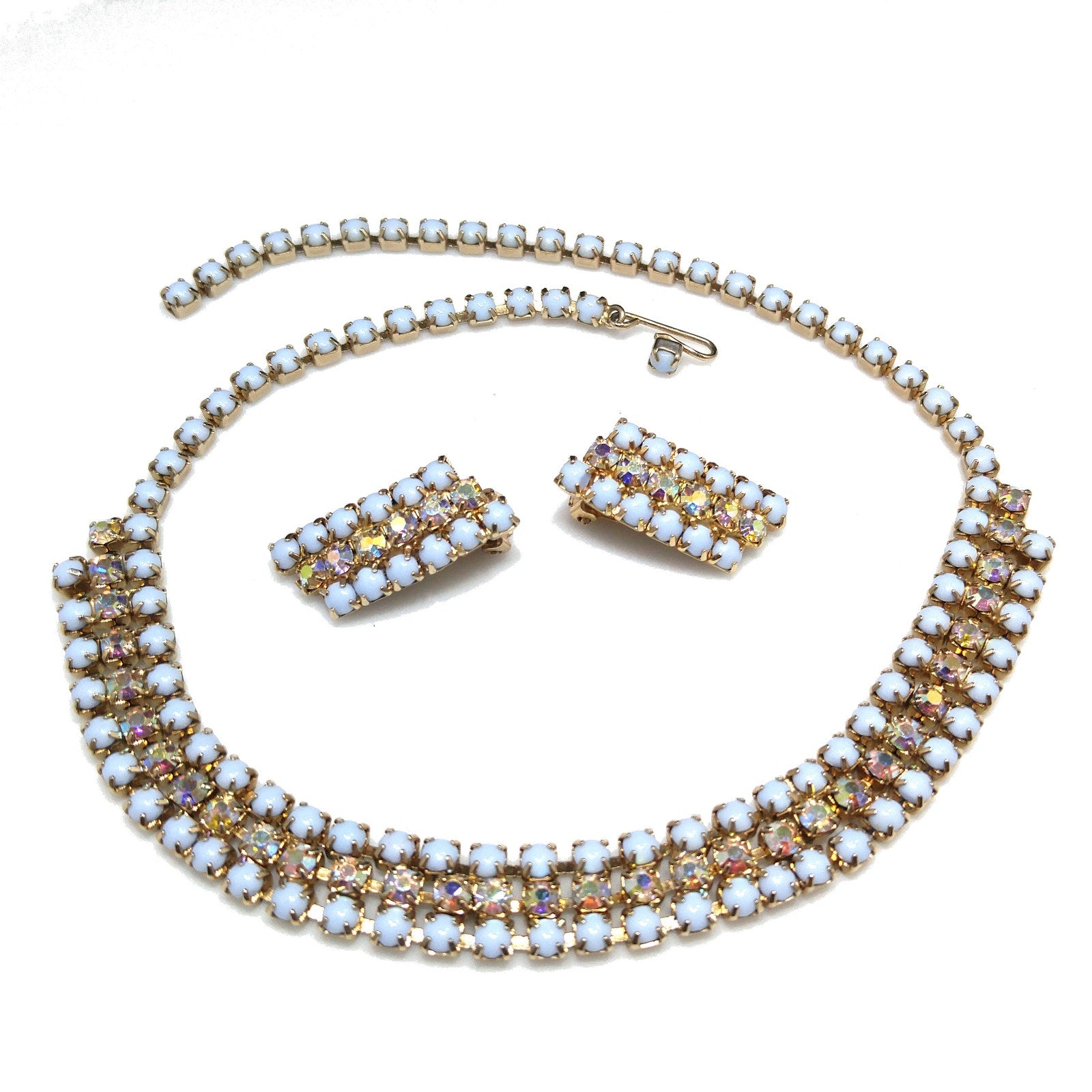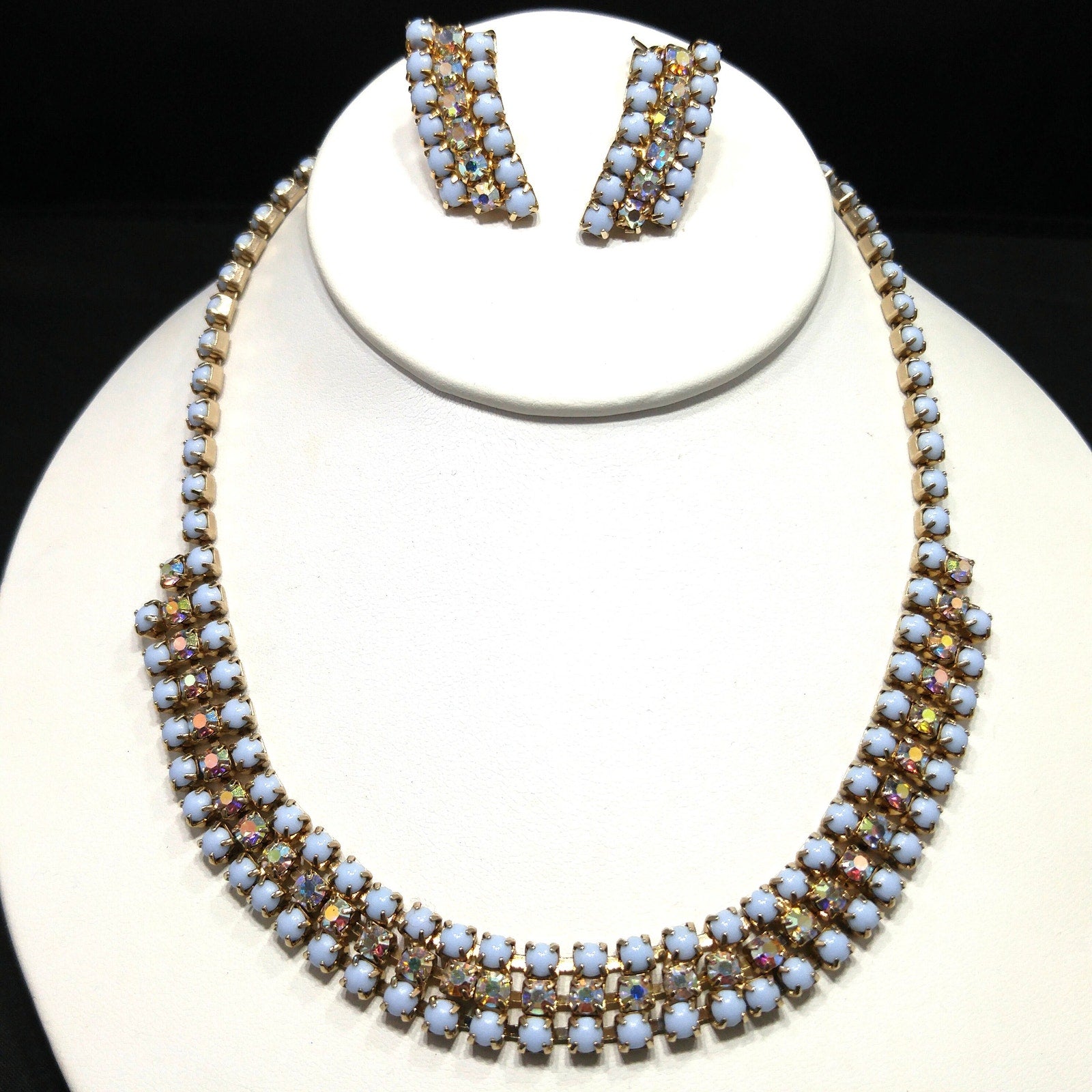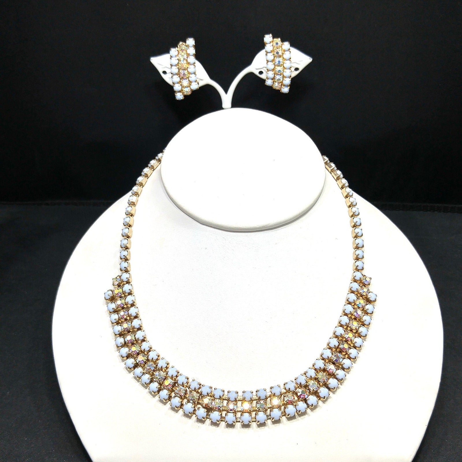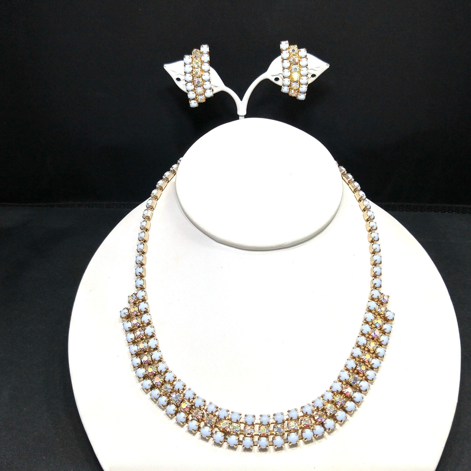 *Description: This is a beautiful mid-century necklace and matching clip on earrings from the late 1950s to 1960s. The set has light blue cabochons and aurora borealis rhinestones on a gold plated setting. The necklace has a cabochon on the hook and the earrings are clips. It would make a beautiful set for any special occasion. This would be a great addition to your vintage jewelry collection or make a great vintage gift!