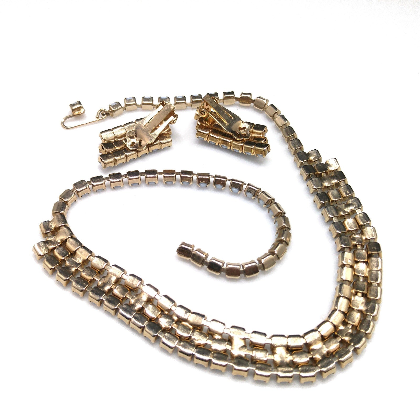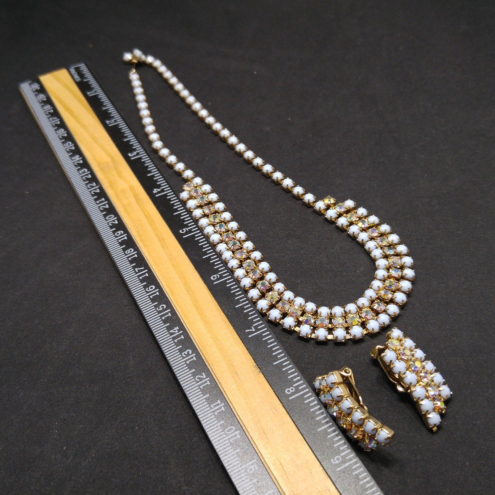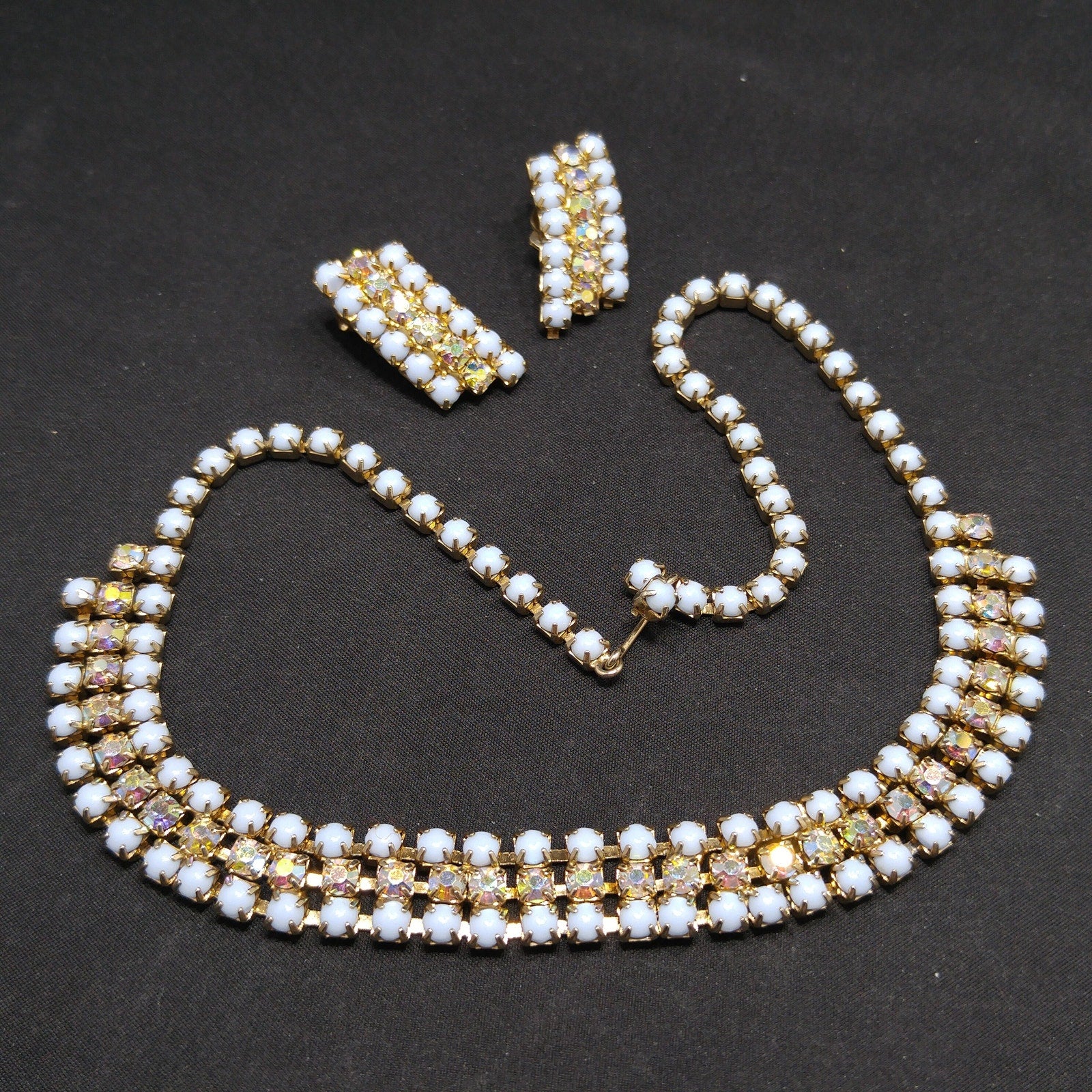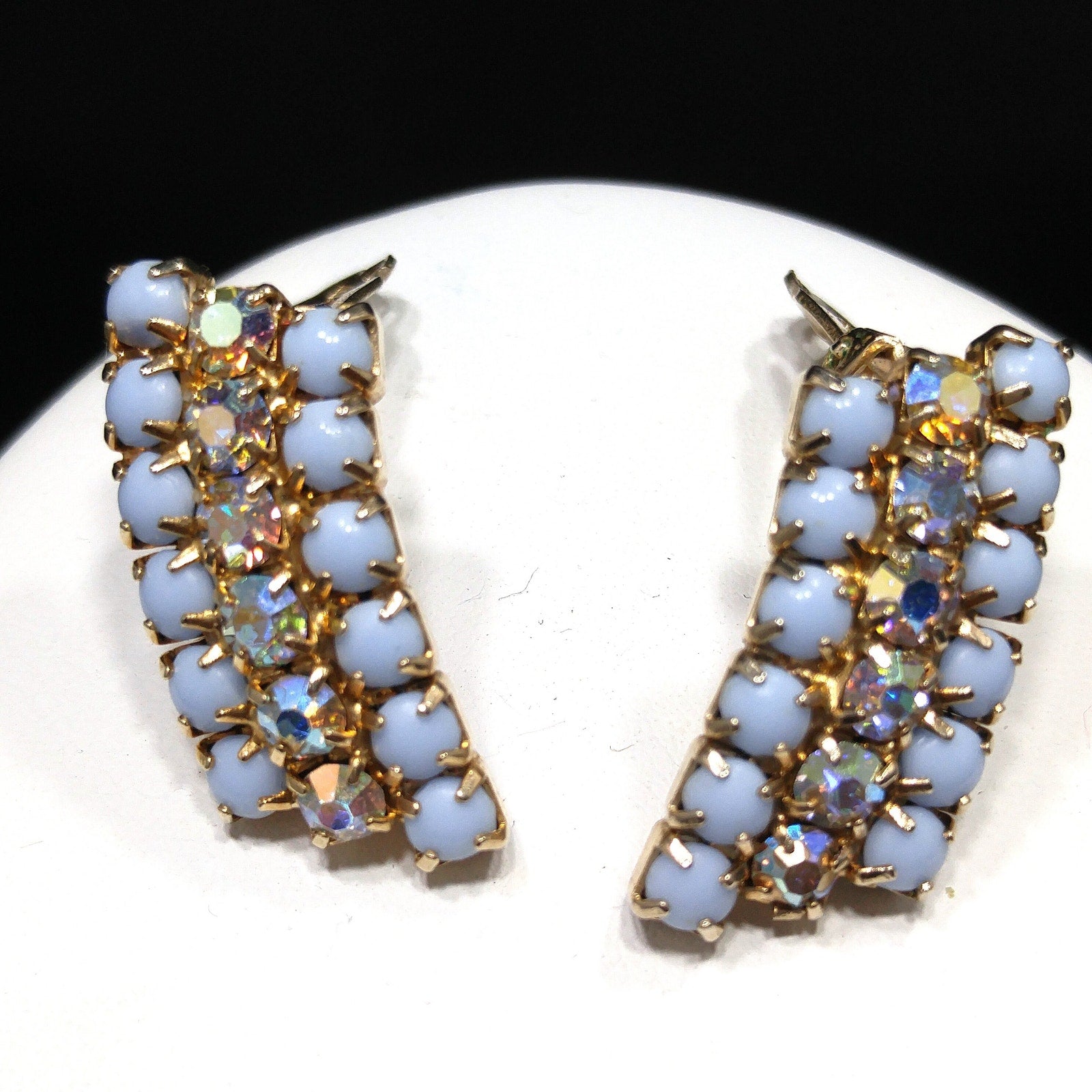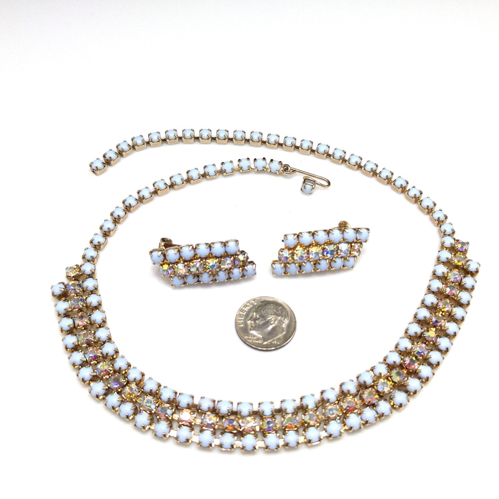 *Description: This is a beautiful mid-century necklace and matching clip on earrings from the late 1950s to 1960s. The set has light blue cabochons and aurora borealis rhinestones on a gold plated setting. The necklace has a cabochon on the hook and the earrings are clips. It would make a beautiful set for any special occasion. This would be a great addition to your vintage jewelry collection or make a great vintage gift!