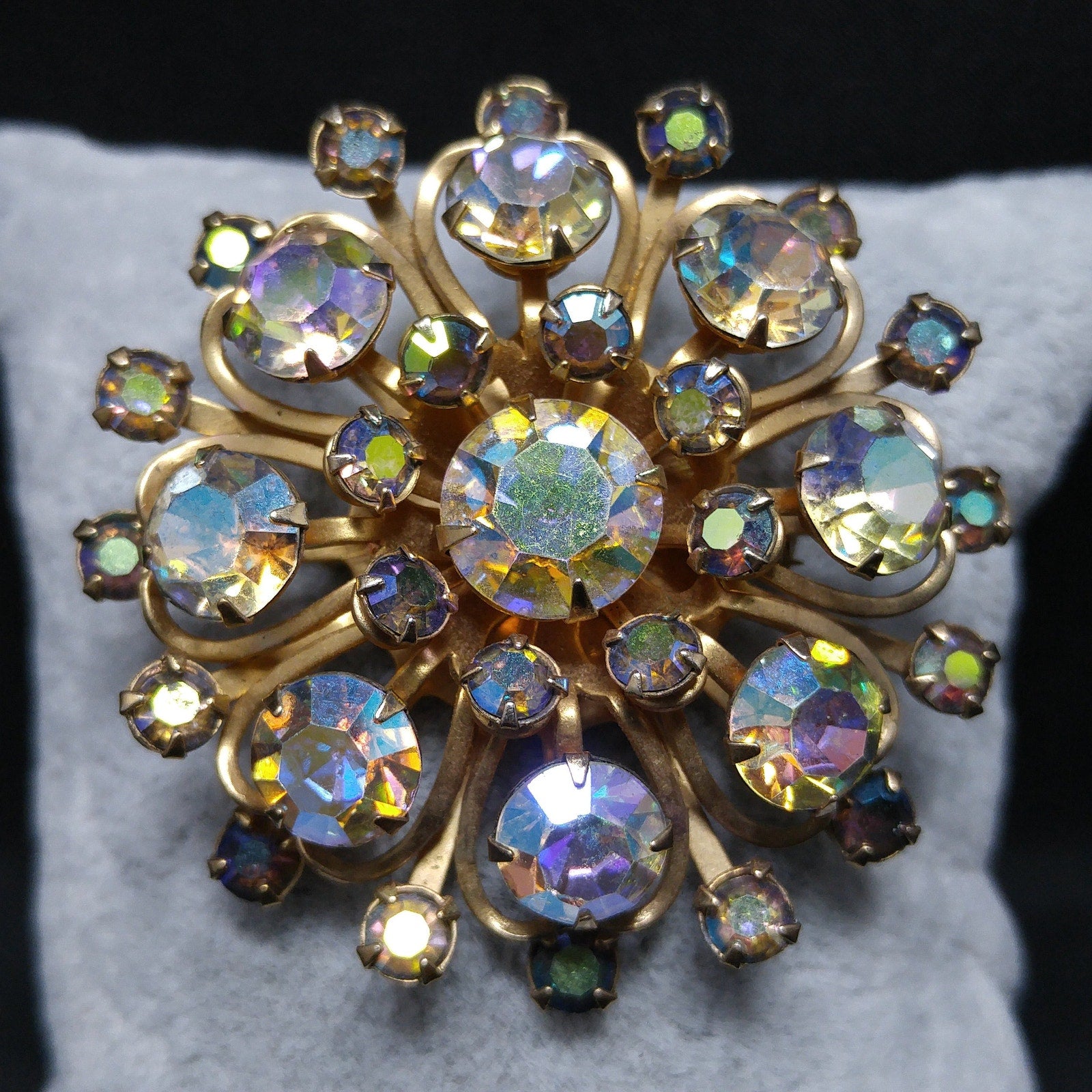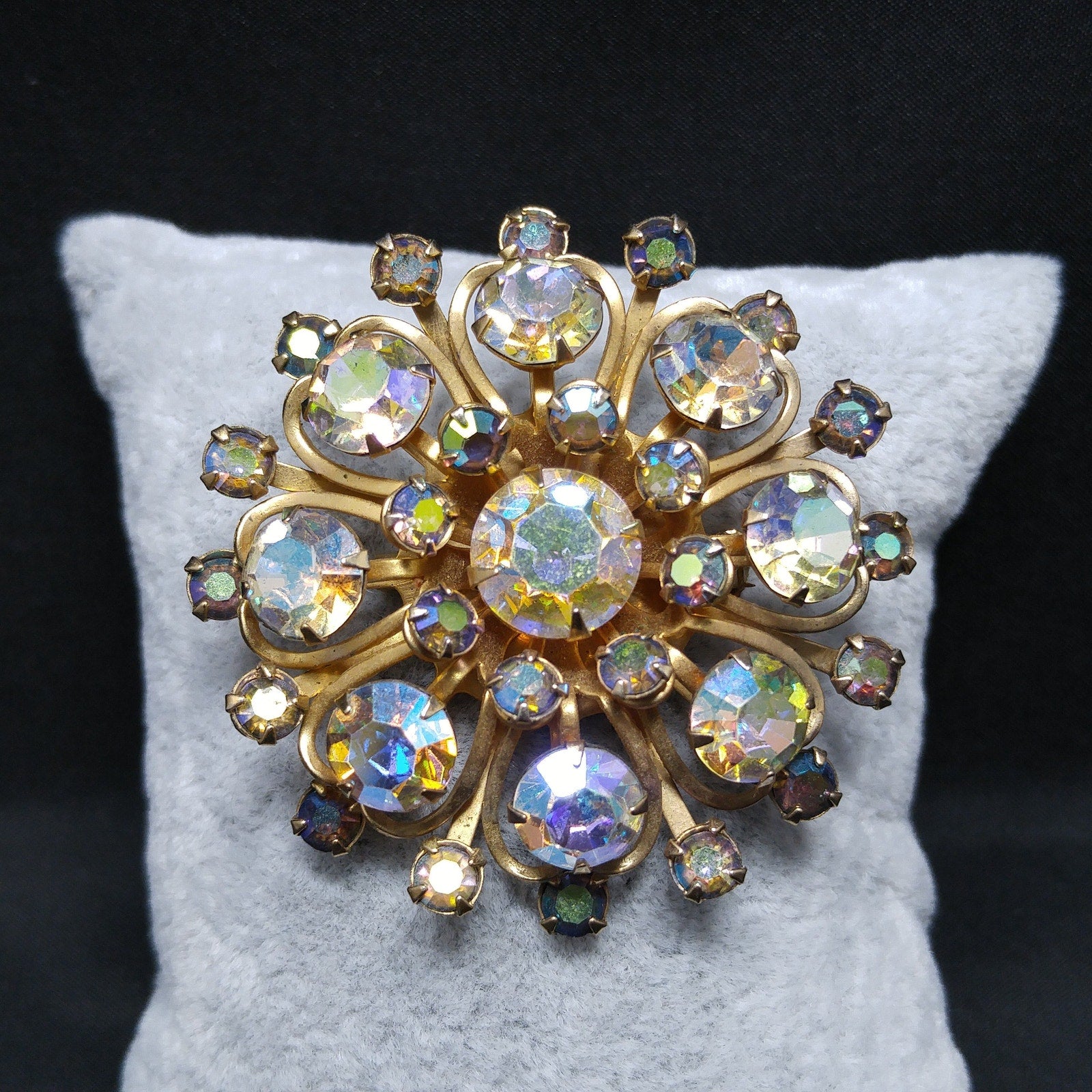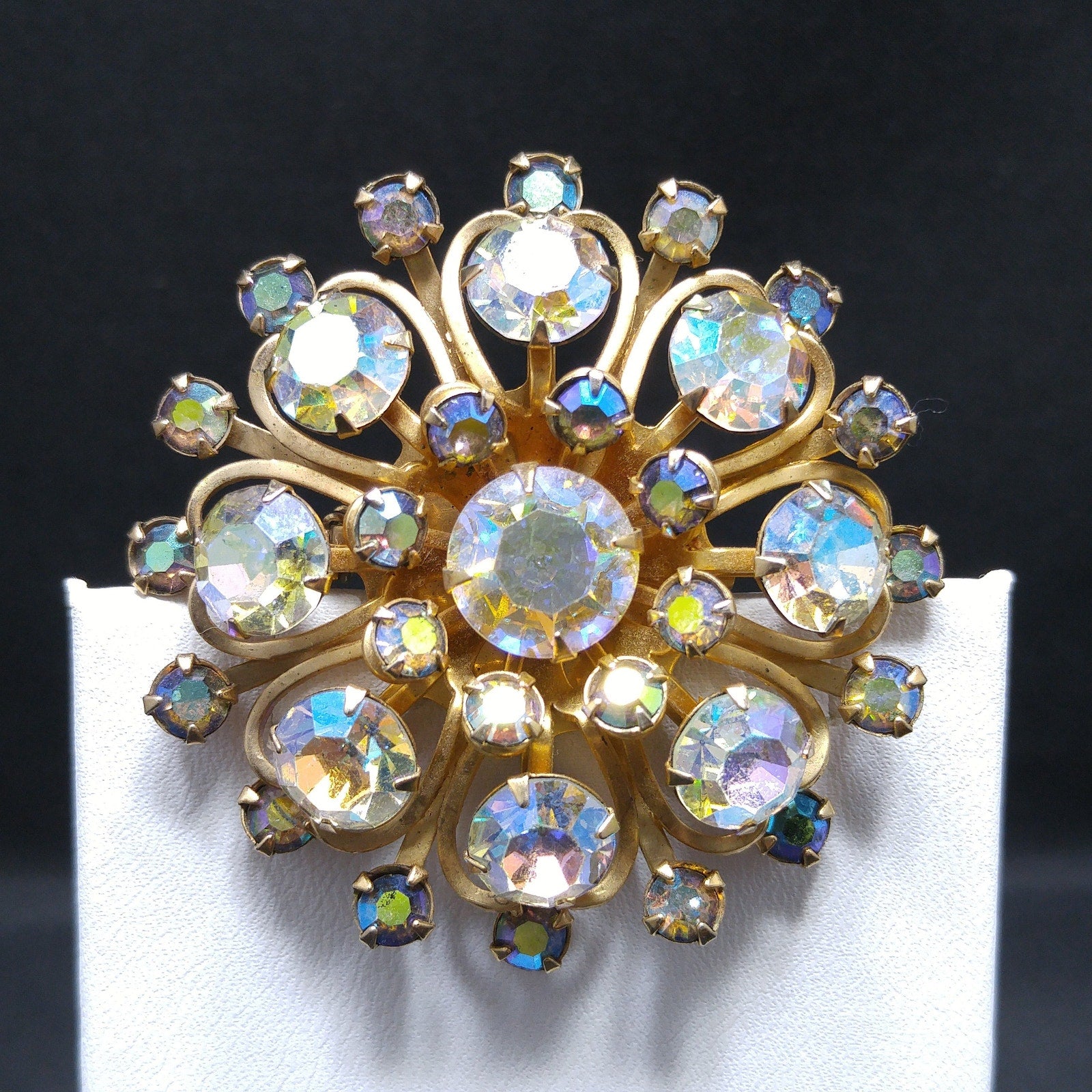 *Description: This is a great aurora borealis flower brooch from the 1950s. The gold tone rivets on the back attach to each petal within the flower and give it the three dimensional design. Each rhinestone is prong set and the larger rhinestones are clear and the smaller are blue aurora borealis rhinestones. This is a great mid-century brooch. This would be a great addition to your vintage jewelry collection or make a great vintage gift!