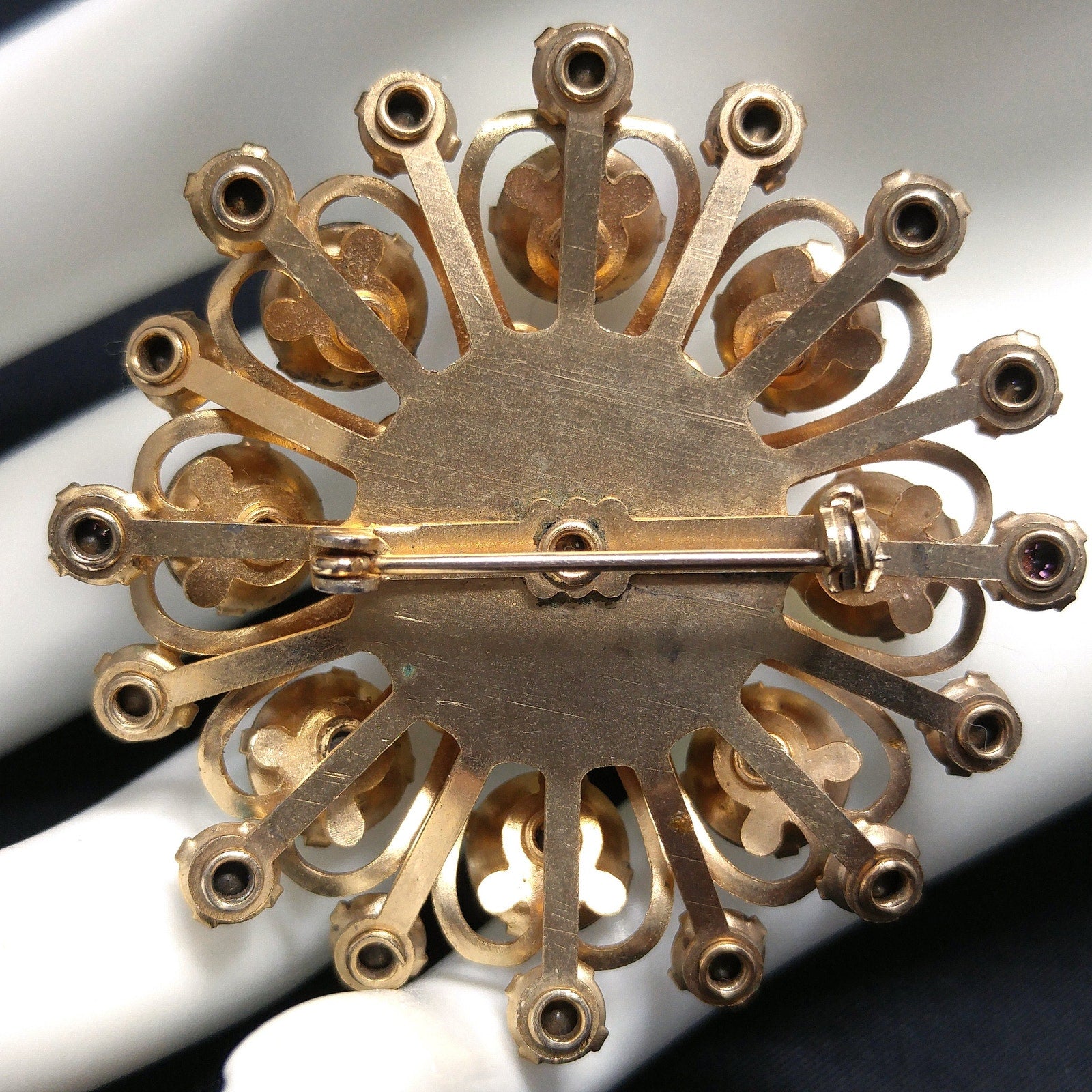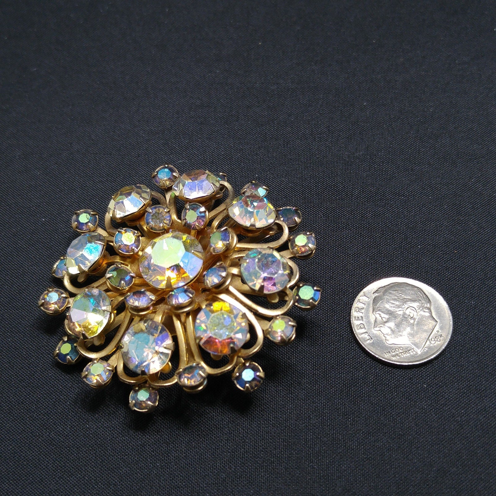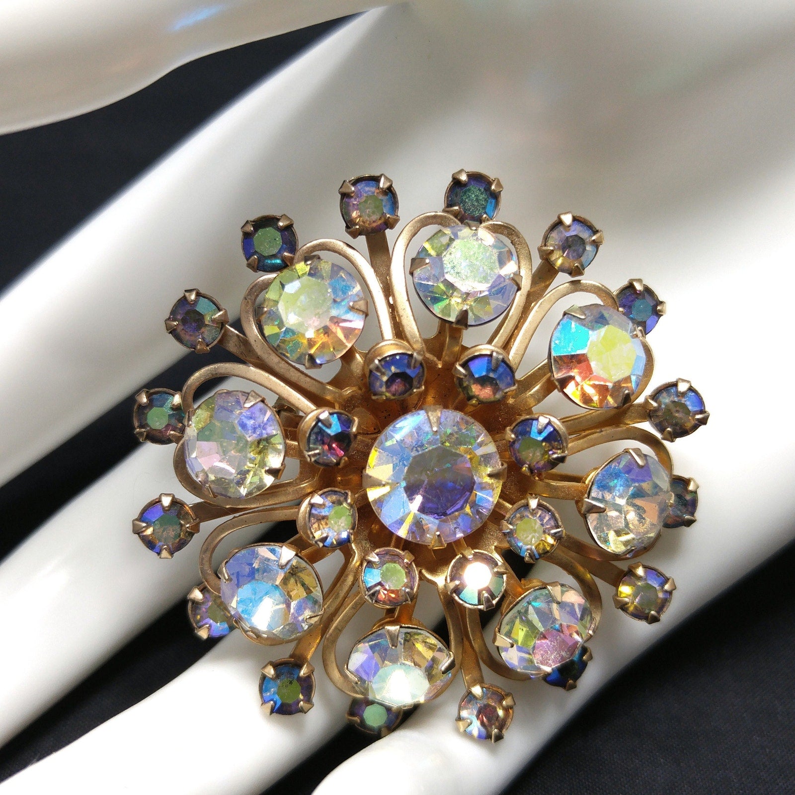 *Description: This is a great aurora borealis flower brooch from the 1950s. The gold tone rivets on the back attach to each petal within the flower and give it the three dimensional design. Each rhinestone is prong set and the larger rhinestones are clear and the smaller are blue aurora borealis rhinestones. This is a great mid-century brooch. This would be a great addition to your vintage jewelry collection or make a great vintage gift!
