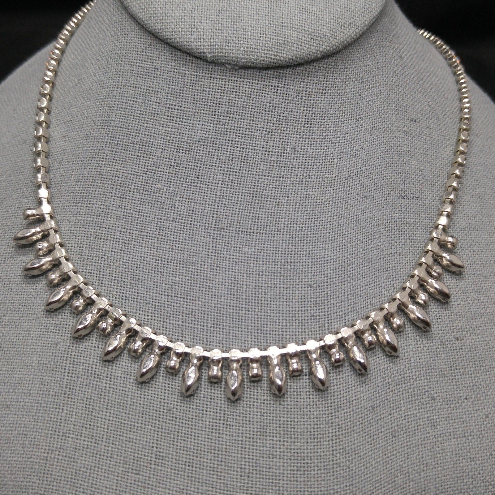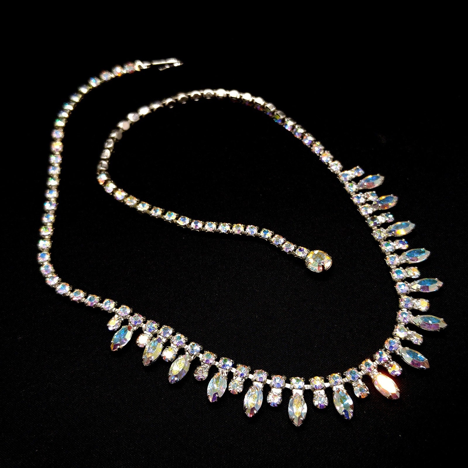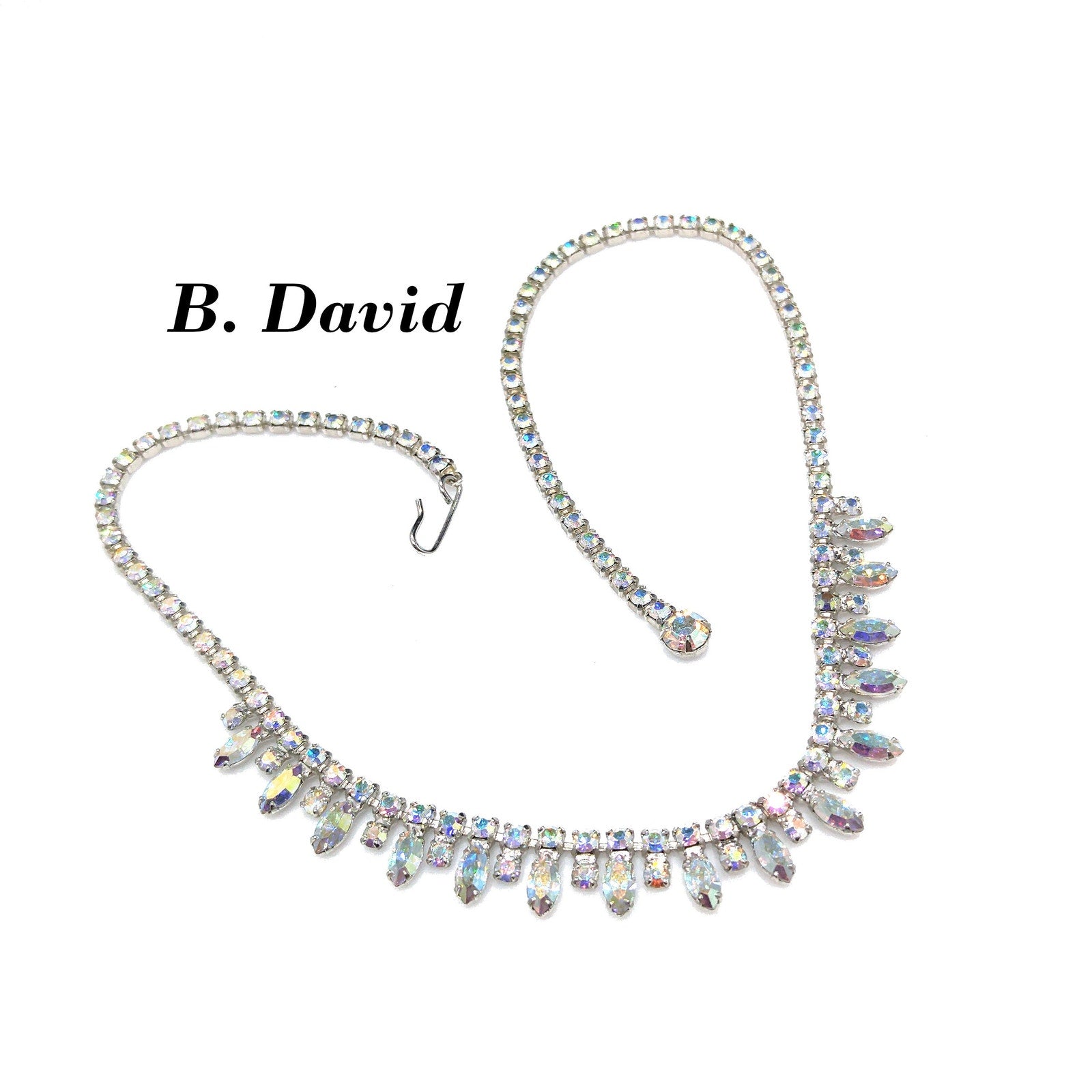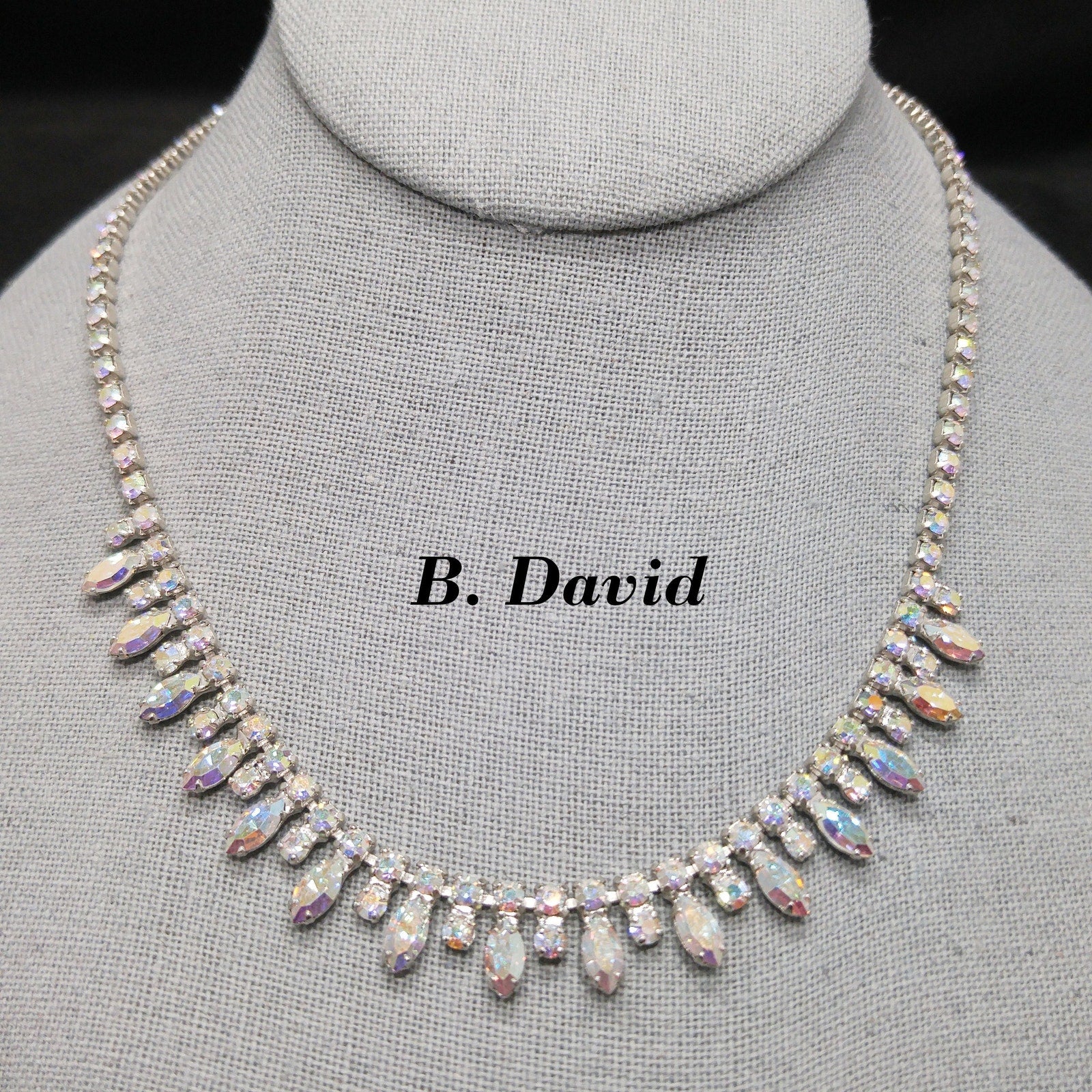 *Description: This is a gorgeous rhinestone necklace by B. David, rhodium plated, with aurora borealis rhinestones from the 1960s. The frontal portion has marquise cut and chaton cut rhinestones with sparkling AB clear rhinestones. I tested the surface metal at 10K gold plate. This necklace would be beautiful for a wedding or any special occasion. This would be a great addition to your vintage jewelry collection or make a great vintage gift!