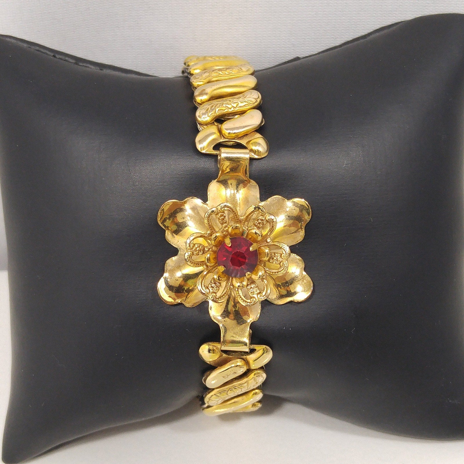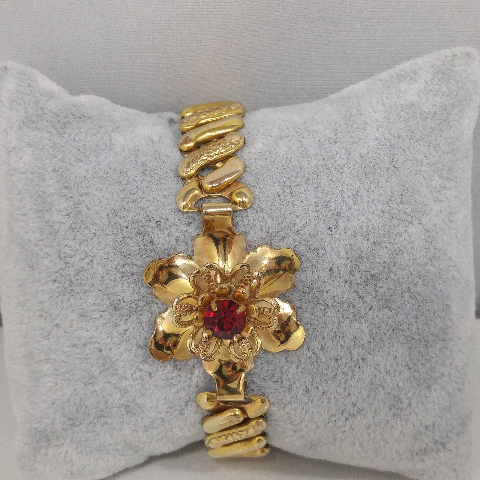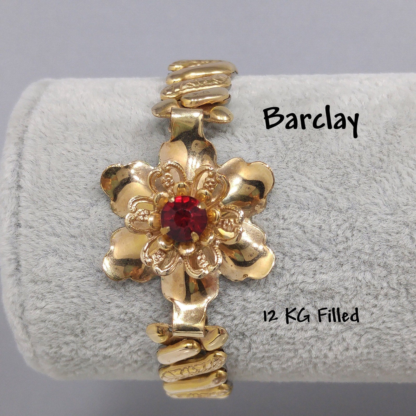 *Description: This is a beautiful stretch gold filled stretch bracelet by Barclay from the 1950s. This beautiful floral bracelet has a red crystal center. The bracelet is stamped BARCLAY on the back of the flower with 12 KG Filled. The vintage bracelet is in amazing condition and is very reflective. This bracelet is size small to medium. The length of the band is between 7 and 7 1/2 Inches stretched so it would fit that length of wrist; a snug fit. This would be a great vintage gift or a wonderful addition to your vintage jewelry collection.