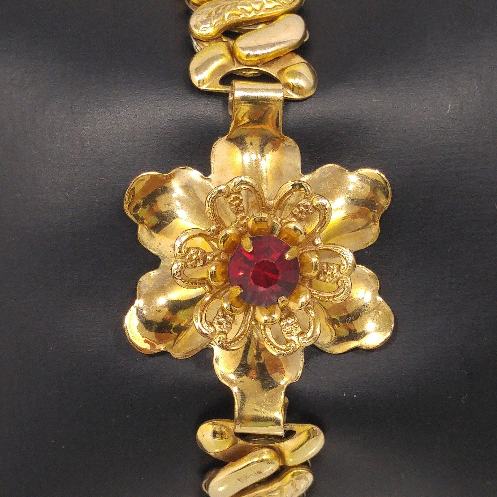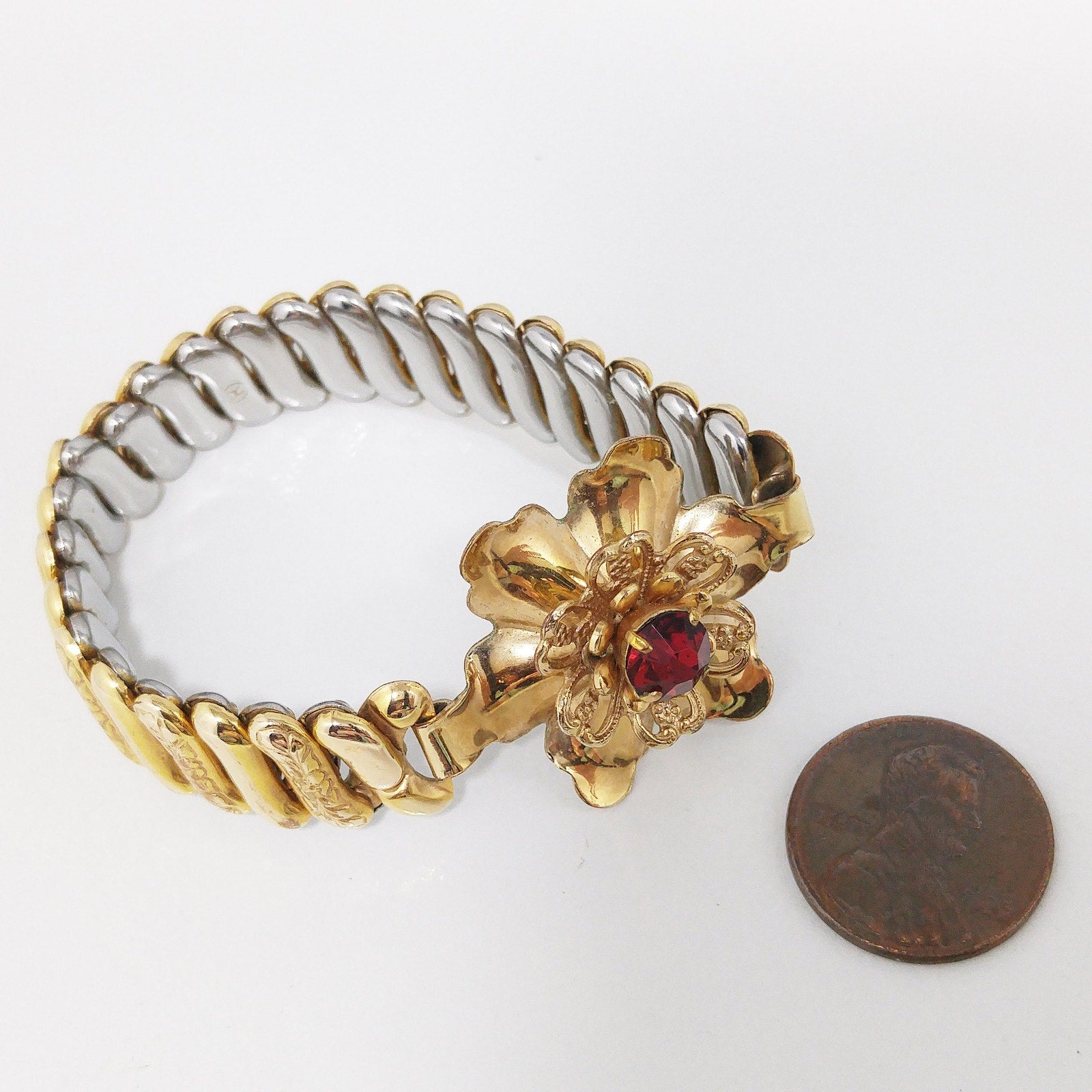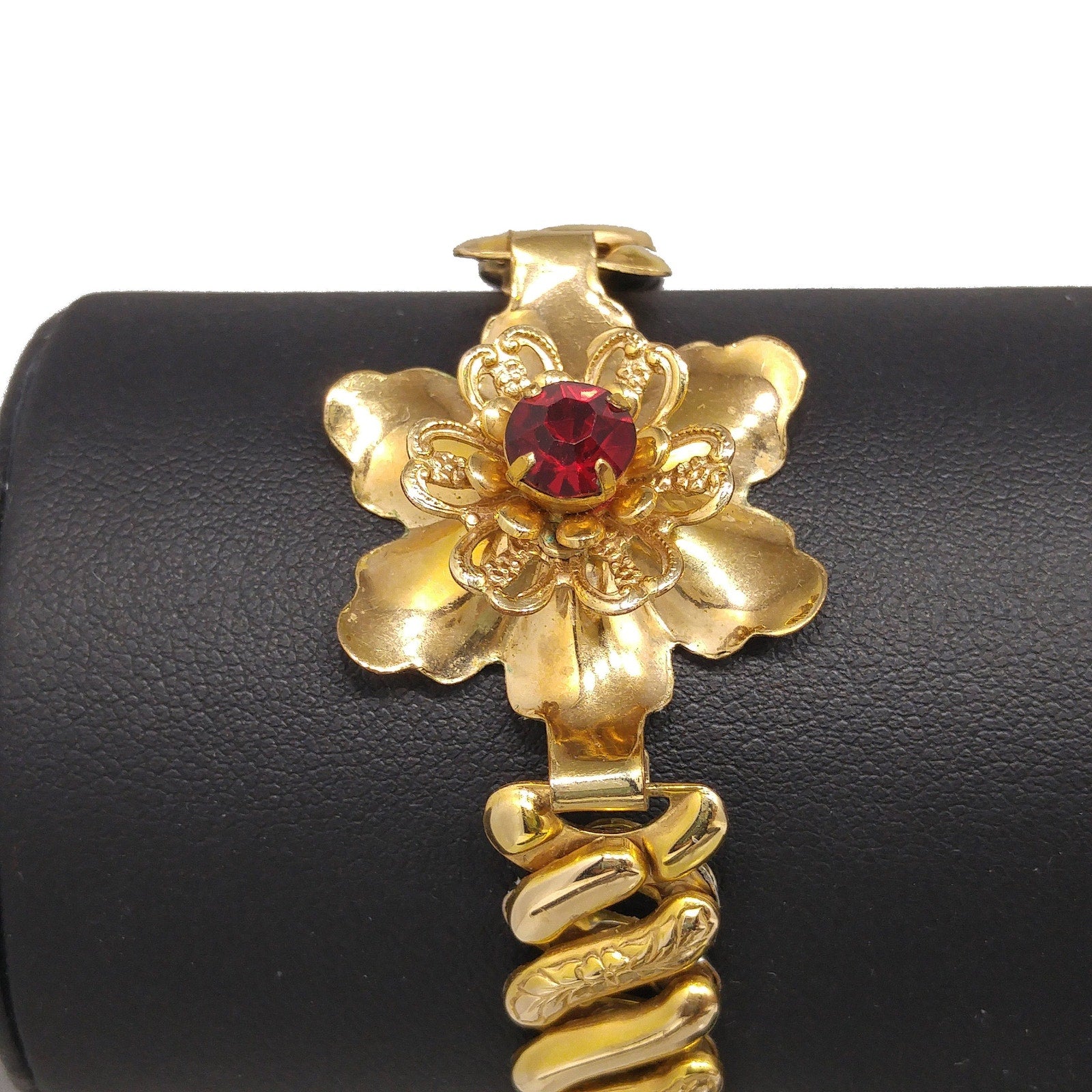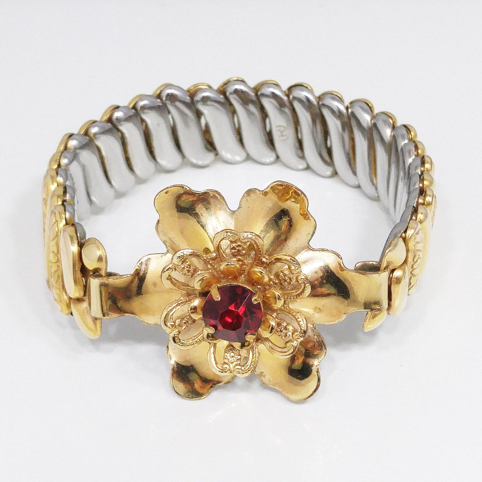 *Description: This is a beautiful stretch gold filled stretch bracelet by Barclay from the 1950s. This beautiful floral bracelet has a red crystal center. The bracelet is stamped BARCLAY on the back of the flower with 12 KG Filled. The vintage bracelet is in amazing condition and is very reflective. This bracelet is size small to medium. The length of the band is between 7 and 7 1/2 Inches stretched so it would fit that length of wrist; a snug fit. This would be a great vintage gift or a wonderful addition to your vintage jewelry collection.