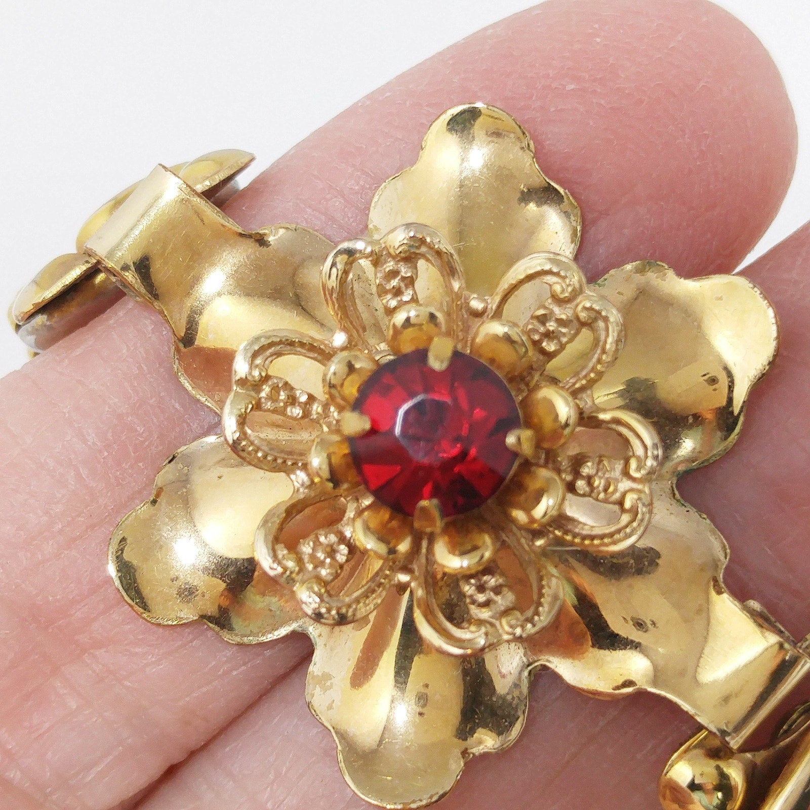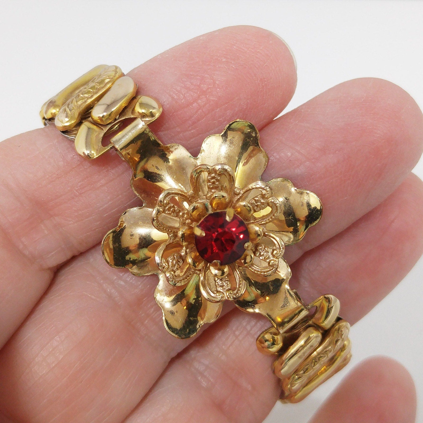 Barclay Gold Filled Flower Expansion Bracelet, Red Crystal Gold Flower