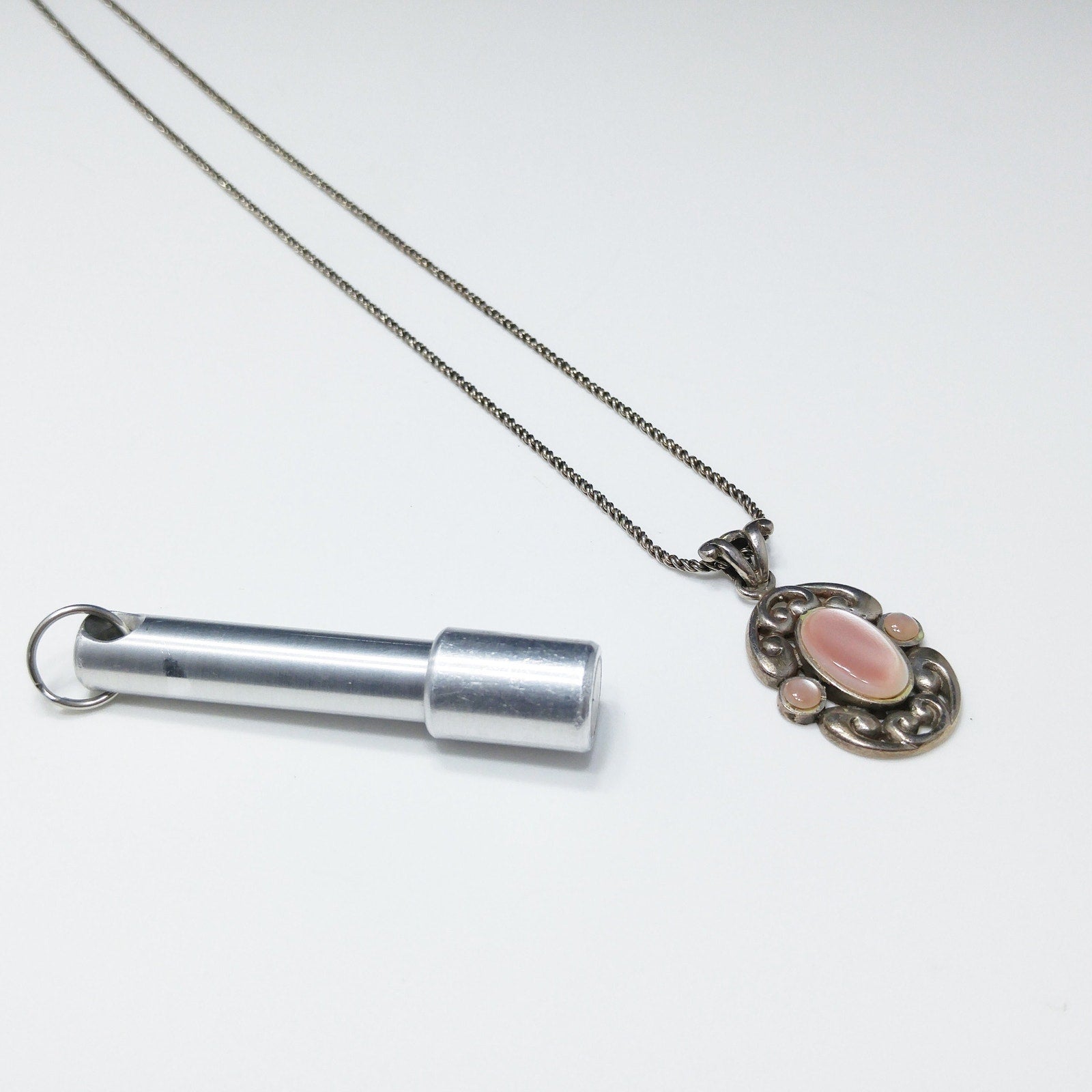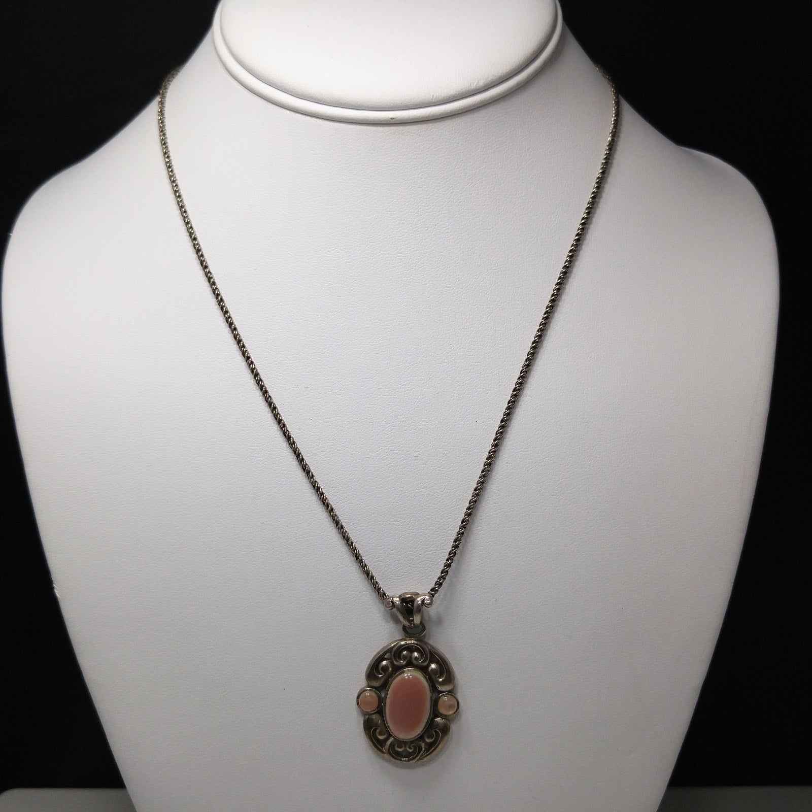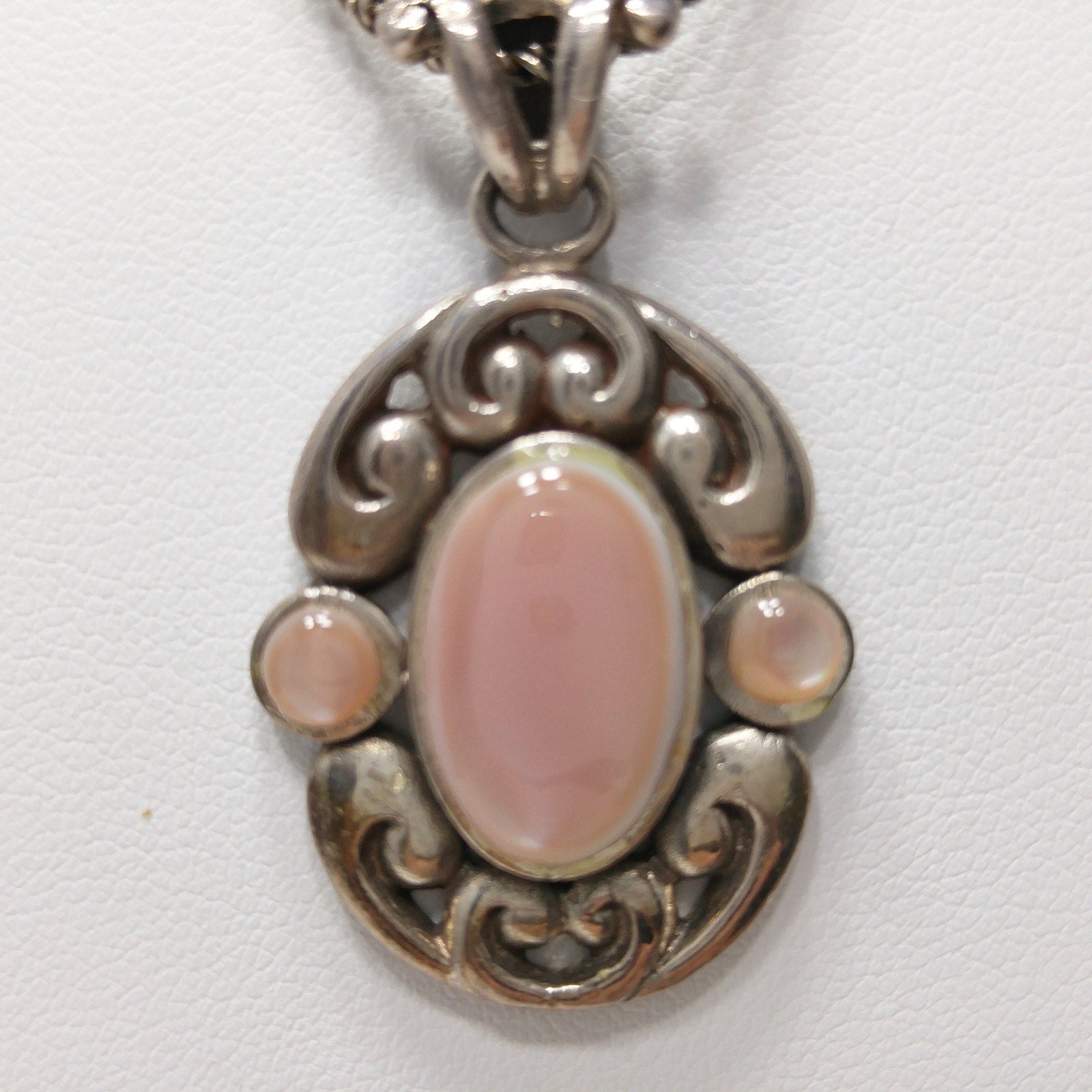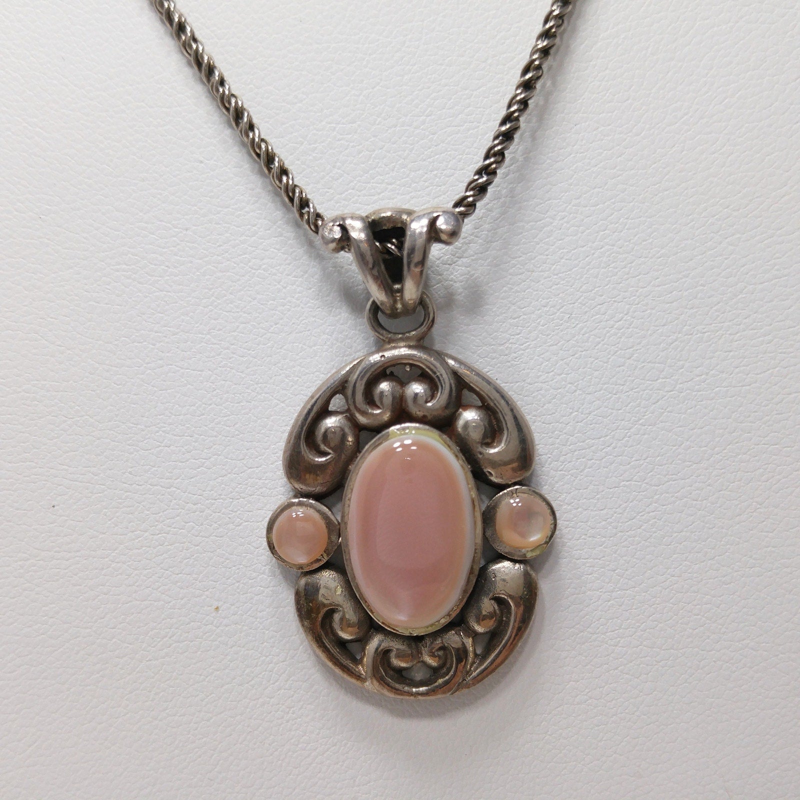 *Description: This is a beautiful BARSE vintage necklace, sterling silver, with a pearled pink cabochon. The stone looks like pink mother of pearl. It is cold to the touch. Barse is known for using quality gemstones and precious metals in their jewelry. This would be a great addition to your vintage jewelry collection or make a great vintage gift!