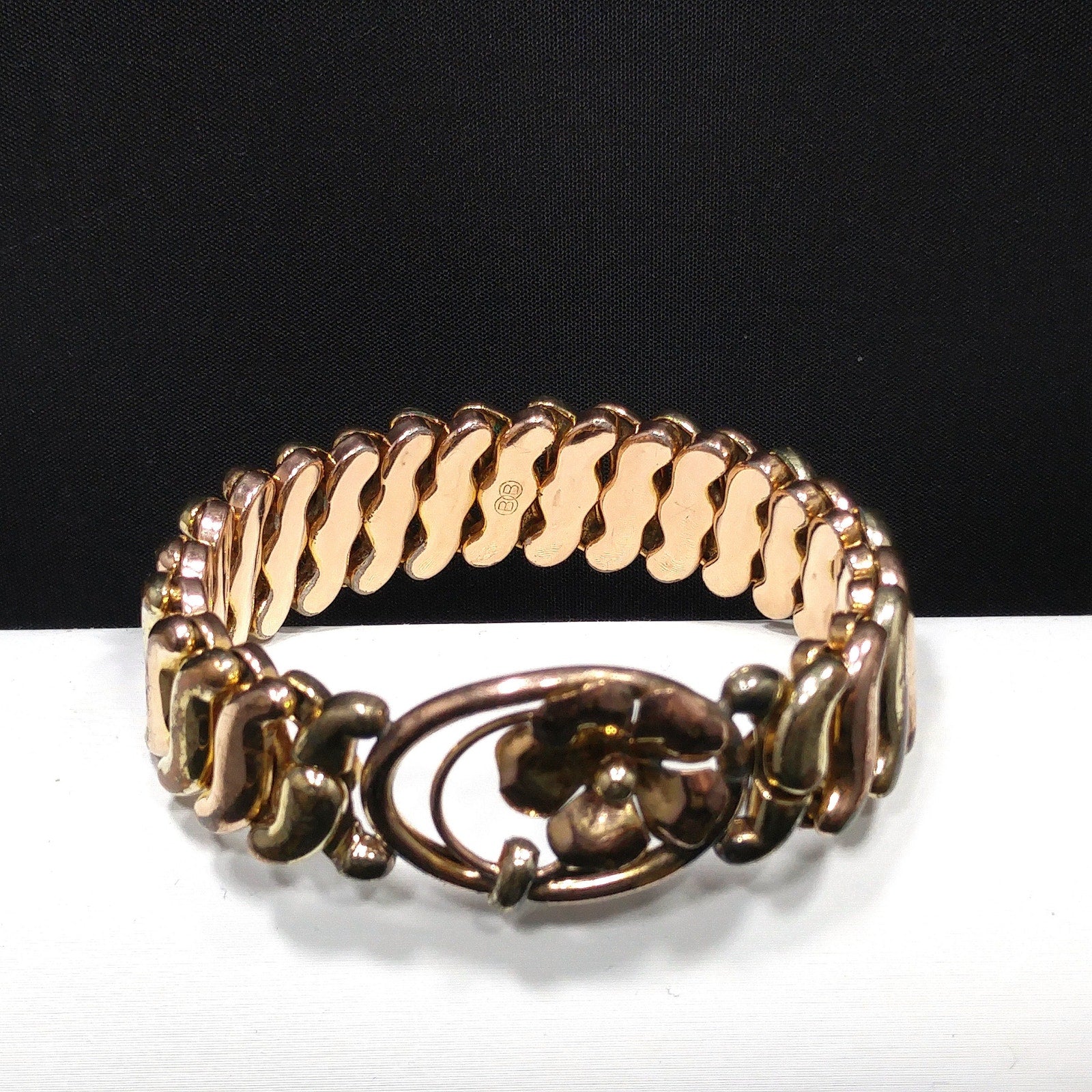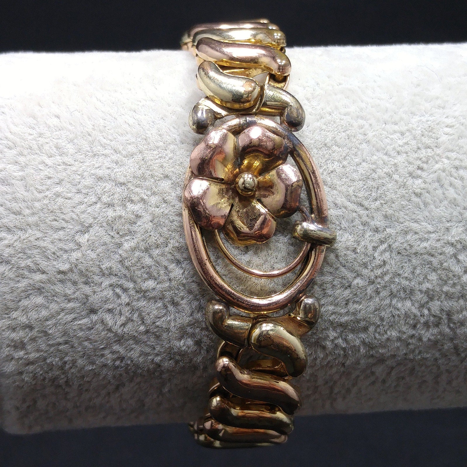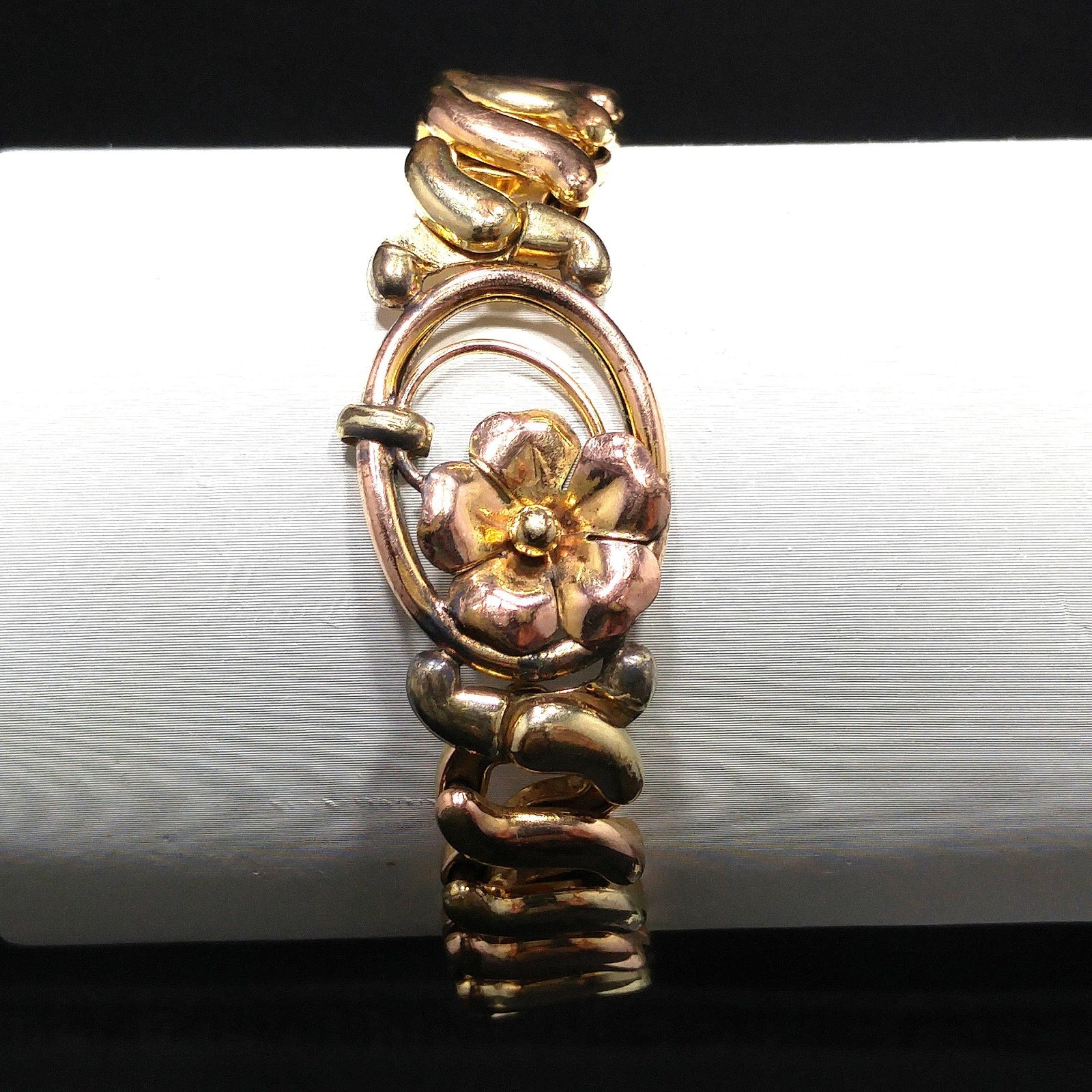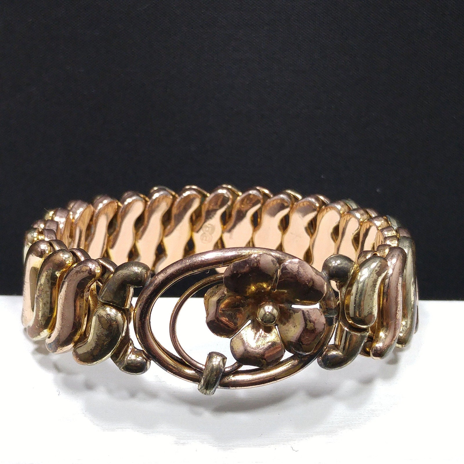 *Description: This is a unique expansion bracelet by Binder Brothers, Inc. with a floral center in gold and copper tones from the 1920s. Binder Brothers was in New York, New York and began in 1920. They used two “B’s” inside interlocking circles as their hallmark. It looks great and the center is unique in its design. This would be a great addition to your vintage jewelry collection or make a great vintage gift!