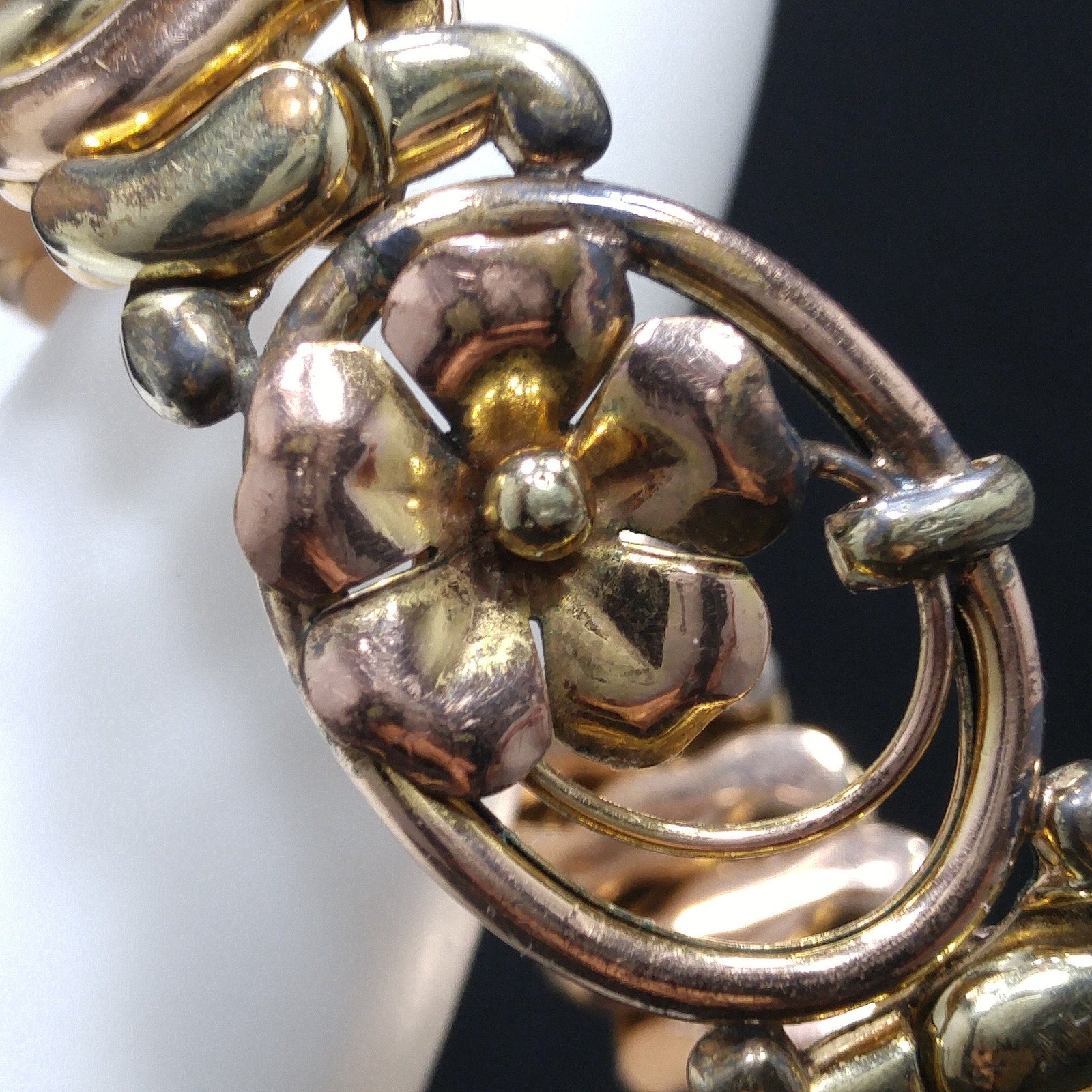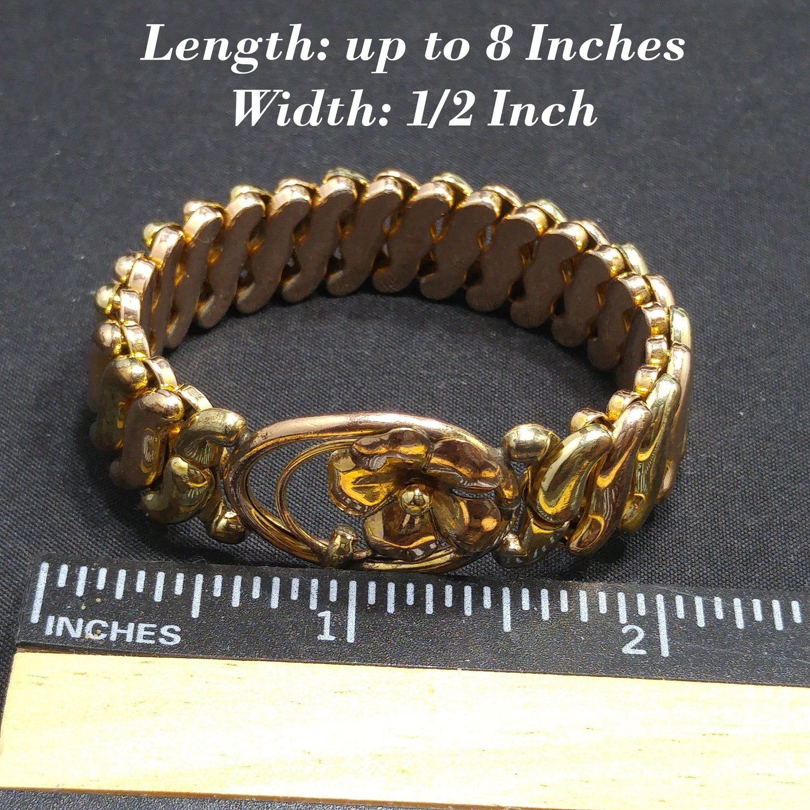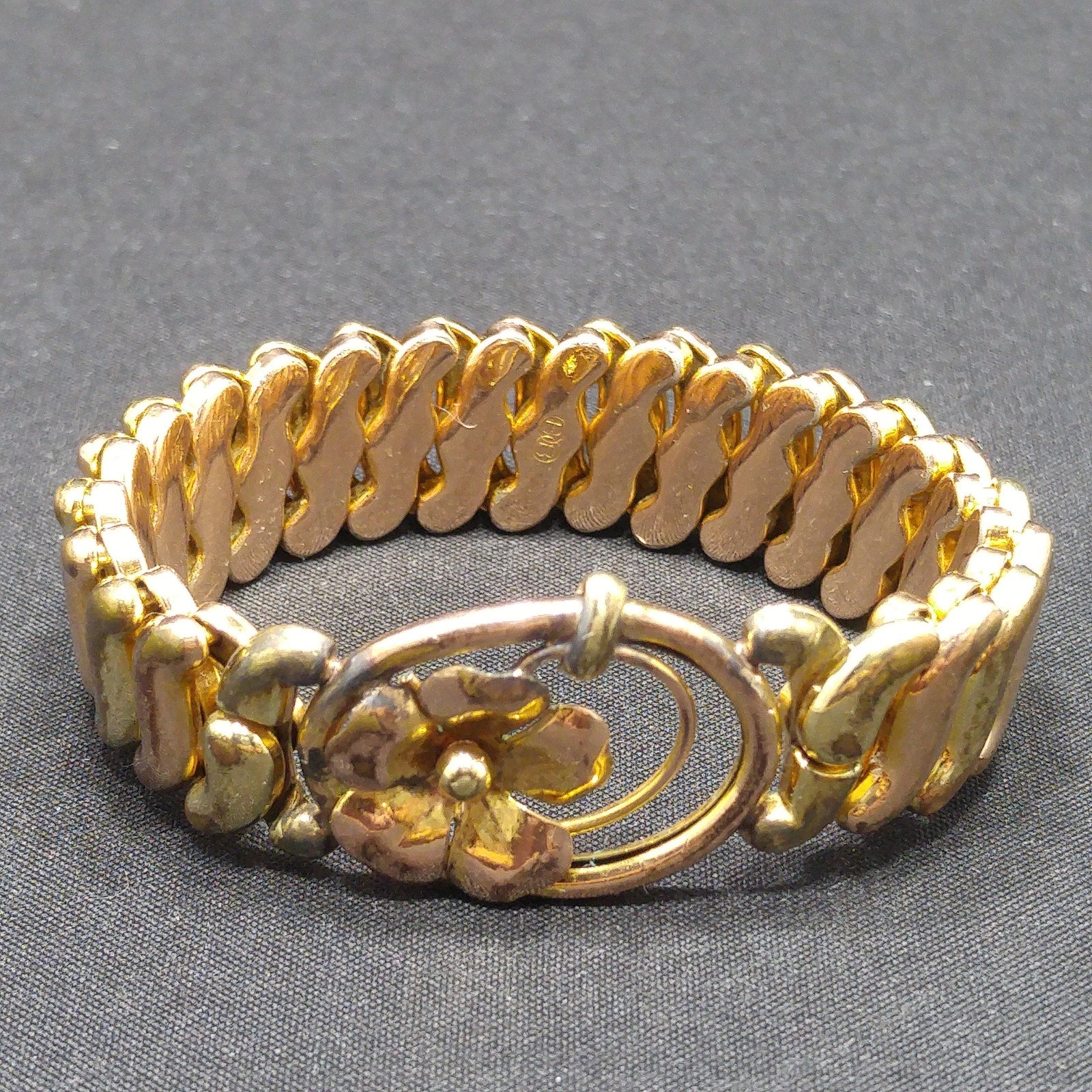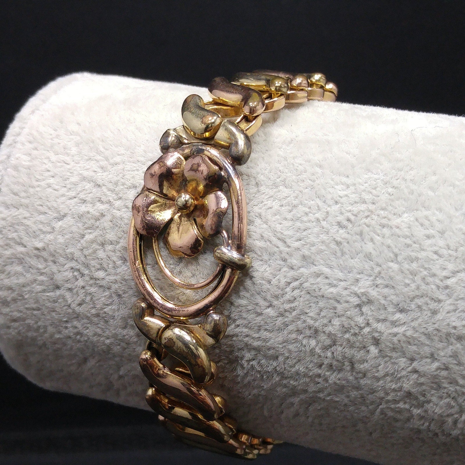 *Description: This is a unique expansion bracelet by Binder Brothers, Inc. with a floral center in gold and copper tones from the 1920s. Binder Brothers was in New York, New York and began in 1920. They used two “B’s” inside interlocking circles as their hallmark. It looks great and the center is unique in its design. This would be a great addition to your vintage jewelry collection or make a great vintage gift!