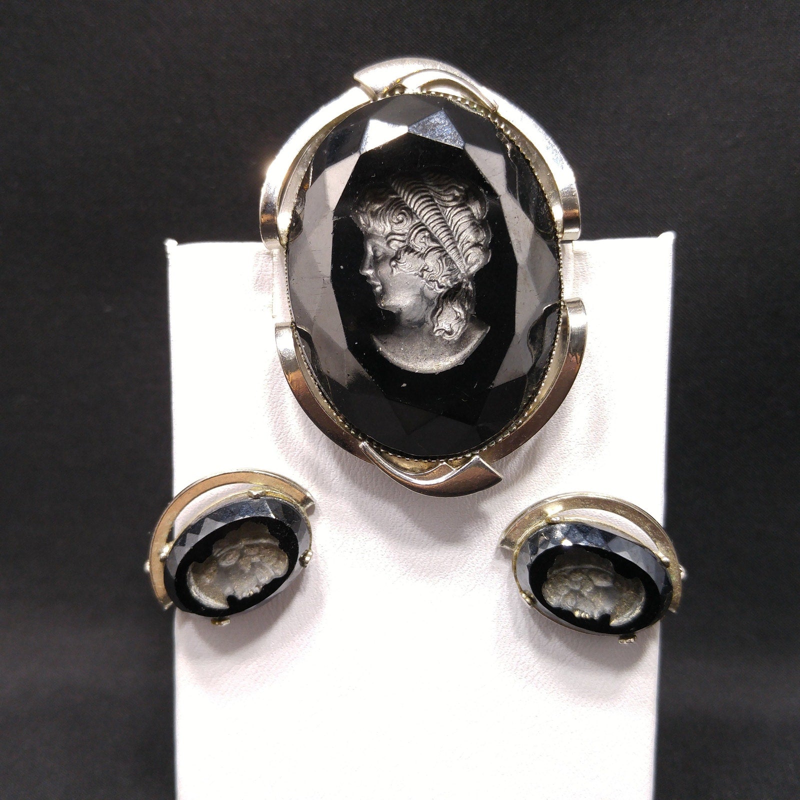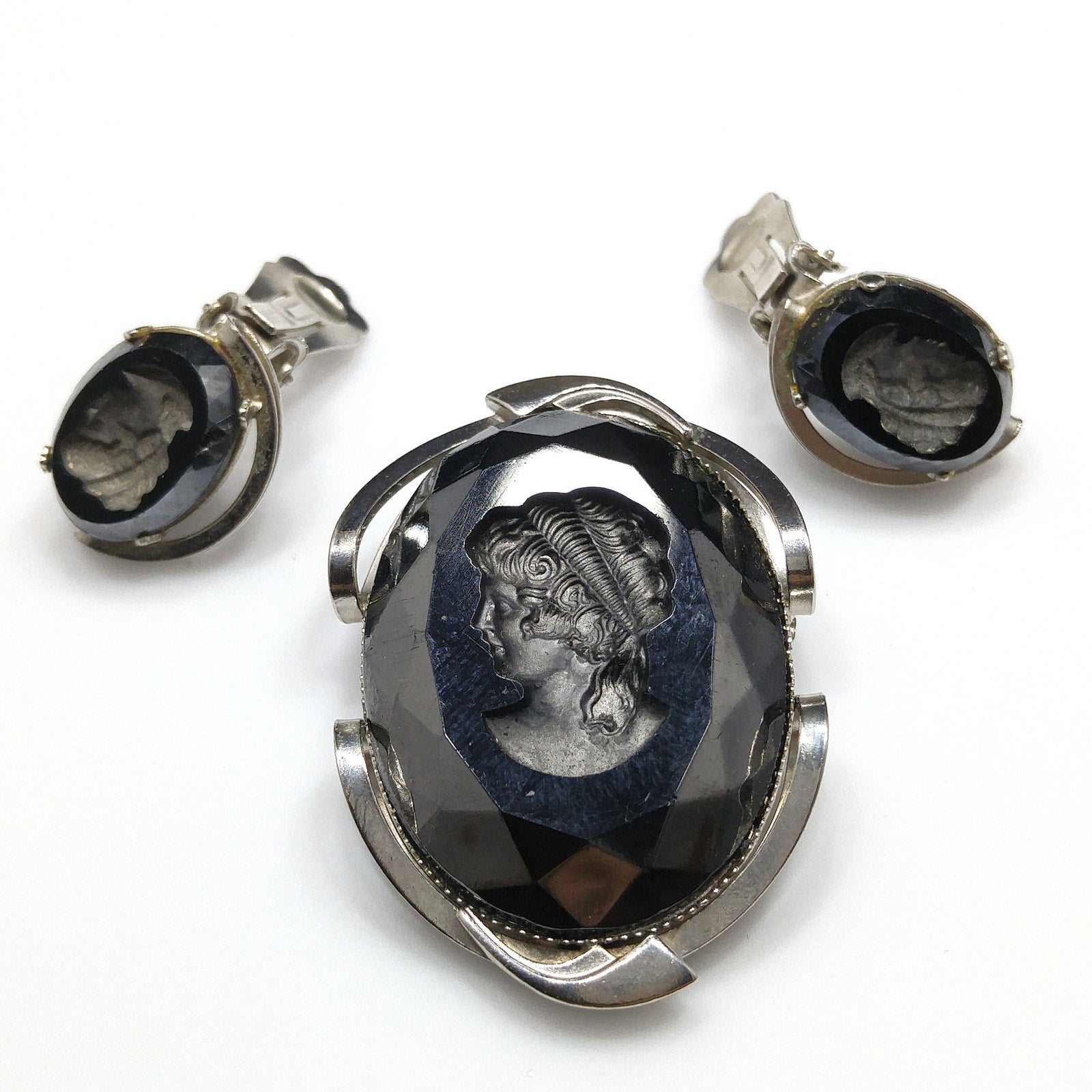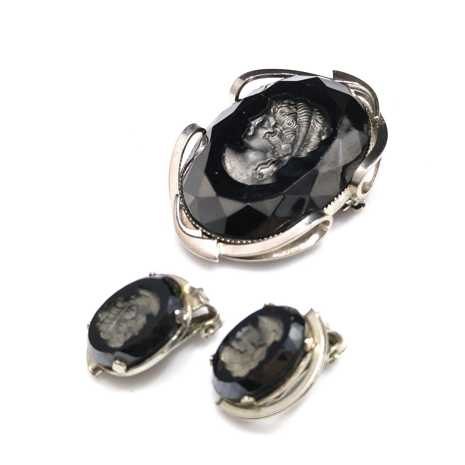 Black Glass Intaglio Cameo Brooch & Clip Earrings, 1960s Vintage Jewelry