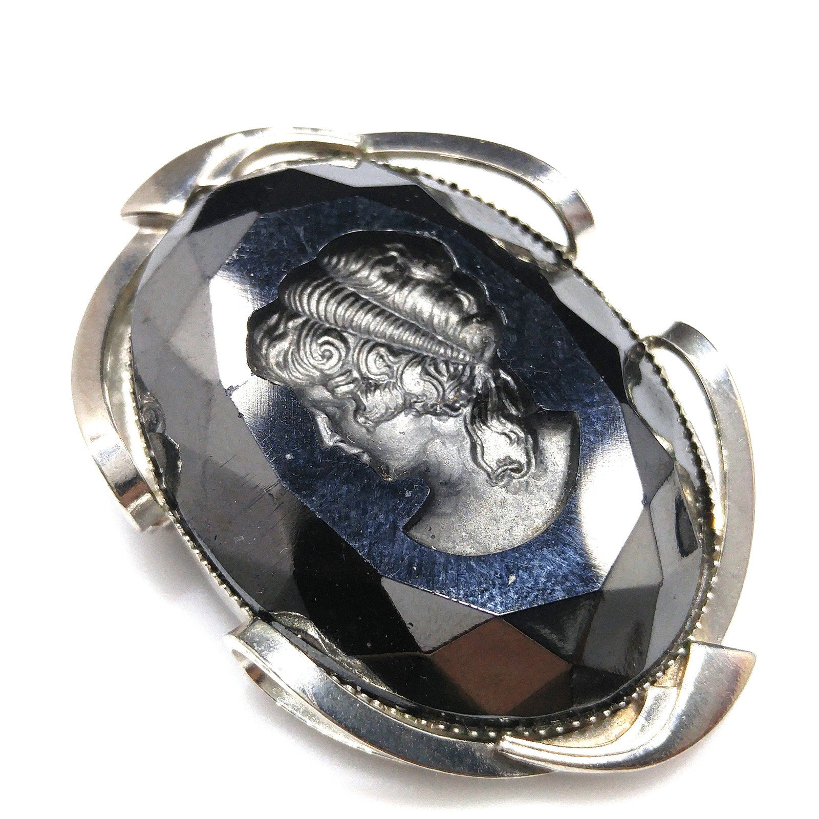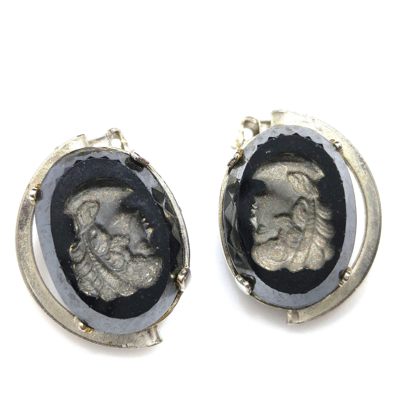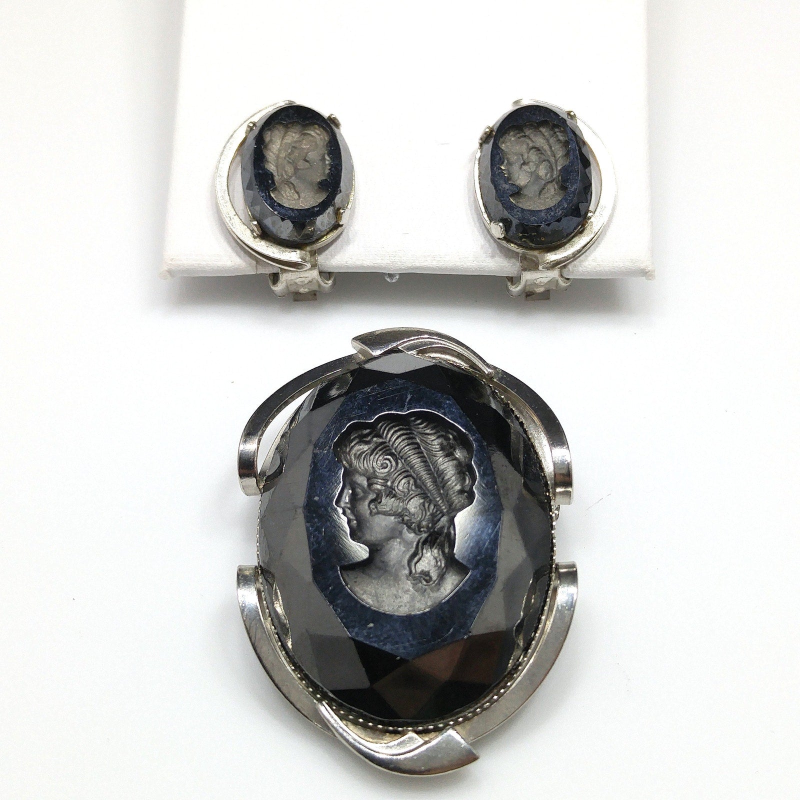 Black Glass Intaglio Cameo Brooch & Clip Earrings, 1960s Vintage Jewelry