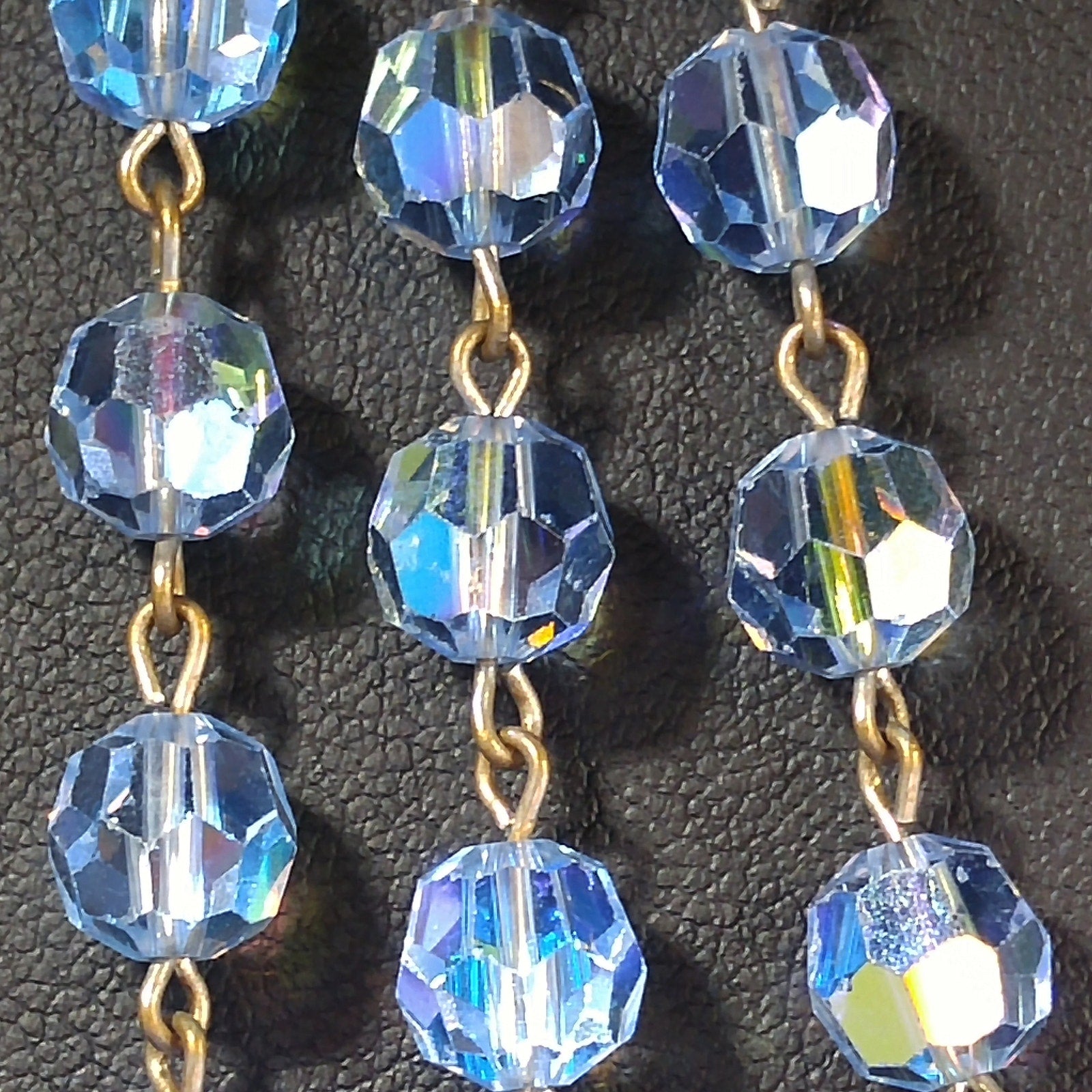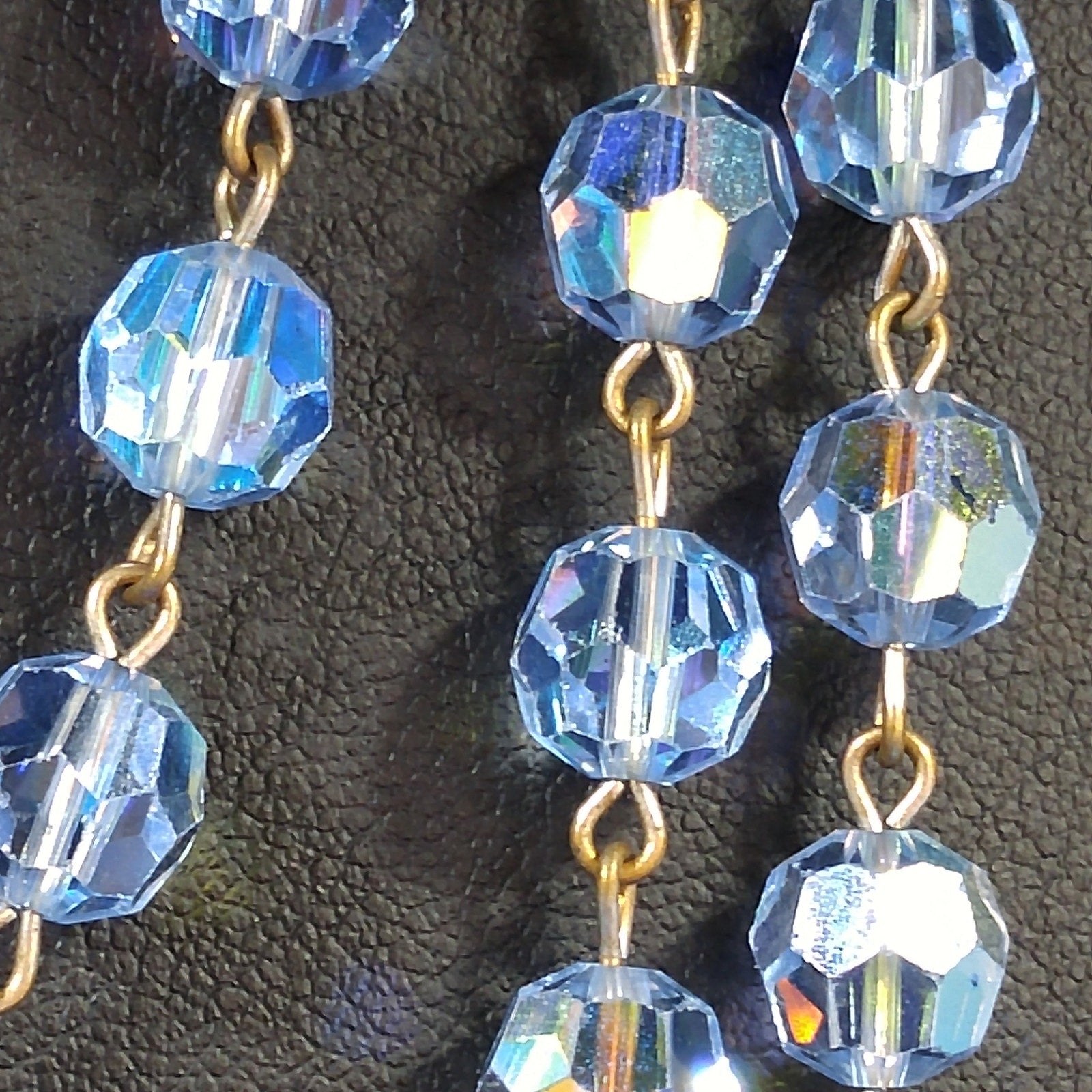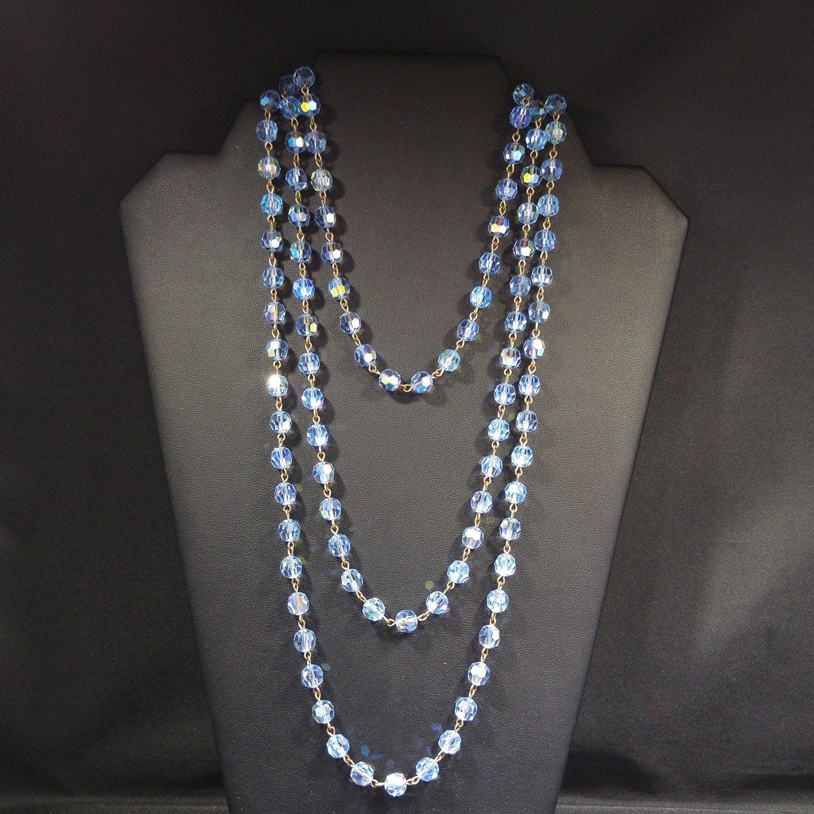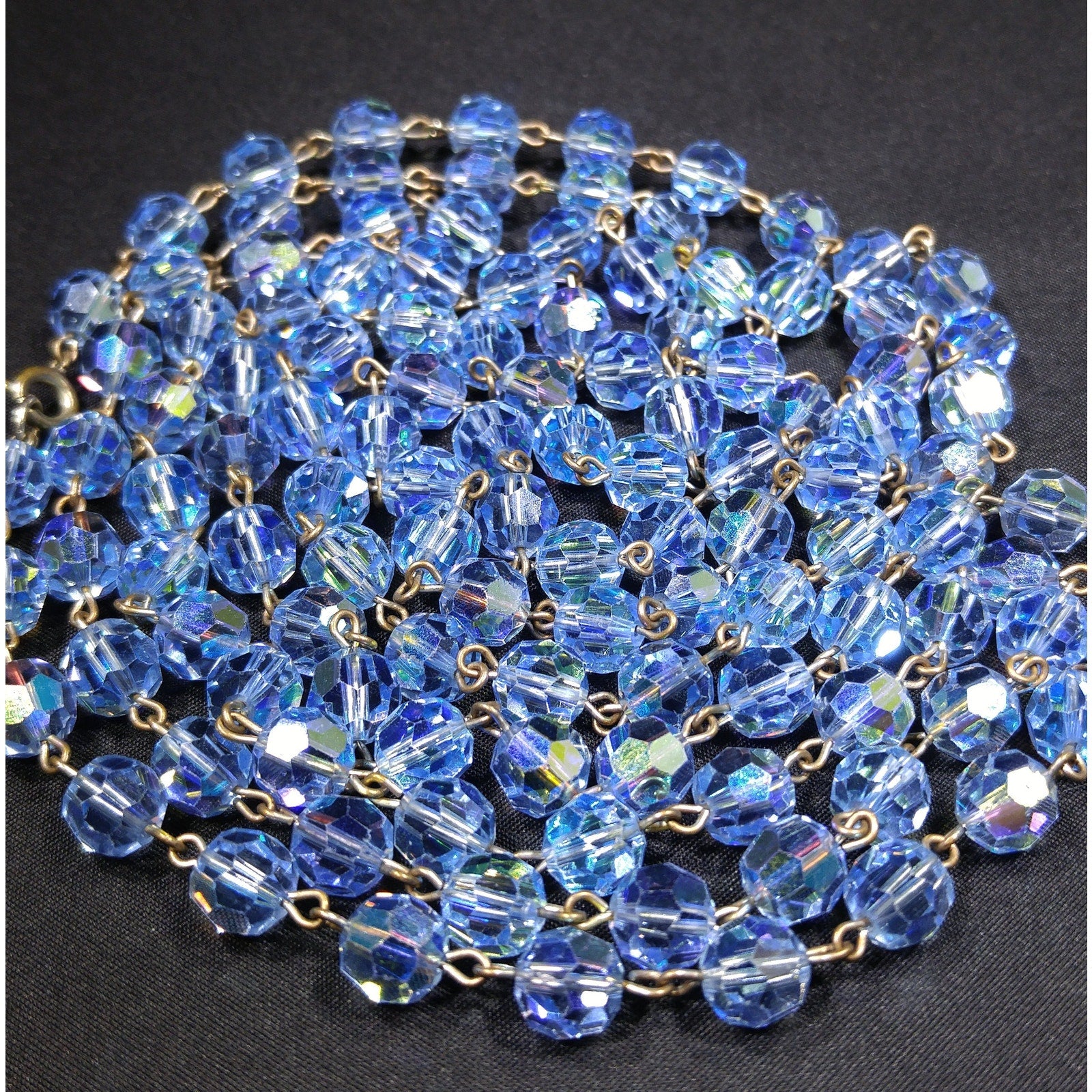 *Description: This is a beautiful light blue Austrian crystal, aurora borealis, long necklace with a spring ring clasp from the 1960s or late 1950s. The round faceted beads are 8mm and are strung using the rosary style design with each bead wire wrapped and connected to the next. The necklace is long at 60 inches and with the spring ring, it may be worn in many layers of your choice. This would be a great addition to your vintage jewelry collection or make a great vintage gift!