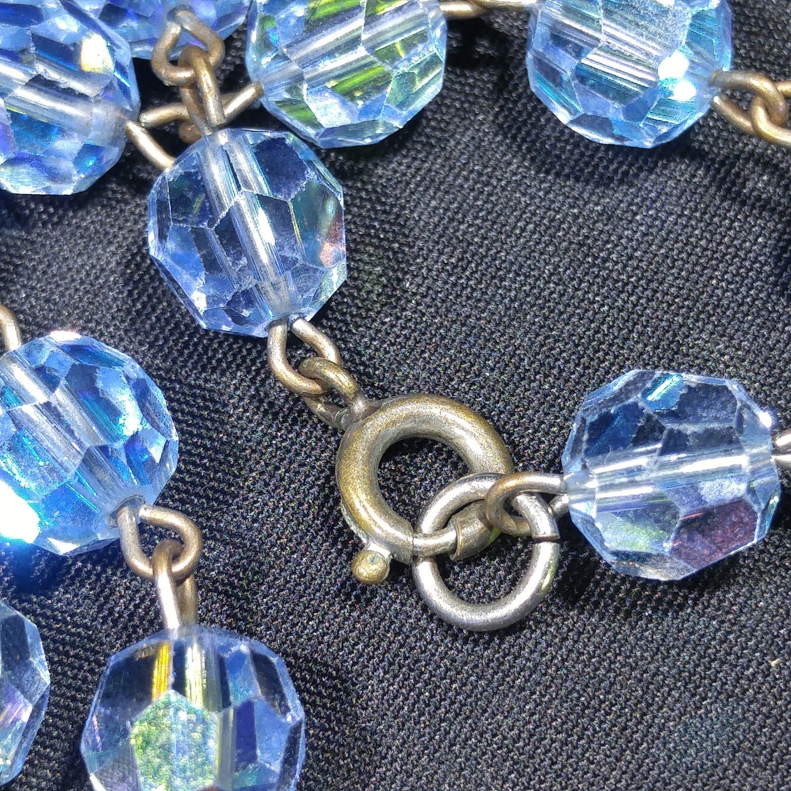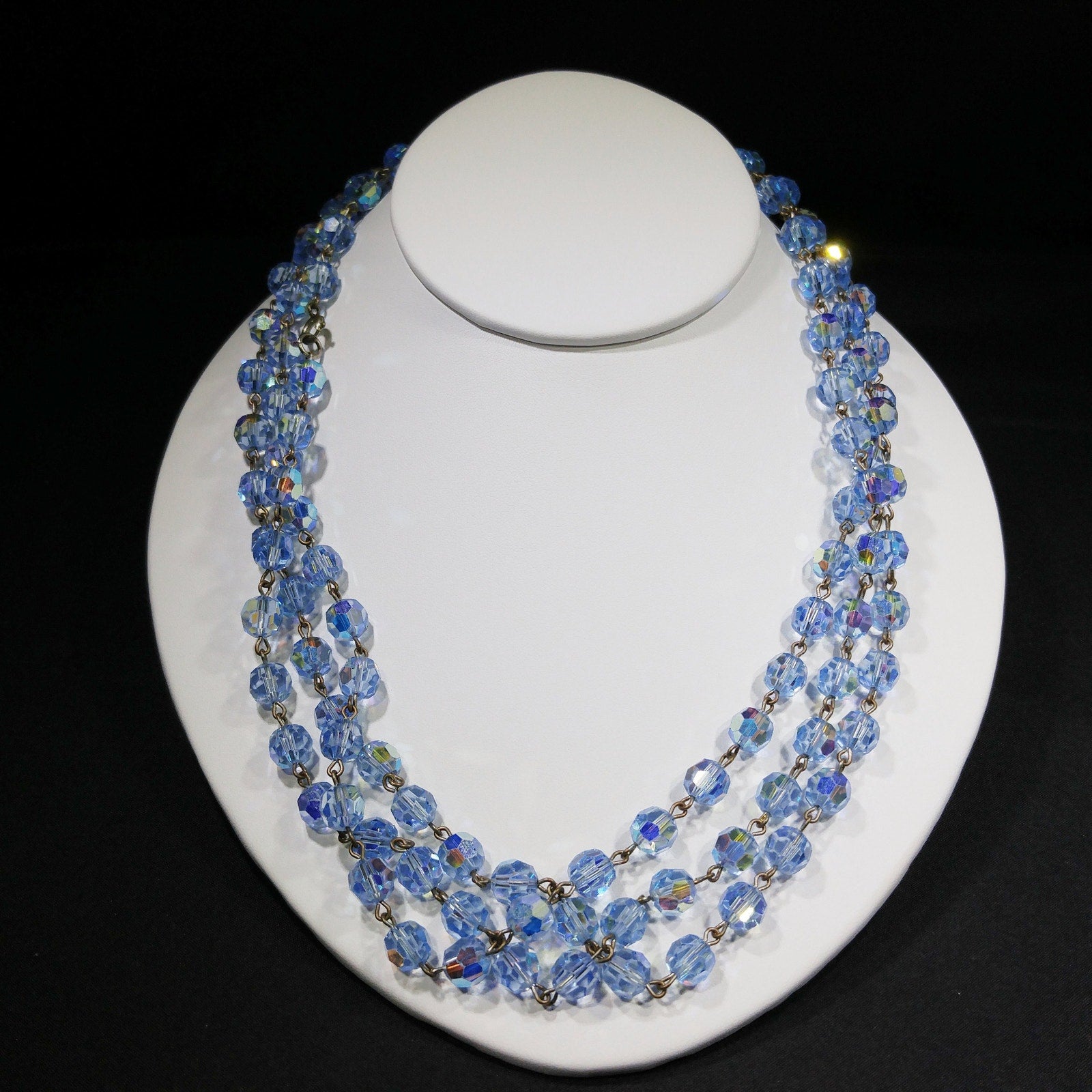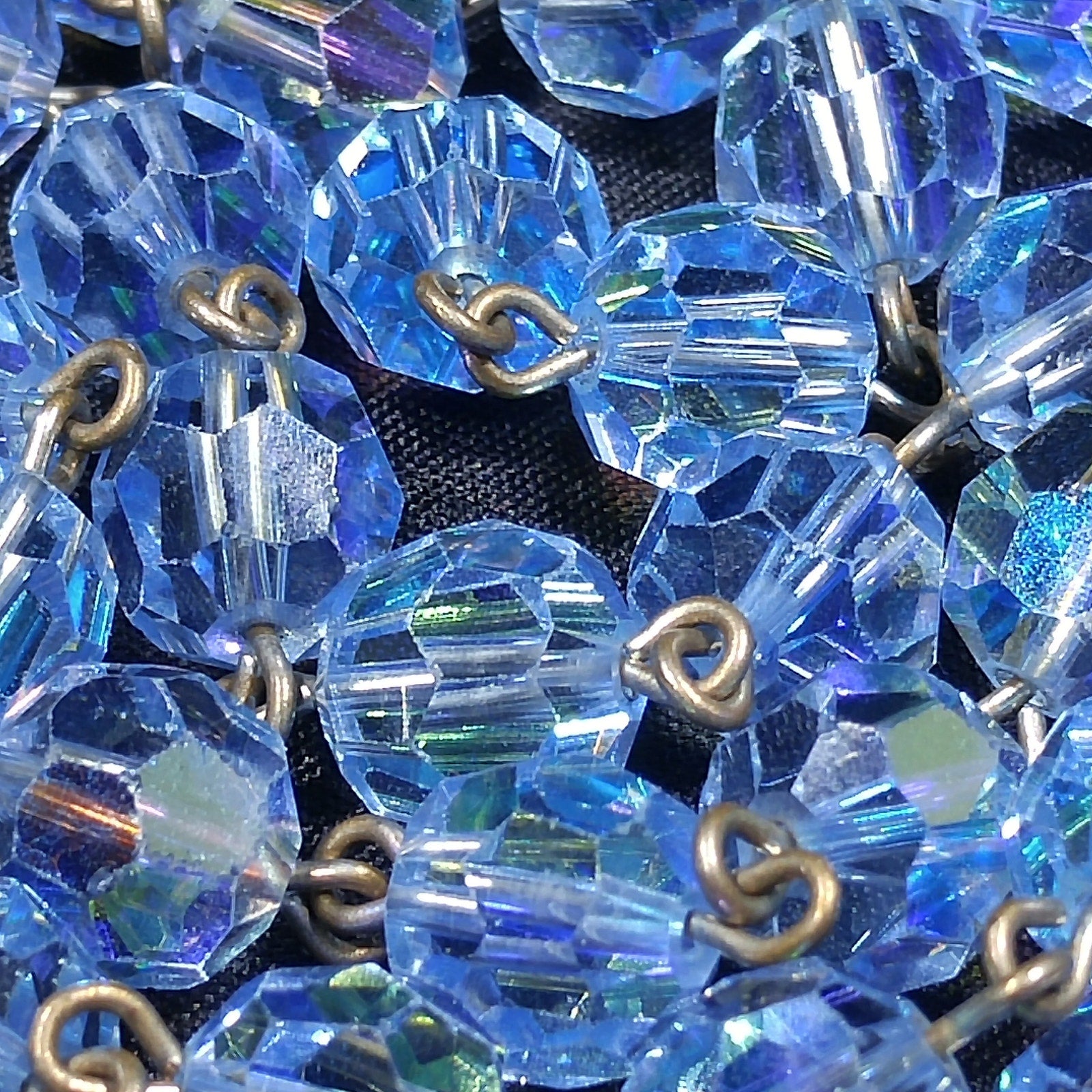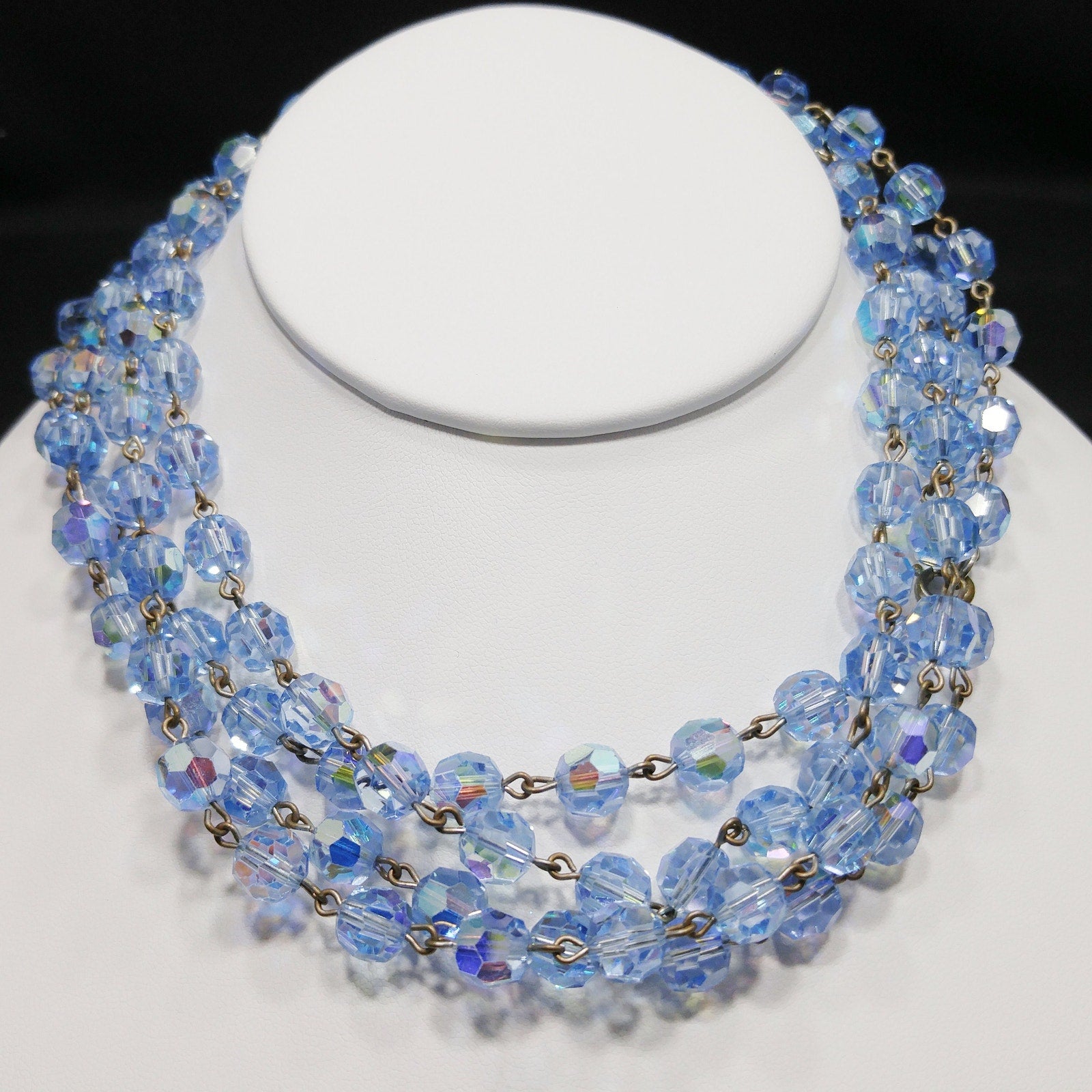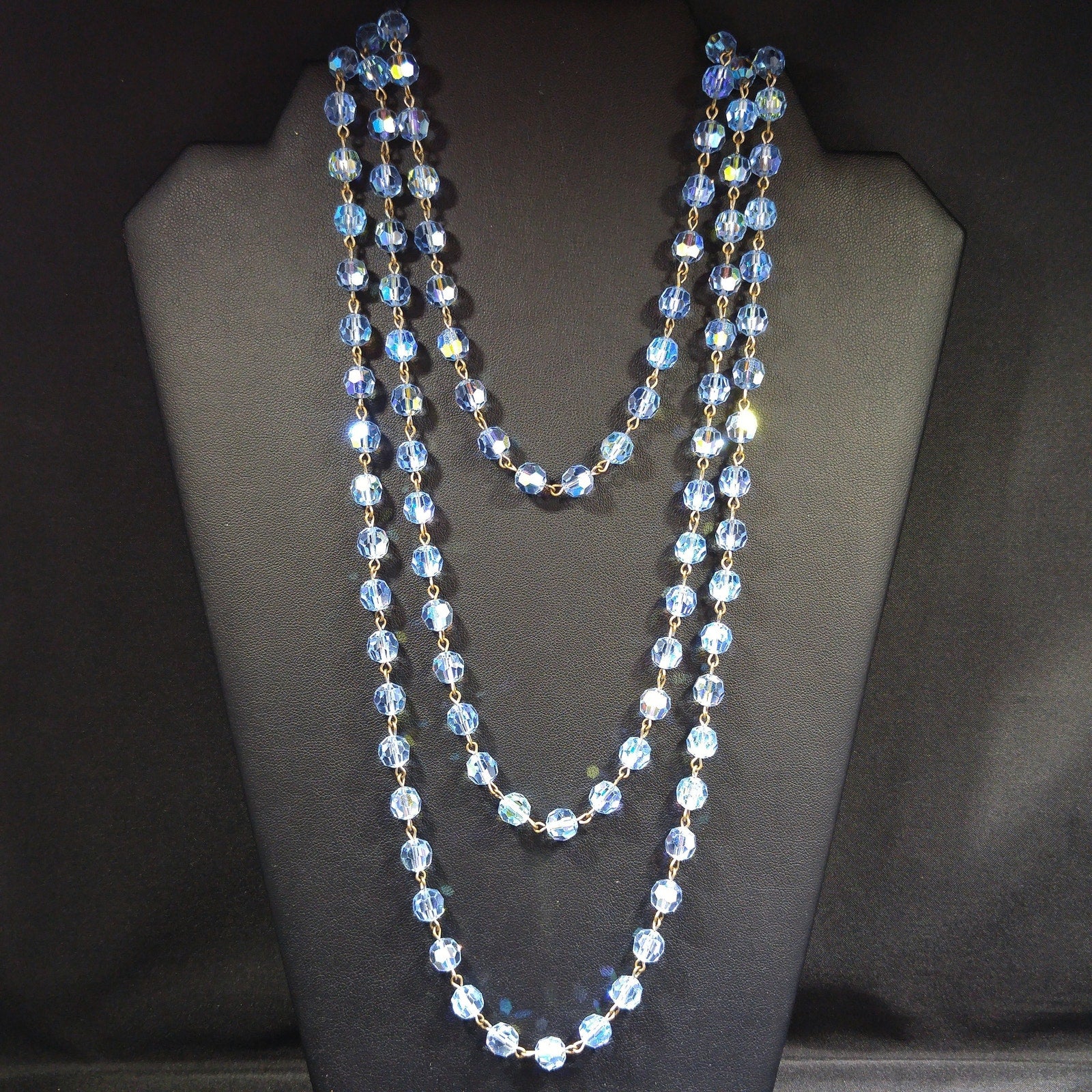 *Description: This is a beautiful light blue Austrian crystal, aurora borealis, long necklace with a spring ring clasp from the 1960s or late 1950s. The round faceted beads are 8mm and are strung using the rosary style design with each bead wire wrapped and connected to the next. The necklace is long at 60 inches and with the spring ring, it may be worn in many layers of your choice. This would be a great addition to your vintage jewelry collection or make a great vintage gift!