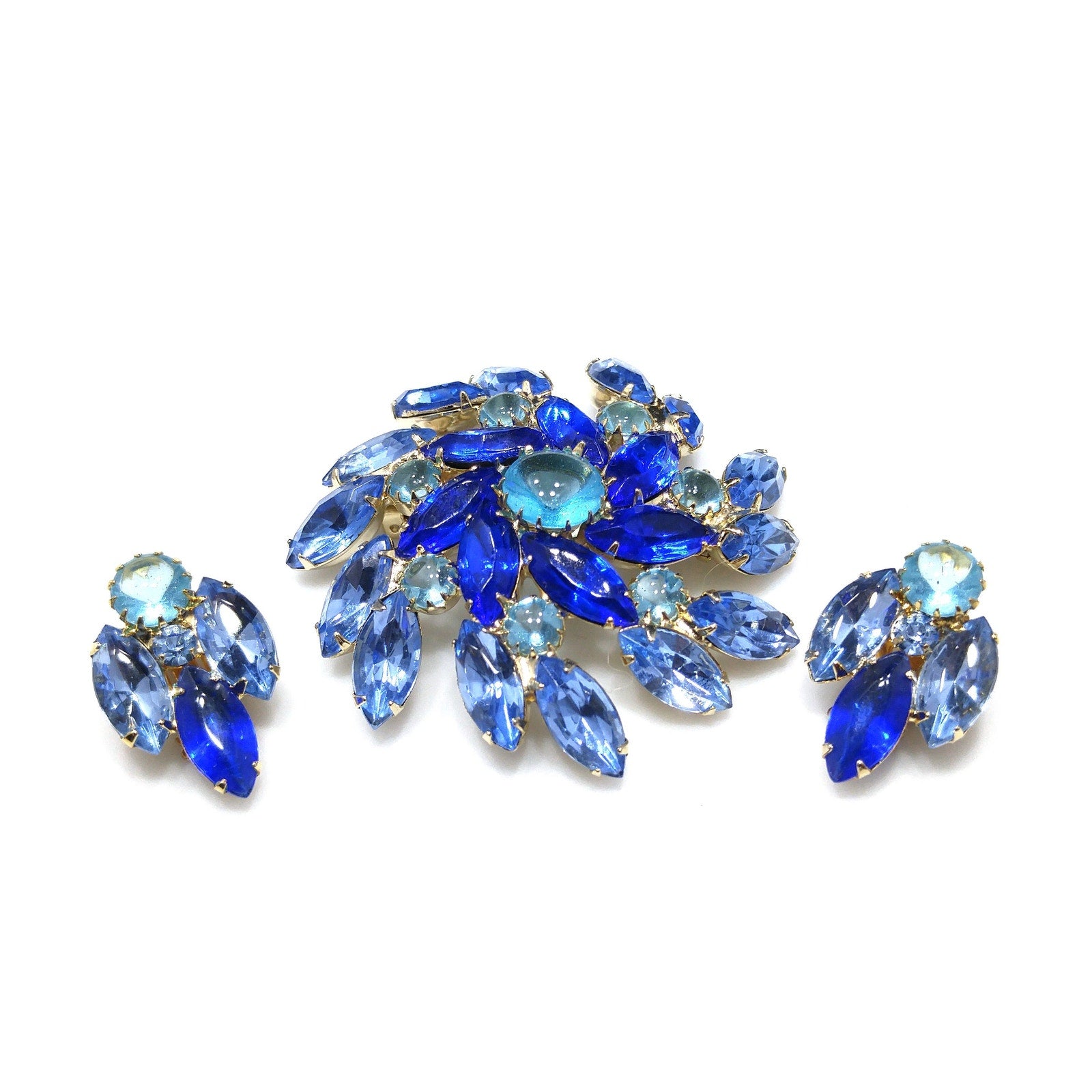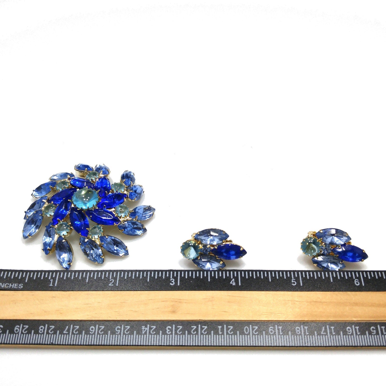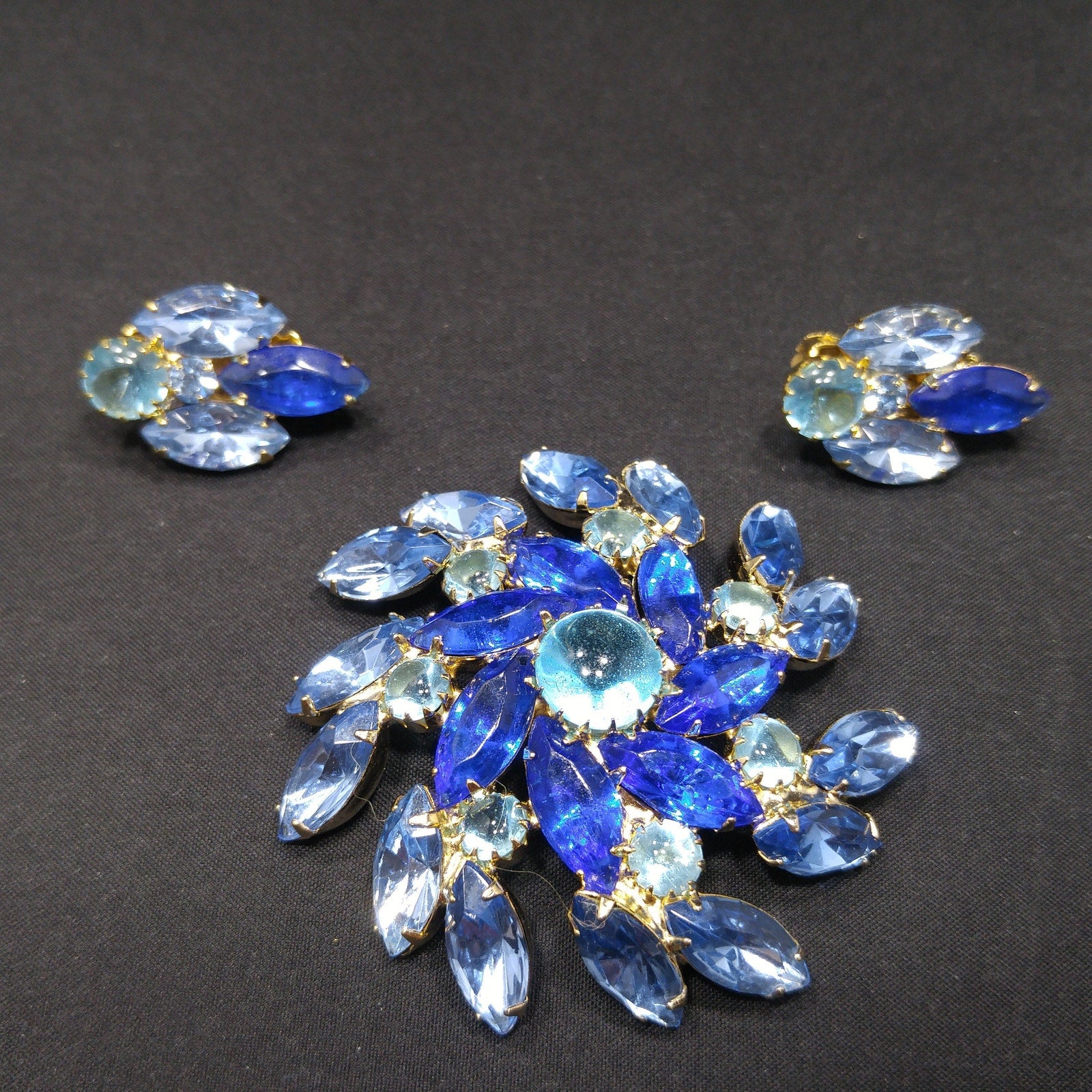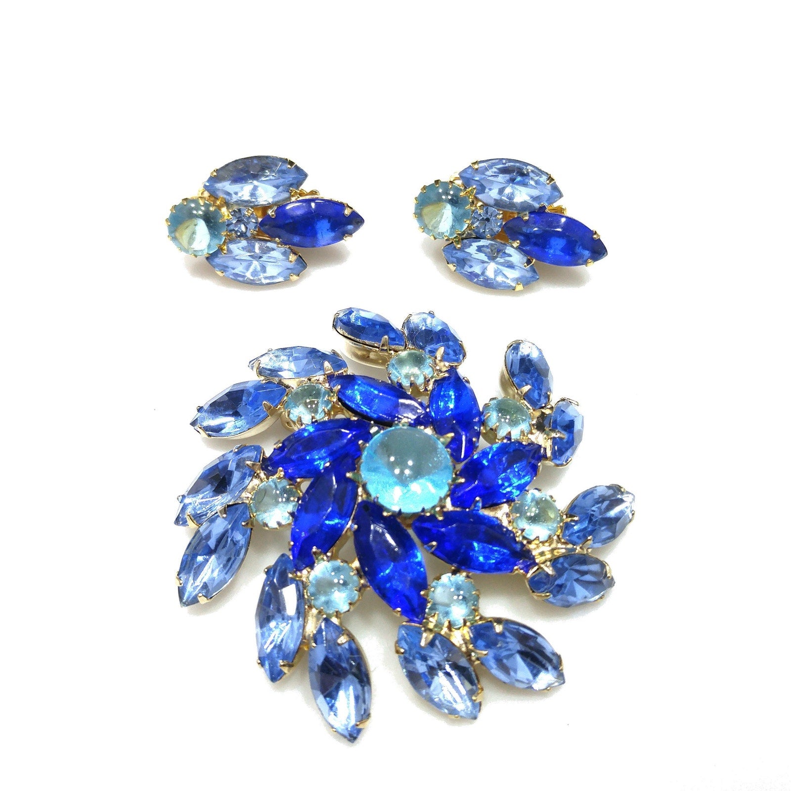 *Description: This is a beautiful light and darker blue pinwheel style brooch and matching earrings with open back rhinestones and gold plated construction from the 1960s. This beautiful vintage jewelry set would be a great addition to your vintage jewelry collection or make a great vintage gift!