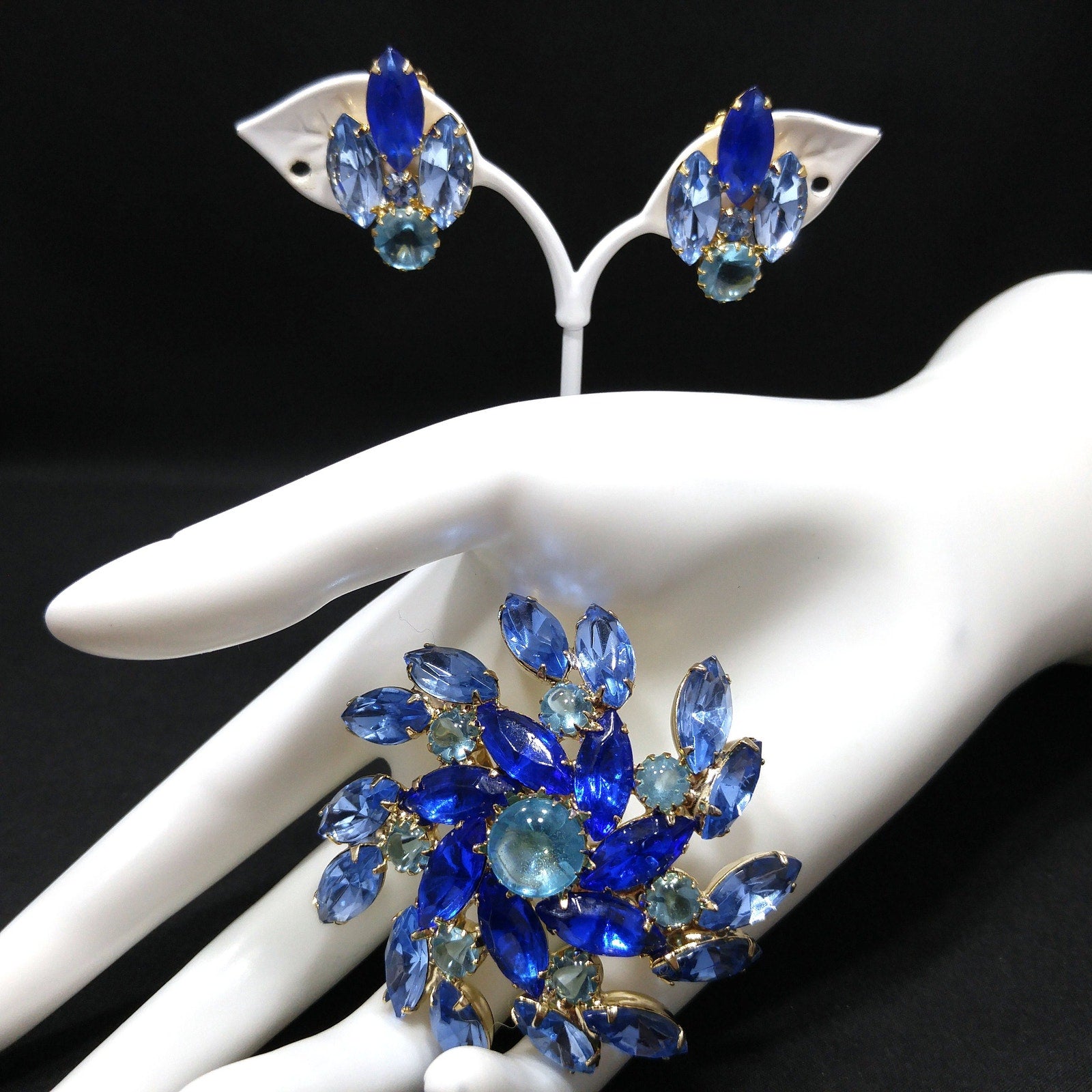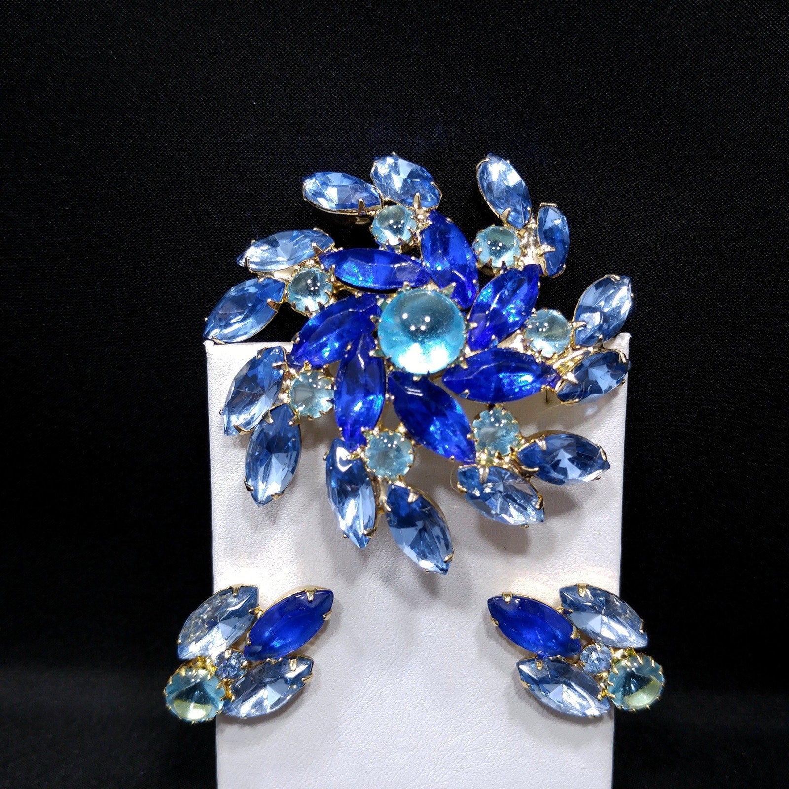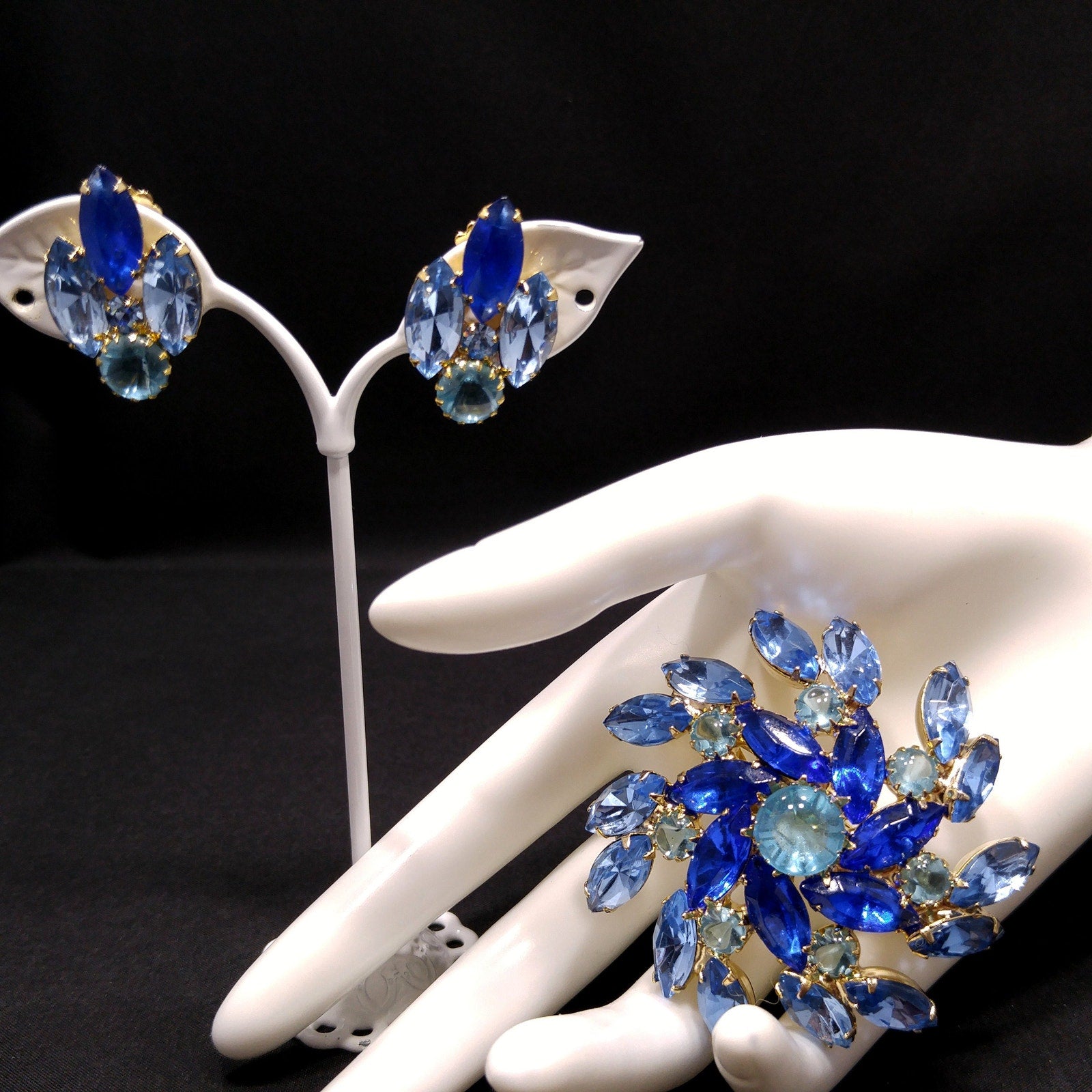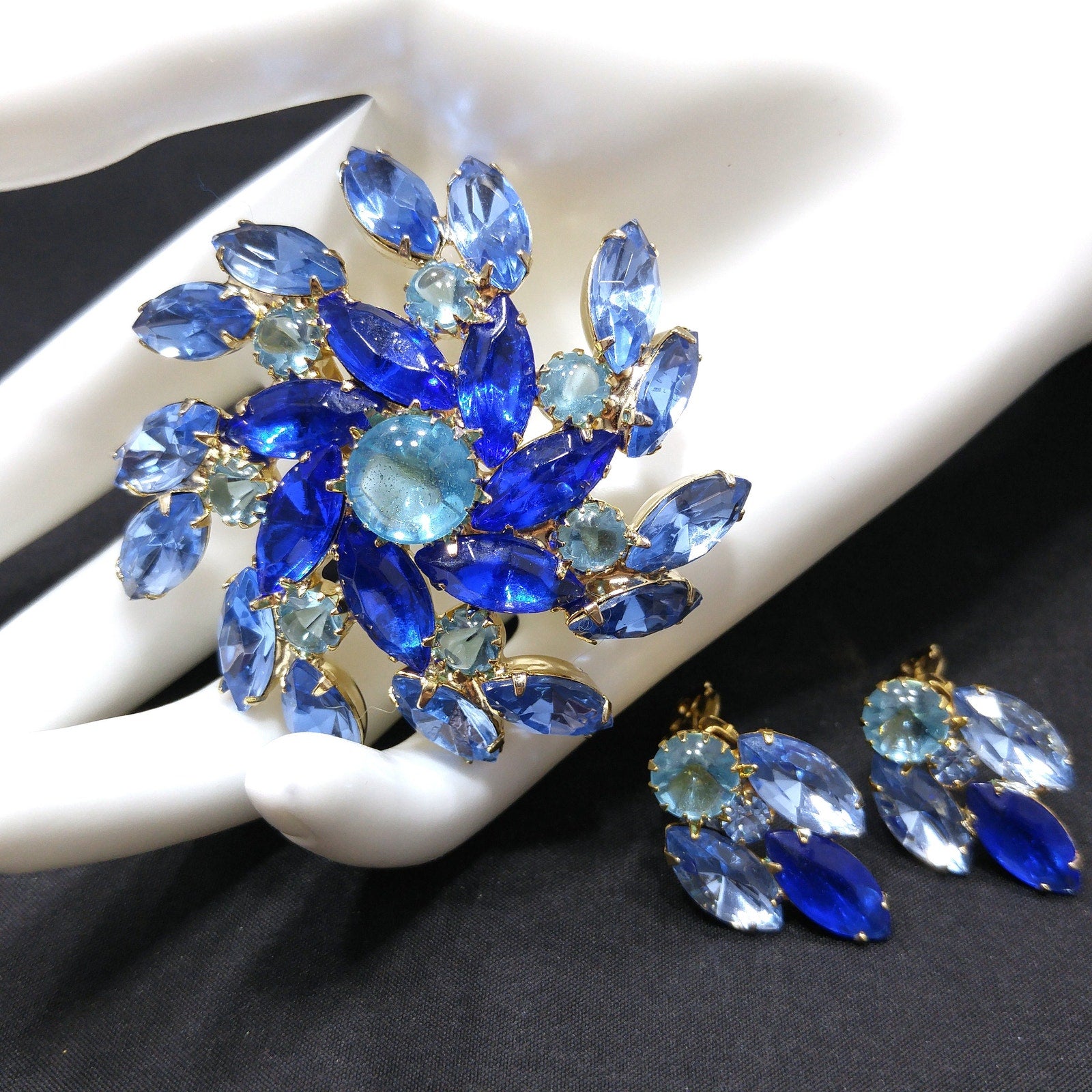 *Description: This is a beautiful light and darker blue pinwheel style brooch and matching earrings with open back rhinestones and gold plated construction from the 1960s. This beautiful vintage jewelry set would be a great addition to your vintage jewelry collection or make a great vintage gift!