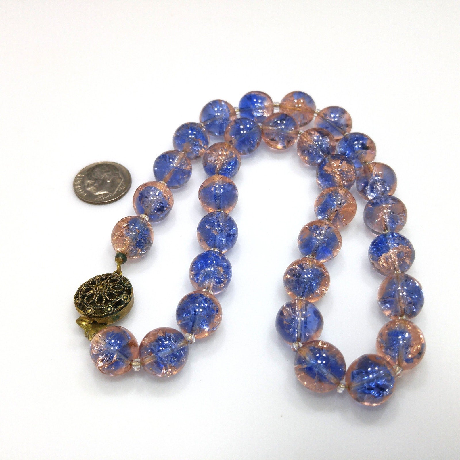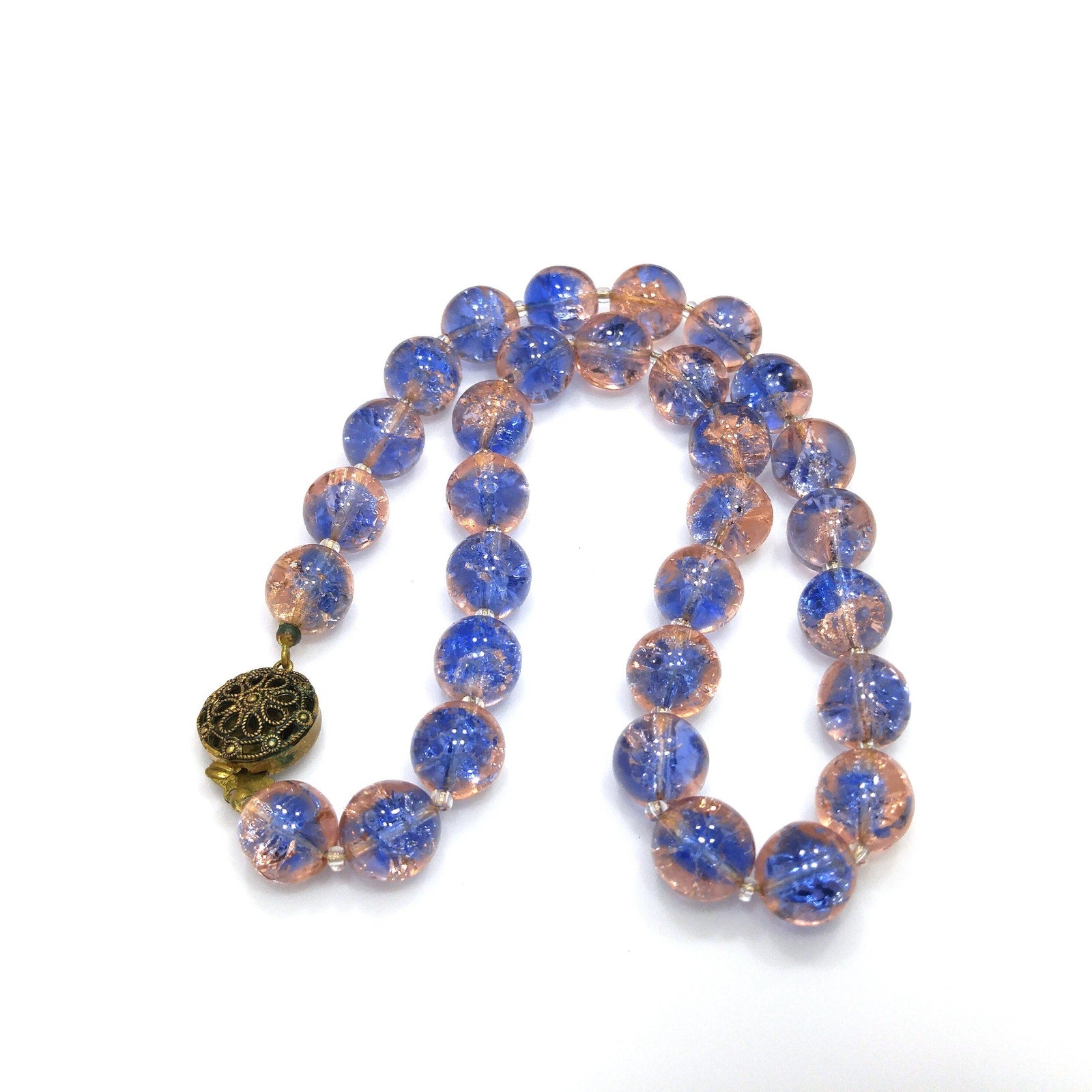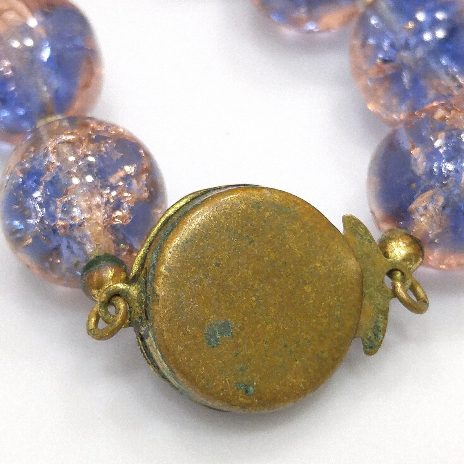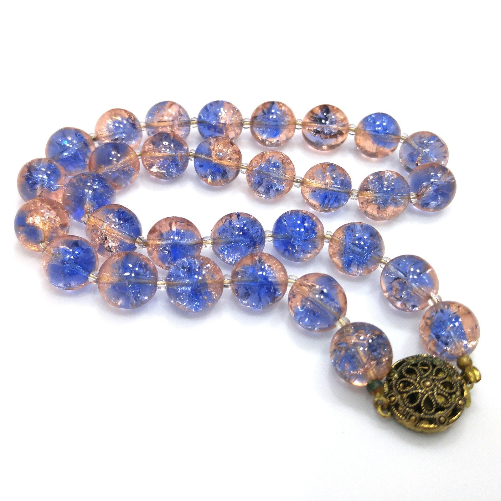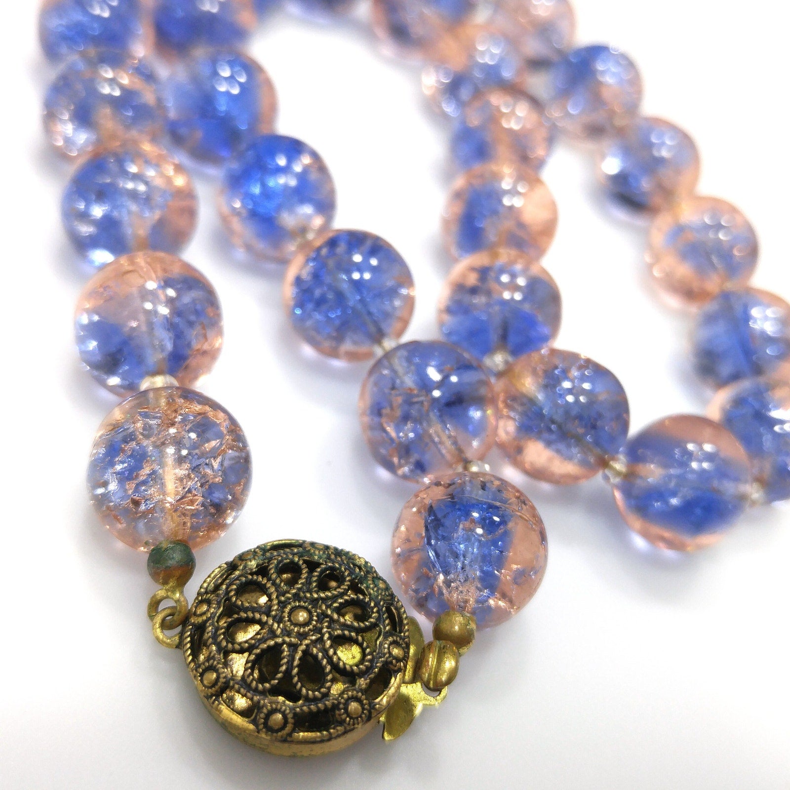 Blue Pink Crackle Glass Beaded Necklace, Filigree Brass Clasp, 1950s Vintage Jewelry