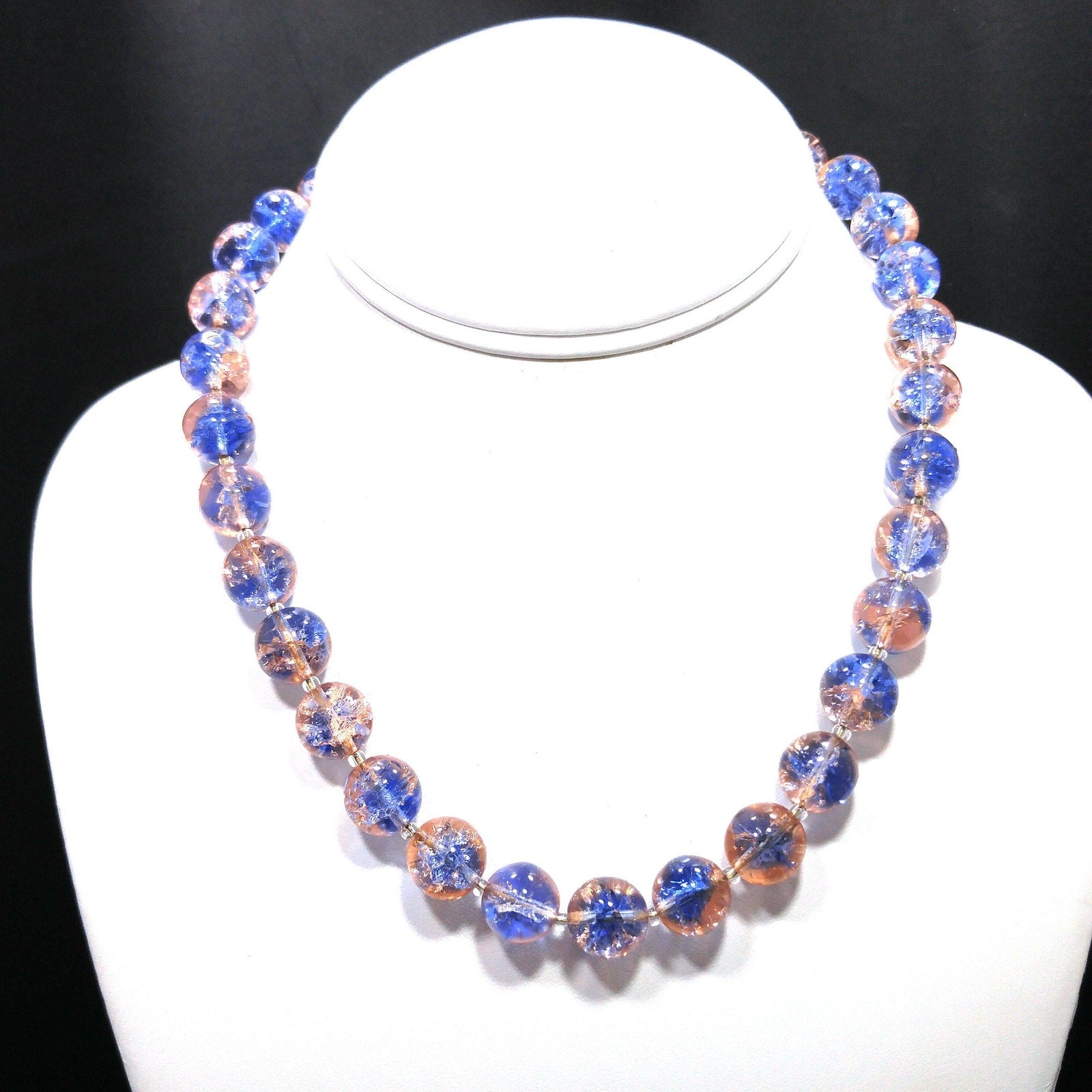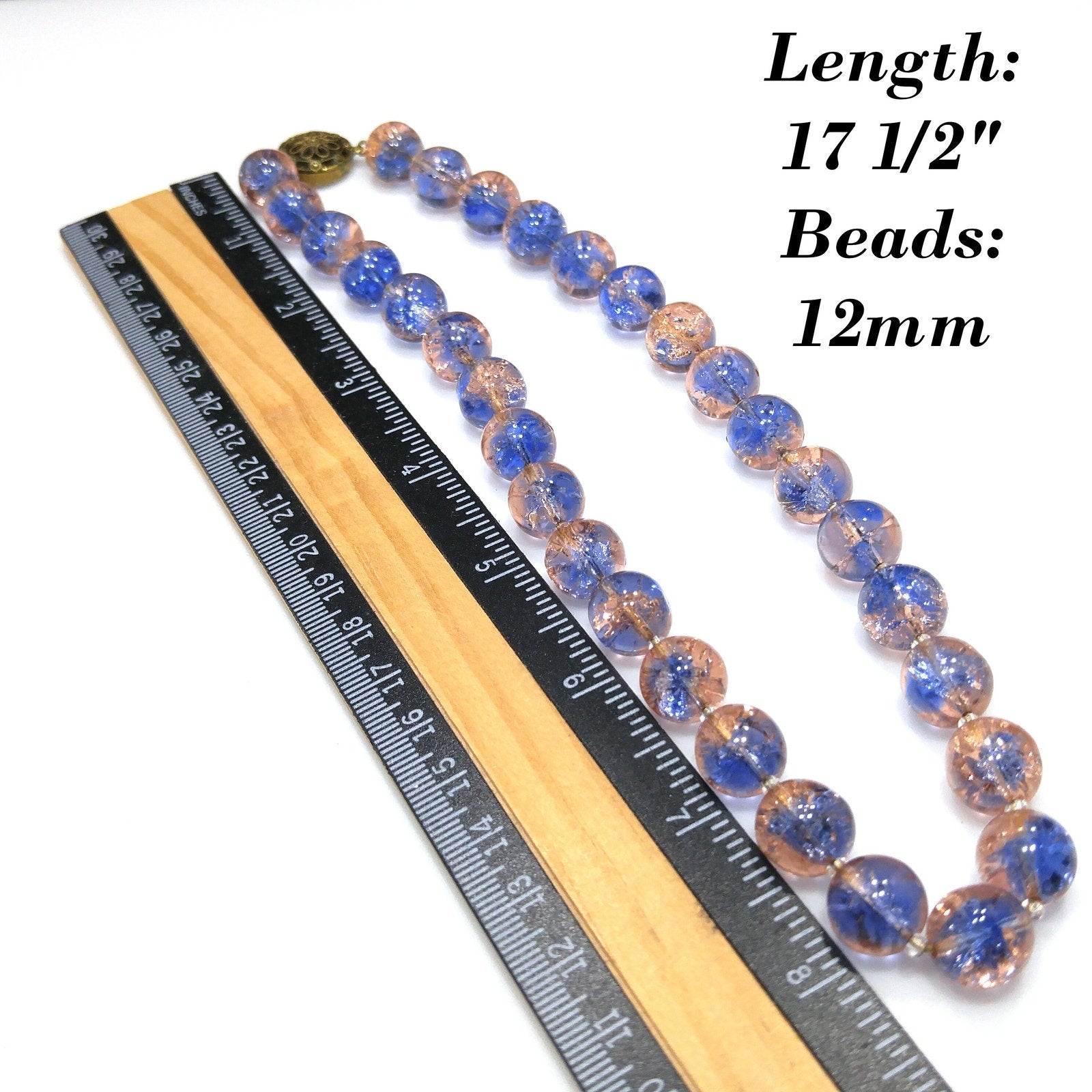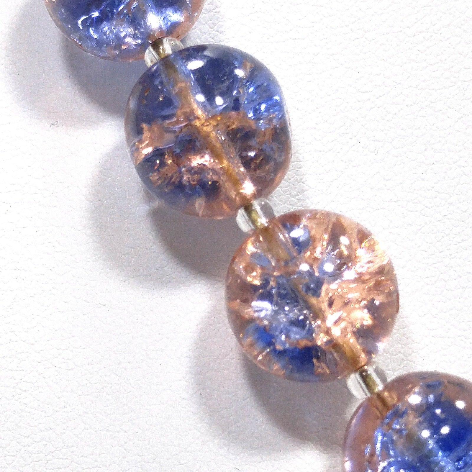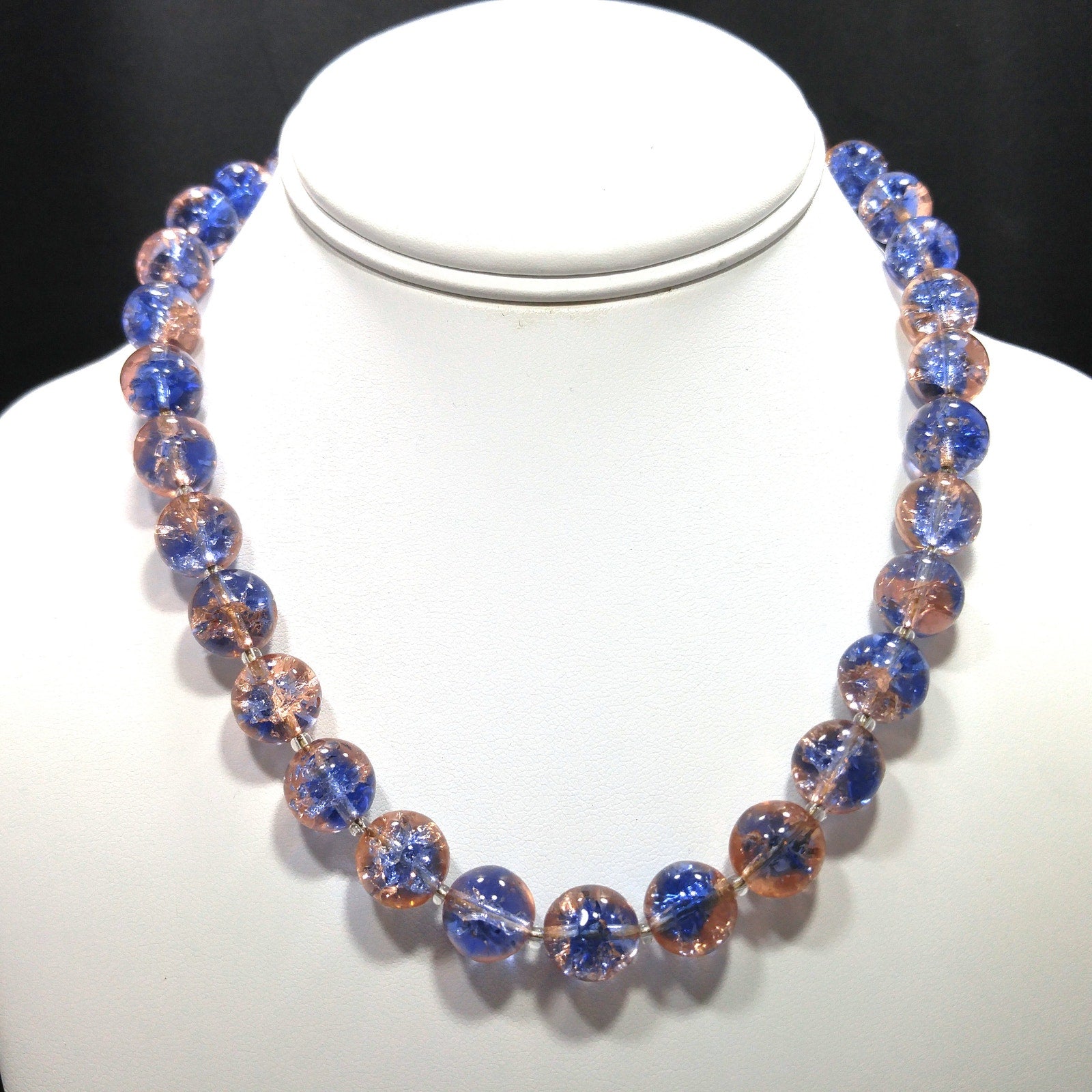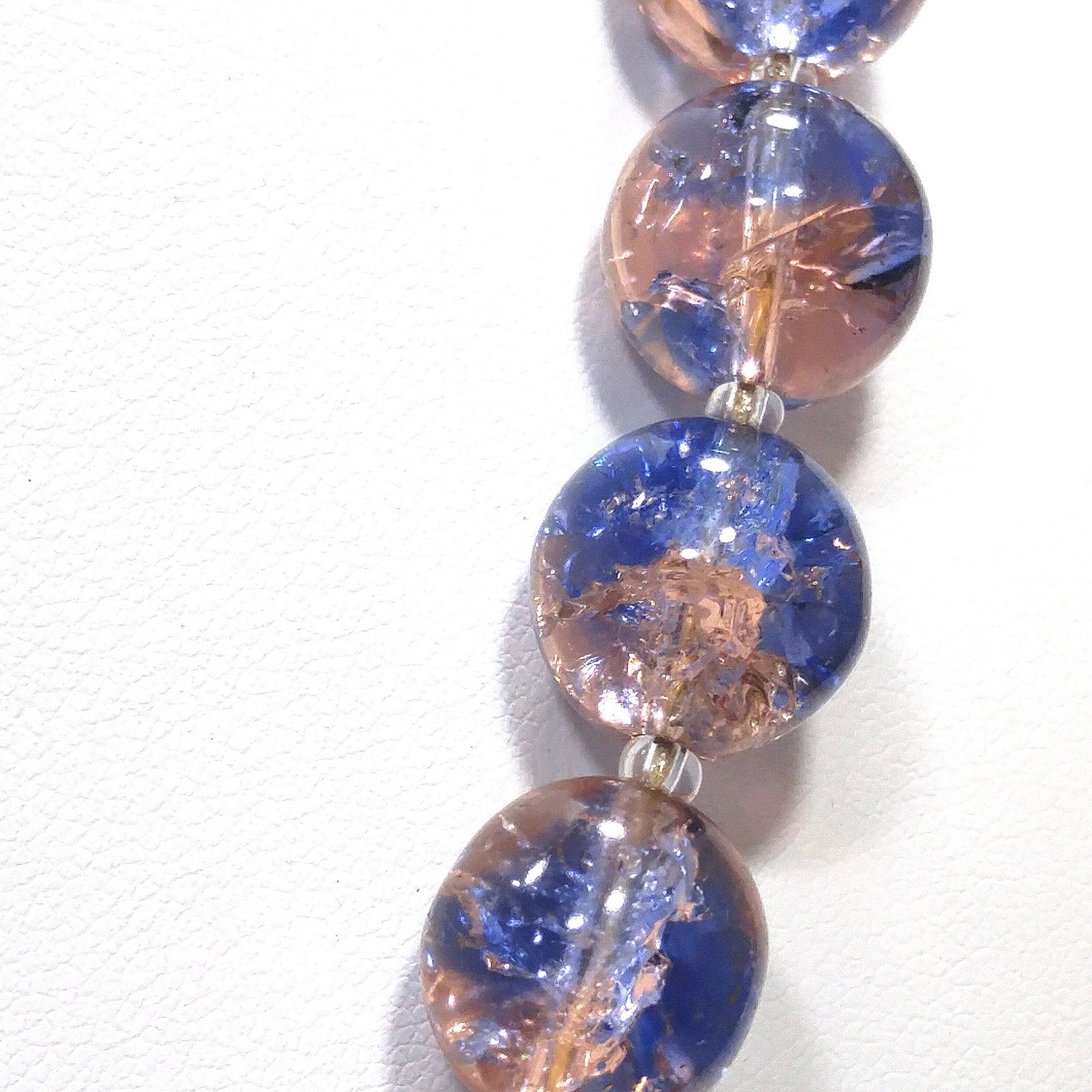 Blue Pink Crackle Glass Beaded Necklace, Filigree Brass Clasp, 1950s Vintage Jewelry