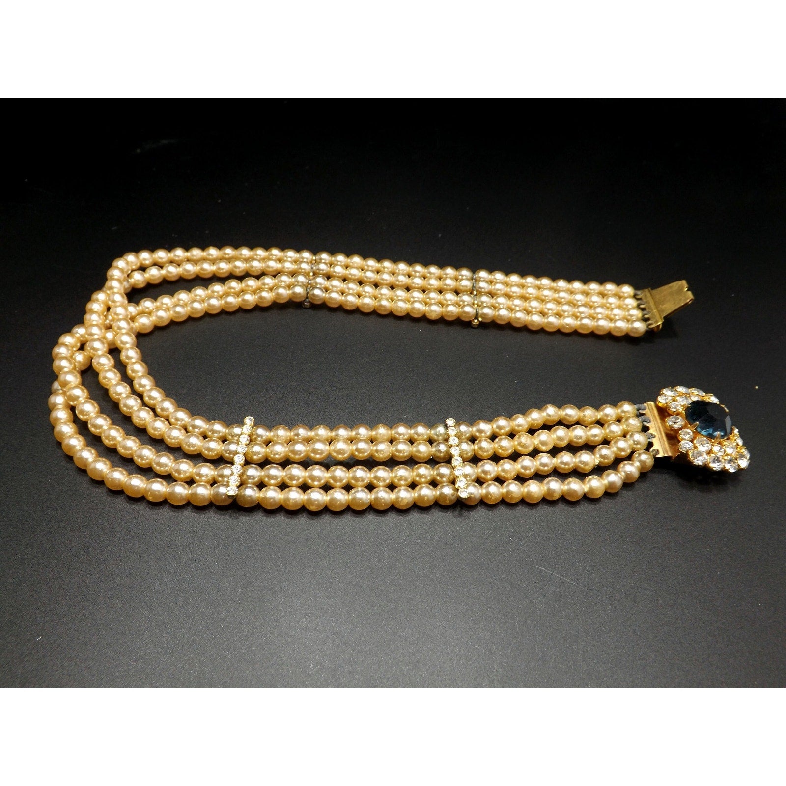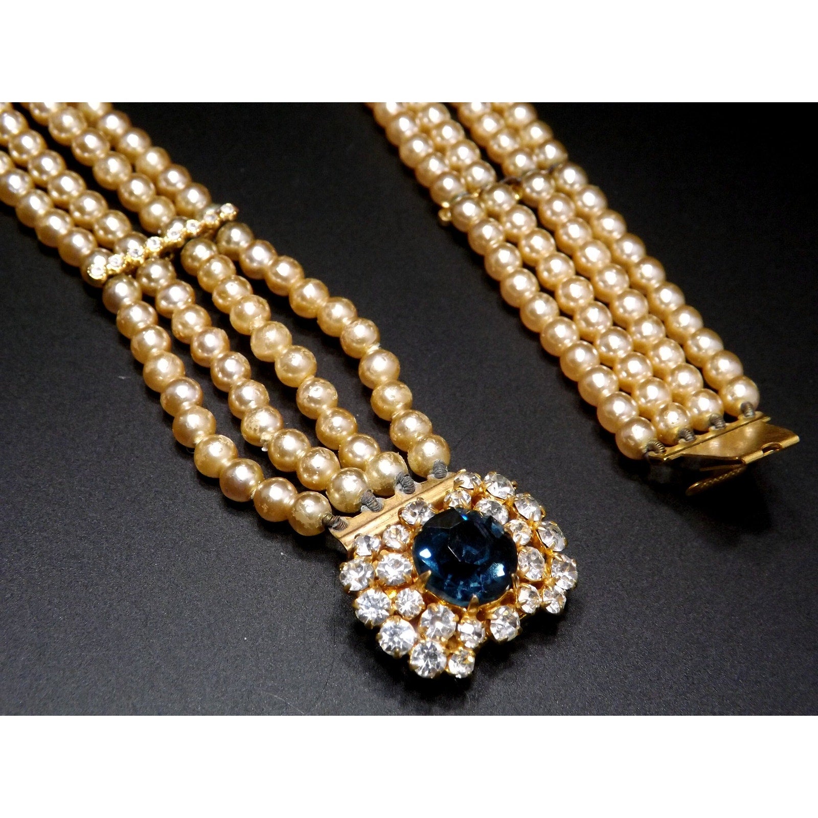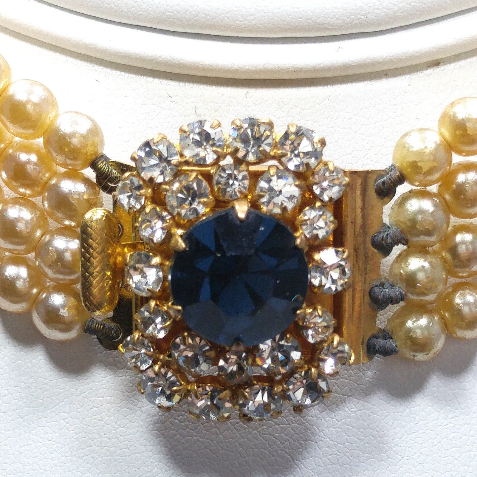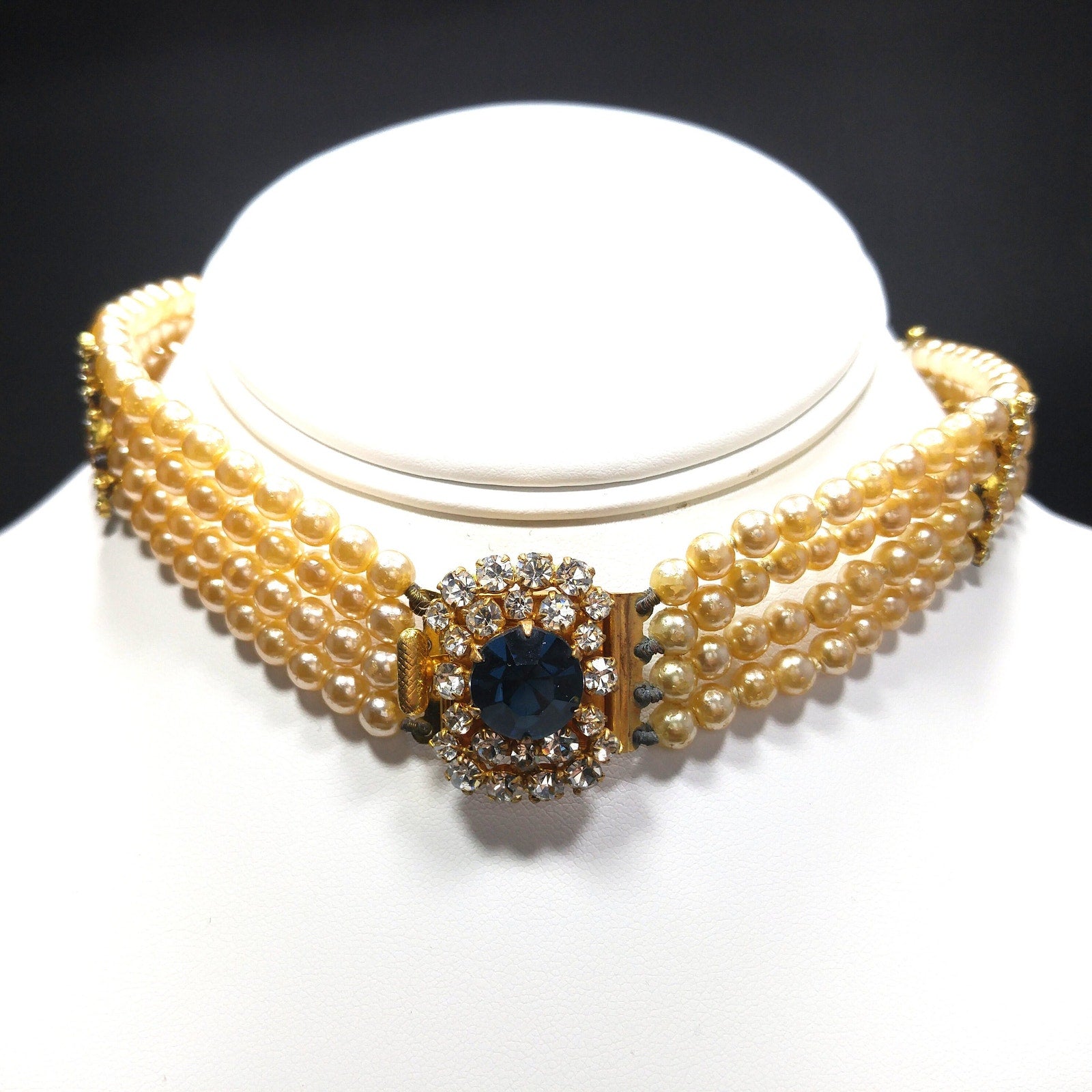 *Description: This is a beautiful vintage faux pearl collar necklace with a sapphire blue rhinestone clasp encircled in clear rhinestones from the 1950s. The necklace has four faux pearl strands with rhinestone stationary bars. The necklace is to be worn around the neck itself so it is only 14 inches in length. Please measure your neck prior to purchase as the length is not adjustable. The clasp is 1 inch in width and the rhinestones are full of sparkle. There is a little wear on the faux pearls around the clasp. See photos for details. It is a unique necklace and would be gorgeous for something blue and something old at a wedding. This would be a great addition to your vintage jewelry collection or make a great vintage gift!
