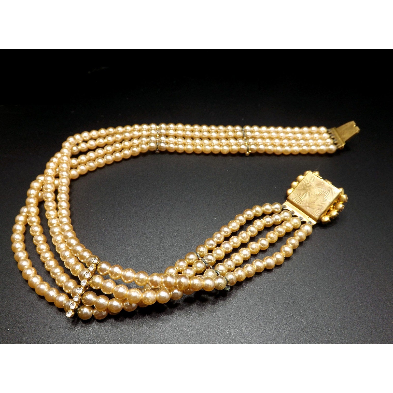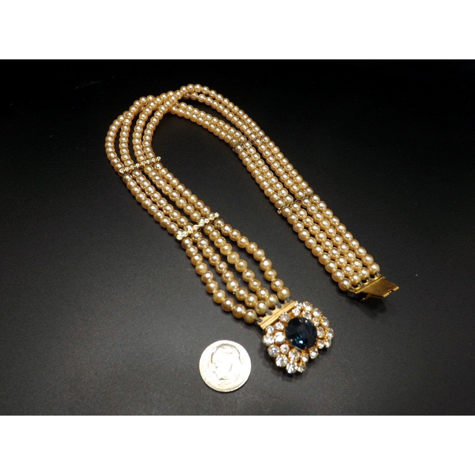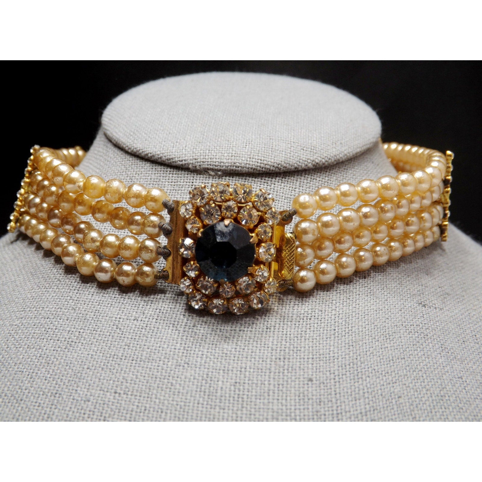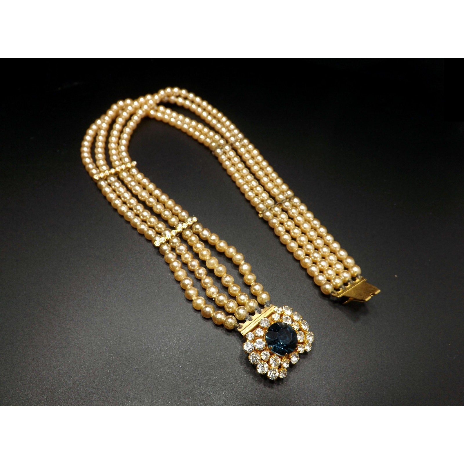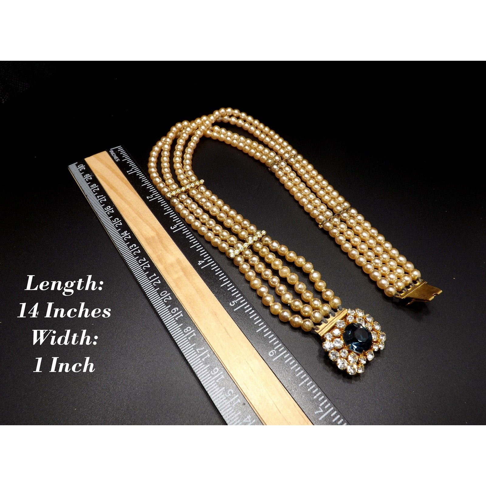 *Description: This is a beautiful vintage faux pearl collar necklace with a sapphire blue rhinestone clasp encircled in clear rhinestones from the 1950s. The necklace has four faux pearl strands with rhinestone stationary bars. The necklace is to be worn around the neck itself so it is only 14 inches in length. Please measure your neck prior to purchase as the length is not adjustable. The clasp is 1 inch in width and the rhinestones are full of sparkle. There is a little wear on the faux pearls around the clasp. See photos for details. It is a unique necklace and would be gorgeous for something blue and something old at a wedding. This would be a great addition to your vintage jewelry collection or make a great vintage gift!