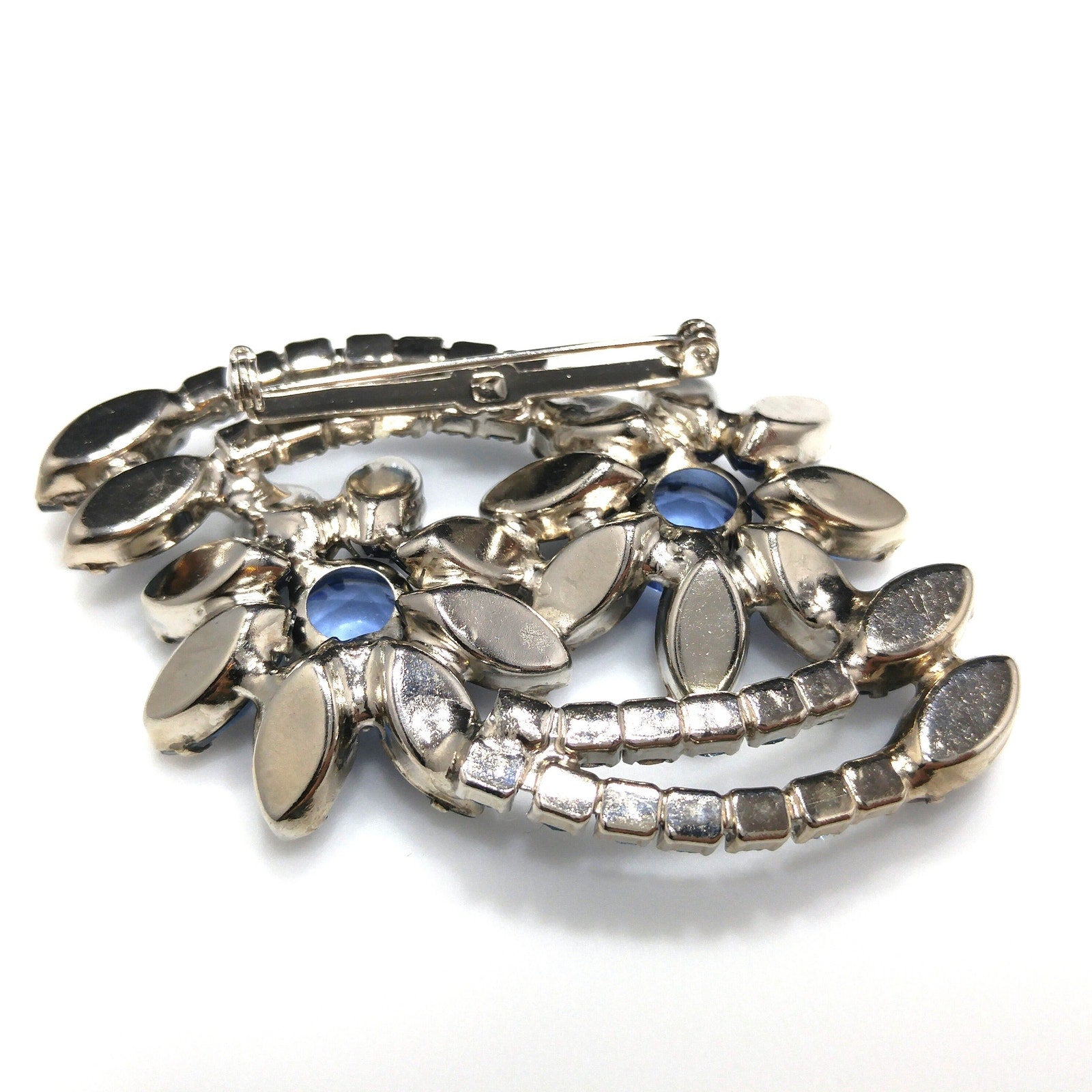 Blue Rhinestone Floral Brooch, Rhodium Plated, 1960s Vintage Jewelry